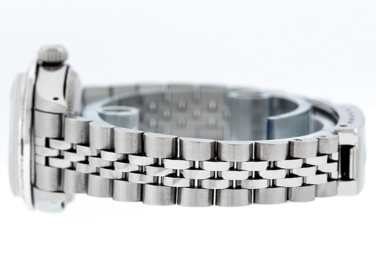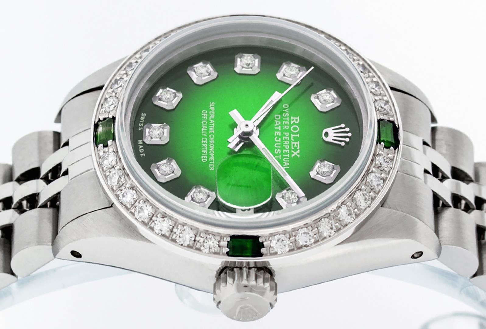 One Ladies Pre Owned Quickset Stainless Steel Rolex Datejust Polished Bright with Satin Finish, Serviced And Electronically Tested, Stainless Steel Case: 26mm, Stainless Steel Crown, Custom Bezel: New 18K White Gold Emerald Beadset Diamond Bezel, Diamond + Gem Count: 28 Diamonds + 4 Emeralds. Custom Crystal: New Sapphire With Date Window. Custom Hands: New Luminescent Hands. Rolex Movement: Automatic Winding Movement 2135. Custom Dial: Custom Green Vignette With Added Diamond Hour Markers. Diamond Count: 10 Diamonds On Dial. Date Window: 3 O'Clock Position Date Display, Model: Datejust. Condition: G-6 Extra Fine. Rolex Bracelet: Stainless Steel Jubilee Band. Bright Polish And Satin Finish. 6.0 Inch Length, Adjustable. Standard Clasp, With Rolex Logo. This Watch Has Been Serviced Time Tested And Is In Excellent Condition It Is Free Of All Scratches And Dents.