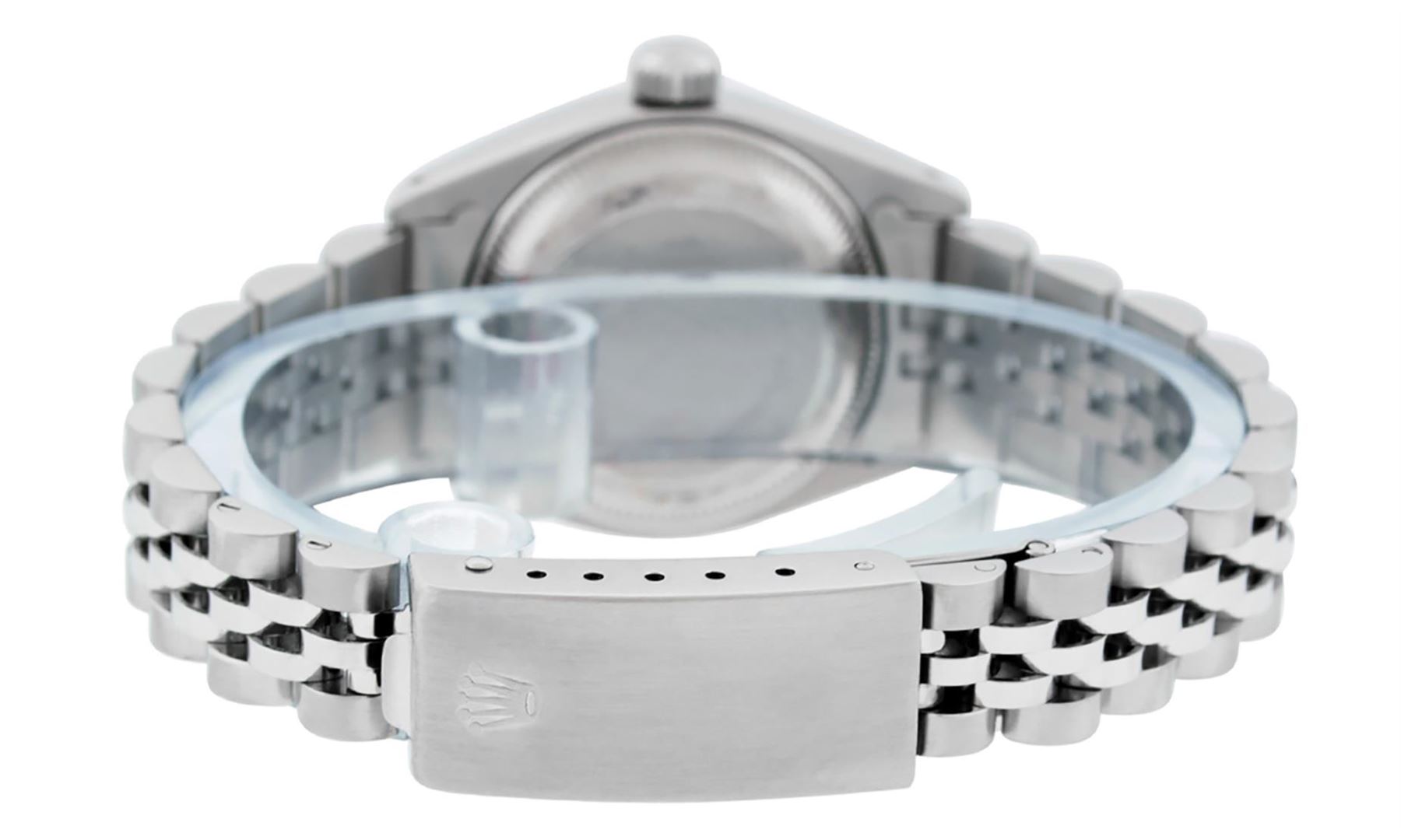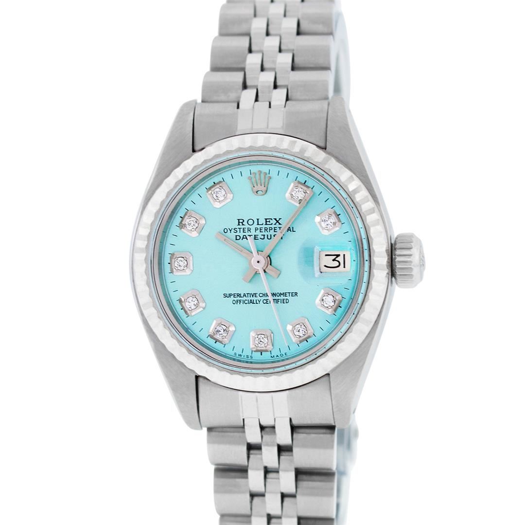 One Ladies Stainless Steel Rolex Datejust Polished Bright with Satin Finish, Serviced & Electronically Tested, Stainless Steel Case: 26mm, Stainless Steel Crown, Bezel: 14K White Gold Bezel. Custom Crystal: New Acrylic Cyclops Lens. Custom Hands: New Luminescent Hands. Movement: Automatic Winding Movement Caliber 2030. Dial: Ice Blue Diamond Dial, Diamond Count: 10 Diamonds In Dial, Color: G to H, Clarity: SI-VS. Date Window: 3 O'clock Position Date Display, Model: Datejust. Condition: G-6 Extra Fine. Bracelet: Stainless Steel Jubilee Band. Bright Polish & Satin Finish. 6.0 Inch Length, Adjustable. Standard Clasp, With Rolex Logo. This Watch Has Been Serviced Time Tested And Is In Excellent Condition It Is Free Of All Scratches And Dents.