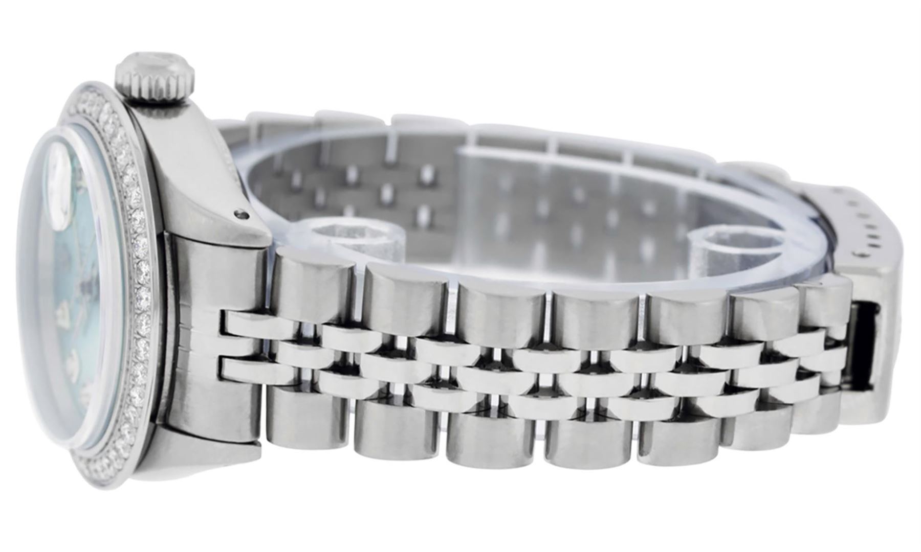 One Ladies Stainless Steel Rolex Datejust Polished Bright with Satin Finish, Serviced & Electronically Tested, Stainless Steel Case: 26mm, Stainless Steel Crown, Custom Bezel: New Stainless Steel Beadset Diamond Bezel, Diamond Count: 44 Diamonds, Total Weight .90 Carat, Clarity: SI-VS, Color: G to H. Custom Crystal: New Synthetic Sapphire Cyclops Lens. Custom Hands: New Luminescent Hands. Movement: Automatic Winding Movement Caliber 2030. Custom Dial: Refinished Ice Blue Diamond With Dash Track, Diamond Count: 10 Diamonds in Dial G To H In Color, Clarity: SI-VS. Date Window: 3 O'clock Position Date Display, Model: Datejust. Condition: G-6 Extra Fine. Bracelet: Stainless Steel Jubilee Band. Bright Polish & Satin Finish. 6.0 Inch Length, Adjustable. Standard Clasp, With Rolex Logo.