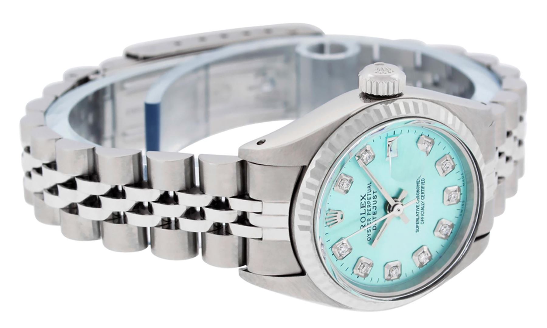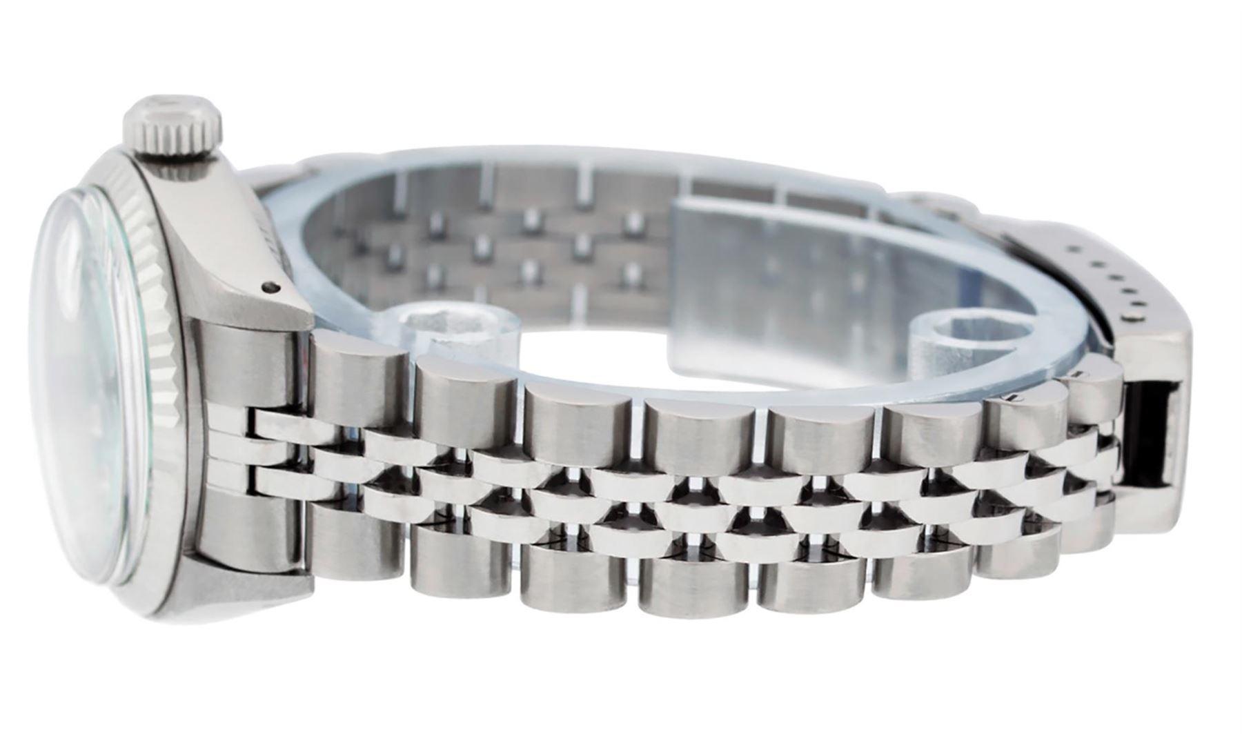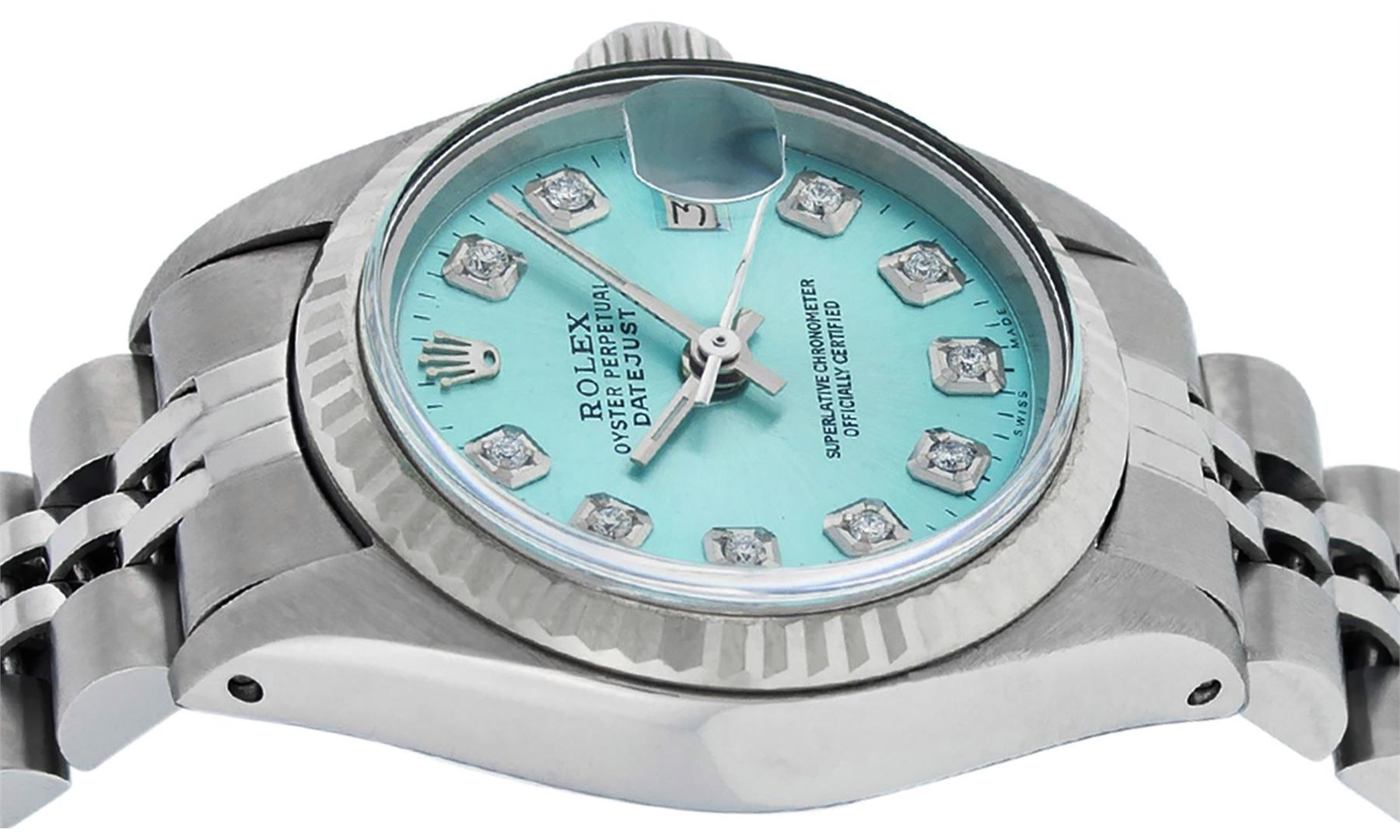 One Ladies Stainless Steel Rolex Datejust Polished Bright with Satin Finish, Serviced & Electronically Tested, Stainless Steel Case: 26mm, Stainless Steel Crown, Bezel: 14K White Gold Bezel. Custom Crystal: New Acrylic Cyclops Lens. Custom Hands: New Luminescent Hands. Movement: Automatic Winding Movement Caliber 2030. Dial: Ice Blue Diamond Dial, Diamond Count: 10 Diamonds In Dial, Color: G to H, Clarity: SI-VS. Date Window: 3 O'clock Position Date Display, Model: Datejust. Condition: G-6 Extra Fine. Bracelet: Stainless Steel Jubilee Band. Bright Polish & Satin Finish. 6.0 Inch Length, Adjustable. Standard Clasp, With Rolex Logo. This Watch Has Been Serviced Time Tested And Is In Excellent Condition It Is Free Of All Scratches And Dents.