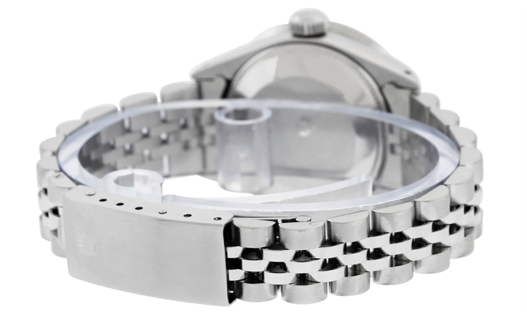 One Ladies Stainless Steel Rolex Datejust Polished Bright with Satin Finish, Serviced & Electronically Tested, Stainless Steel Case: 26mm, Stainless Steel Crown, Custom Bezel: New Stainless Steel Beadset Diamond Bezel, Diamond Count: 44 Diamonds, Total Weight .90 Carat, Clarity: SI-VS, Color: G to H. Custom Crystal: New Synthetic Sapphire Cyclops Lens. Custom Hands: New Luminescent Hands. Movement: Automatic Winding Movement Caliber 2030. Custom Dial: Refinished Ice Blue Diamond With Dash Track, Diamond Count: 10 Diamonds in Dial G To H In Color, Clarity: SI-VS. Date Window: 3 O'clock Position Date Display, Model: Datejust. Condition: G-6 Extra Fine. Bracelet: Stainless Steel Jubilee Band. Bright Polish & Satin Finish. 6.0 Inch Length, Adjustable. Standard Clasp, With Rolex Logo.