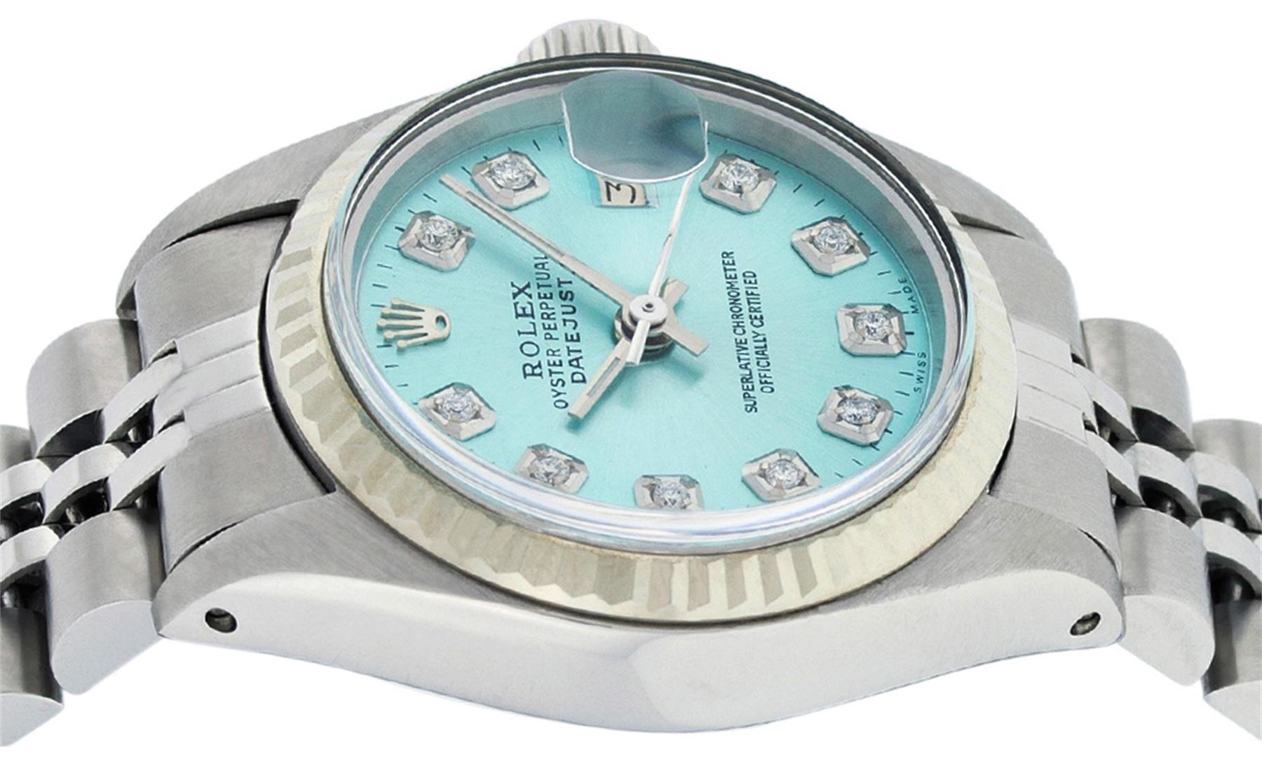 One Ladies Stainless Steel Rolex Datejust Polished Bright with Satin Finish, Serviced & Electronically Tested, Stainless Steel Case: 26mm, Stainless Steel Crown, Bezel: 14K White Gold Bezel. Custom Crystal: New Acrylic Cyclops Lens. Custom Hands: New Luminescent Hands. Movement: Automatic Winding Movement. Custom Dial: Ice Blue Diamond Dial, Diamond Count: 10 Diamonds In Dial, Color: G to H, Clarity: SI-VS. Date Window: 3 O'Clock Position Date Display, Model: Datejust. Condition: G-6 Extra Fine. Bracelet: Stainless Steel Jubilee Band. Bright Polish & Satin Finish. 6.0 Inch Length, Adjustable. Standard Clasp, With Rolex Logo. This Watch Has Been Serviced Time Tested And Is In Excellent Condition It Is Free Of All Scratches And Dents.