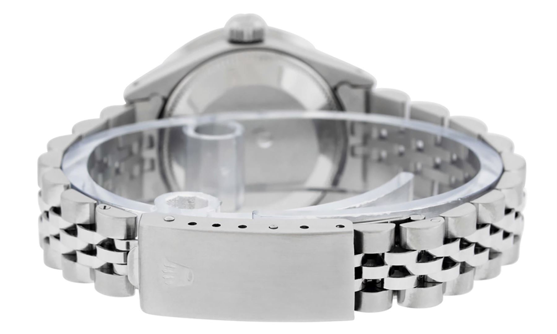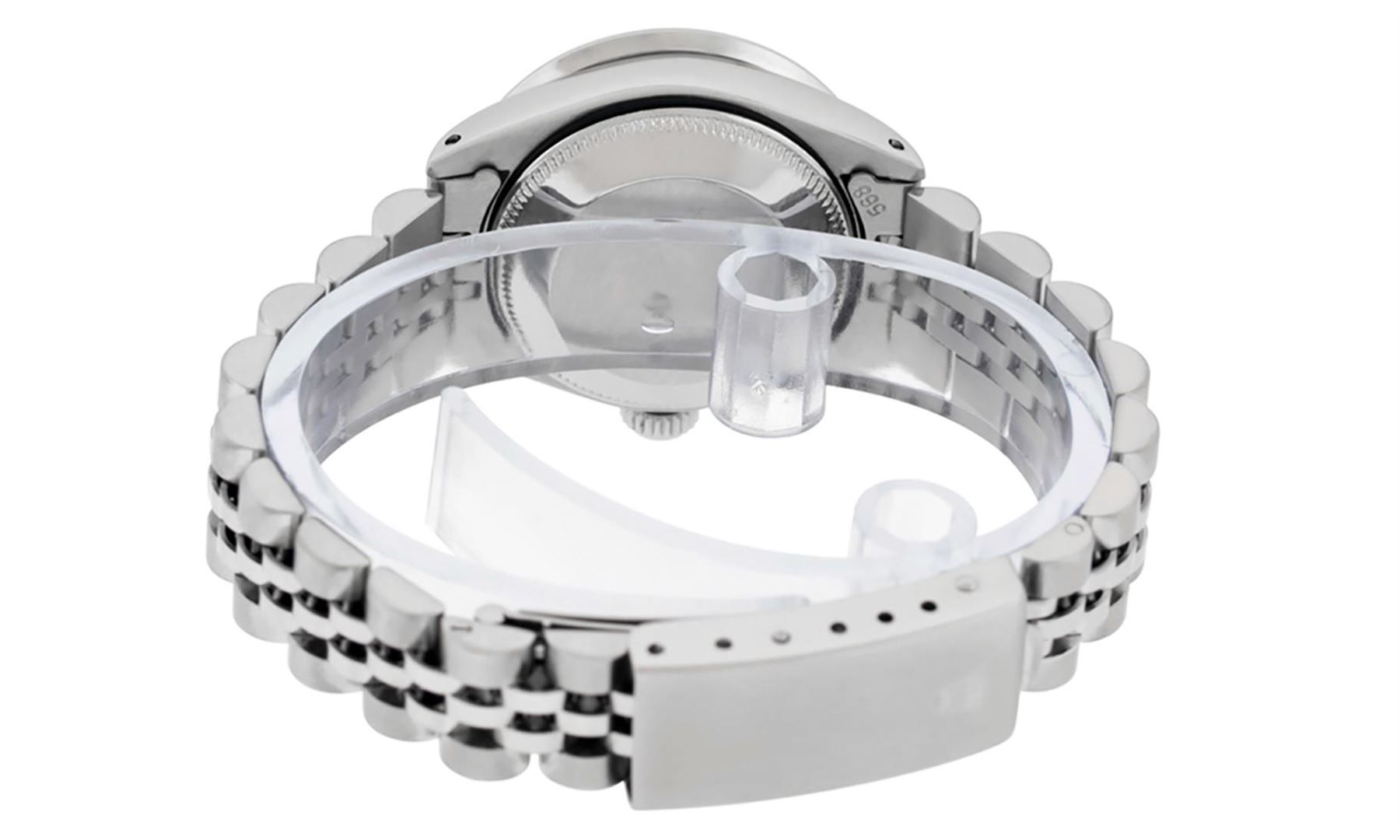 One Ladies Stainless Steel Rolex Datejust Polished Bright with Satin Finish, Serviced & Electronically Tested, Stainless Steel Case: 26mm, Stainless Steel Crown, Custom Bezel: New Stainless Steel Beadset Diamond Bezel, Diamond Count: 44 Diamonds, Total Weight .90 Carat, Clarity: SI-VS, Color: G to H. Custom Crystal: New Synthetic Sapphire Cyclops Lens. Custom Hands: New Luminescent Hands. Movement: Automatic Winding Movement . Custom Dial: Refinished Ice Blue Diamond With Dash Track, Diamond Count: 10 Diamonds in Dial G To H In Color, Clarity: SI-VS. Date Window: 3 O'Clock Position Date Display, Model: Datejust. Condition: G-6 Extra Fine. Bracelet: Stainless Steel Jubilee Band. Bright Polish & Satin Finish. 6.0 Inch Length, Adjustable. Standard Clasp, With Rolex Logo.