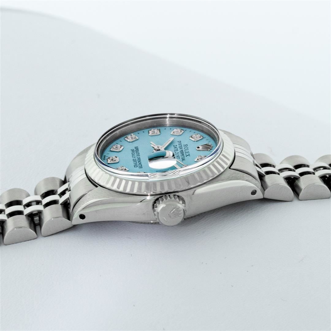 One Ladies Stainless Steel Rolex Datejust Polished Bright with Satin Finish, Serviced & Electronically Tested, Stainless Steel Case: 26mm, Stainless Steel Crown, Bezel: 14K White Gold Bezel. Custom Crystal: New Acrylic Cyclops Lens. Custom Hands: New Luminescent Hands. Movement: Automatic Winding Movement. Custom Dial: Ice Blue Diamond Dial, Diamond Count: 10 Diamonds In Dial, Color: G to H, Clarity: SI-VS. Date Window: 3 O'Clock Position Date Display, Model: Datejust. Condition: G-6 Extra Fine. Bracelet: Stainless Steel Jubilee Band. Bright Polish & Satin Finish. 6.0 Inch Length, Adjustable. Standard Clasp, With Rolex Logo. This Watch Has Been Serviced Time Tested And Is In Excellent Condition It Is Free Of All Scratches And Dents.