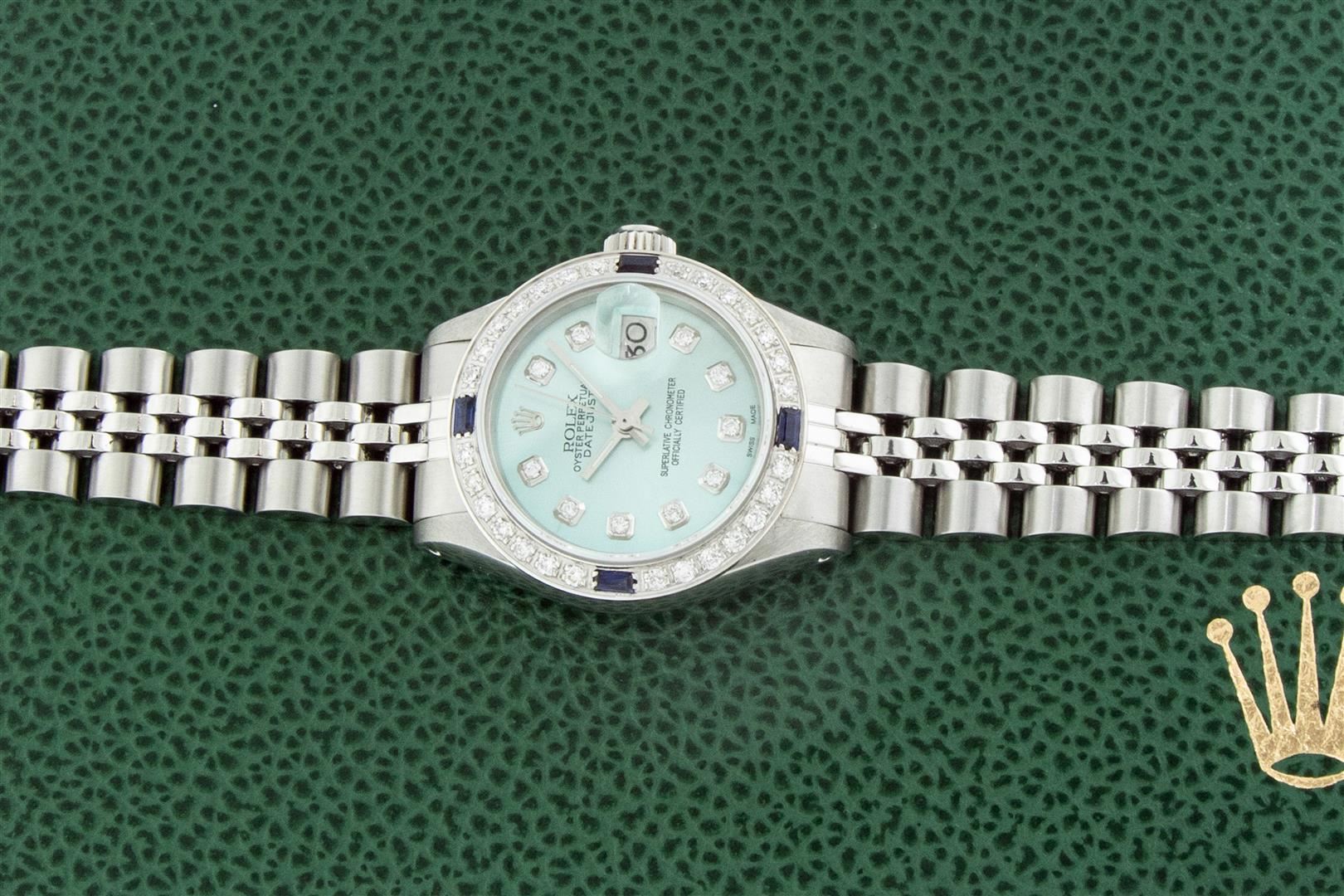One Ladies Stainless Steel Rolex Datejust Polished Bright with Satin Finish, Serviced & Electronically Tested, Rolex Stainless Steel Case: 26mm, Rolex Stainless Steel Crown, Custom Bezel: New 14K White Gold Bezel. Custom Crystal: New Acrylic Cyclops Lens. Custom Hands: New Luminescent Hands. Rolex Movement: Automatic Winding Movement. Dial: Refinished To Ice Blue With Added Diamonds, Diamond Count: 10 Diamonds In Dial, Color: G to H, Clarity: SI-VS. Date Window: 3 O'clock Position Date Display, Model: Datejust. Condition: G-6 Extra Fine. Rolex Bracelet: Stainless Steel Jubilee Band. Bright Polish & Satin Finish. 6.0 Inch Length, Adjustable. Standard Clasp, With Rolex Logo. This Pre Owned Watch Has Been Serviced Time Tested And Is In Excellent Condition It Is Free Of All Scratches And Dents. This Watch Comes With A Rolex Box. This Watch Comes With A Rolex Box.
