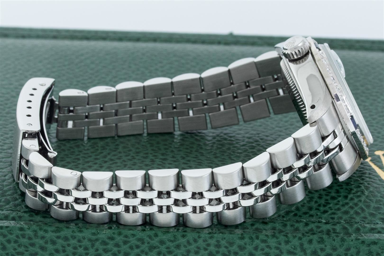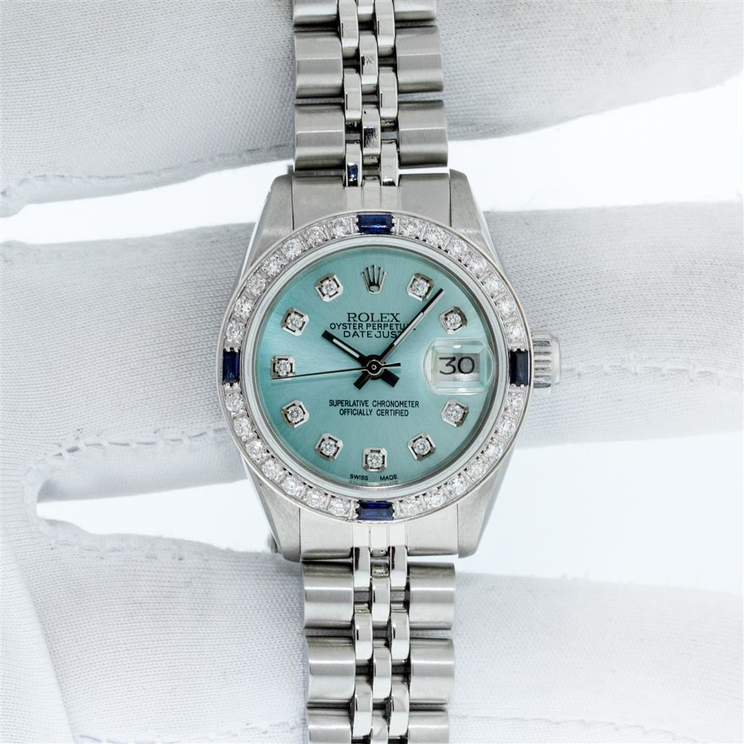 One Ladies Stainless Steel Rolex Datejust Polished Bright with Satin Finish, Serviced & Electronically Tested, Rolex Stainless Steel Case: 26mm, Rolex Stainless Steel Crown, Custom Bezel: New 14K White Gold Bezel. Custom Crystal: New Acrylic Cyclops Lens. Custom Hands: New Luminescent Hands. Rolex Movement: Automatic Winding Movement. Dial: Refinished To Ice Blue With Added Diamonds, Diamond Count: 10 Diamonds In Dial, Color: G to H, Clarity: SI-VS. Date Window: 3 O'clock Position Date Display, Model: Datejust. Condition: G-6 Extra Fine. Rolex Bracelet: Stainless Steel Jubilee Band. Bright Polish & Satin Finish. 6.0 Inch Length, Adjustable. Standard Clasp, With Rolex Logo. This Pre Owned Watch Has Been Serviced Time Tested And Is In Excellent Condition It Is Free Of All Scratches And Dents. This Watch Comes With A Rolex Box. This Watch Comes With A Rolex Box.