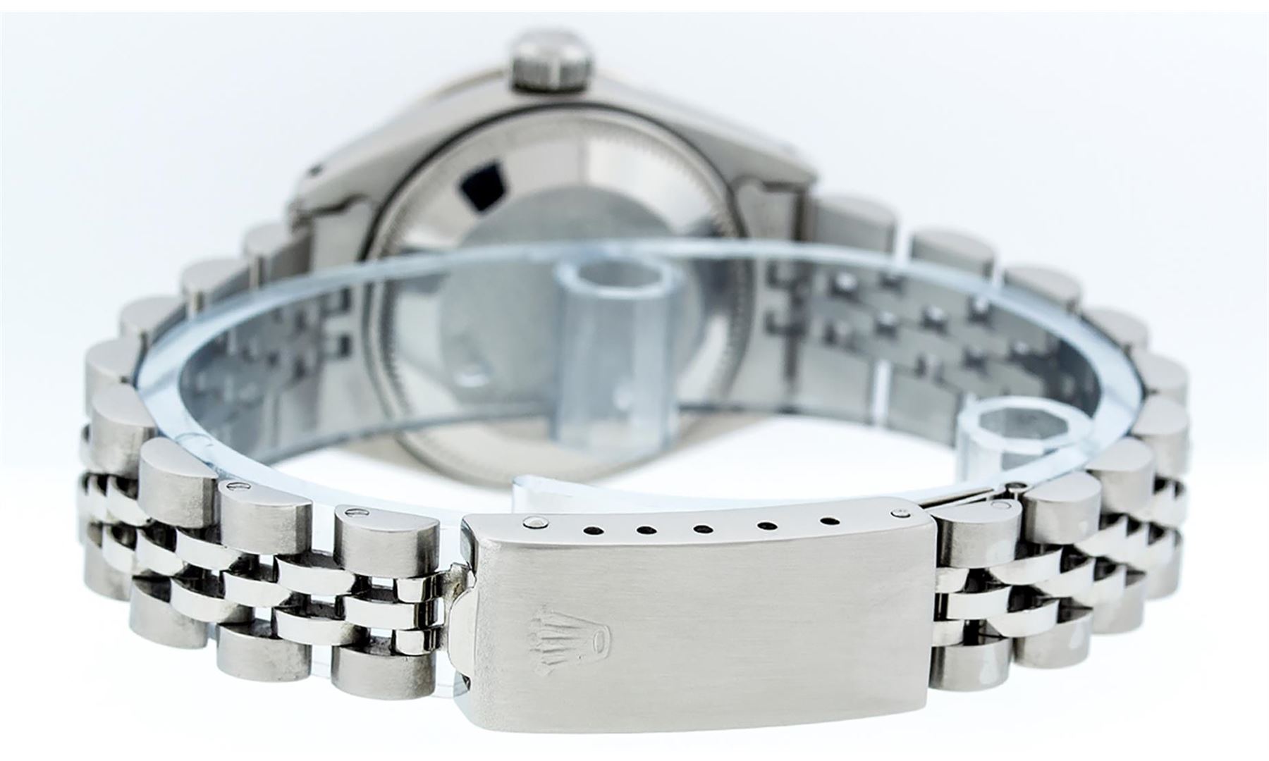 One Ladies Stainless Steel Rolex Datejust Polished Bright with Satin Finish, Serviced & Electronically Tested, Stainless Steel Case: 26mm, Stainless Steel Crown, Custom Bezel: New 18K White Gold Sapphire Beadset Diamond Bezel, Diamond + Gem Count: 28 Diamonds + 4 Sapphires, Total Weight .70 Carat, Clarity: SI-VS, Color: G to H. Custom Crystal: New Synthetic Sapphire Cyclops Lens. Custom Hands: New Luminescent Hands. Movement: Automatic Winding Movement Caliber 2030. Custom Dial: Refinished Ice Blue With Diamond Hour Markers And Dash Track, 10 Diamond in Dial, G To H In Color, Clarity: SI-VS. Date Window: 3 O'Clock Position Date Display, Model: Datejust. Condition: G-6 Extra Fine. Bracelet: Stainless Steel Jubilee. Bright Polish & Satin Finish. 6.0 Inch Length, Adjustable. Standard Clasp, With Rolex Logo. This Watch Has Been Serviced Time Tested And Is In Excellent Condition It Is Free Of All Scratches And Dents.