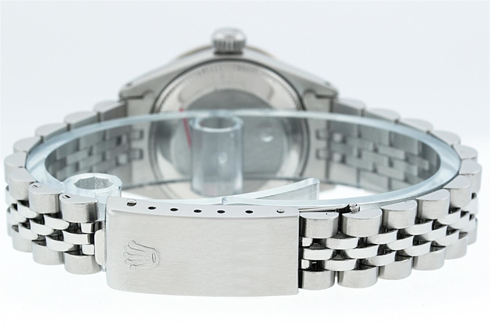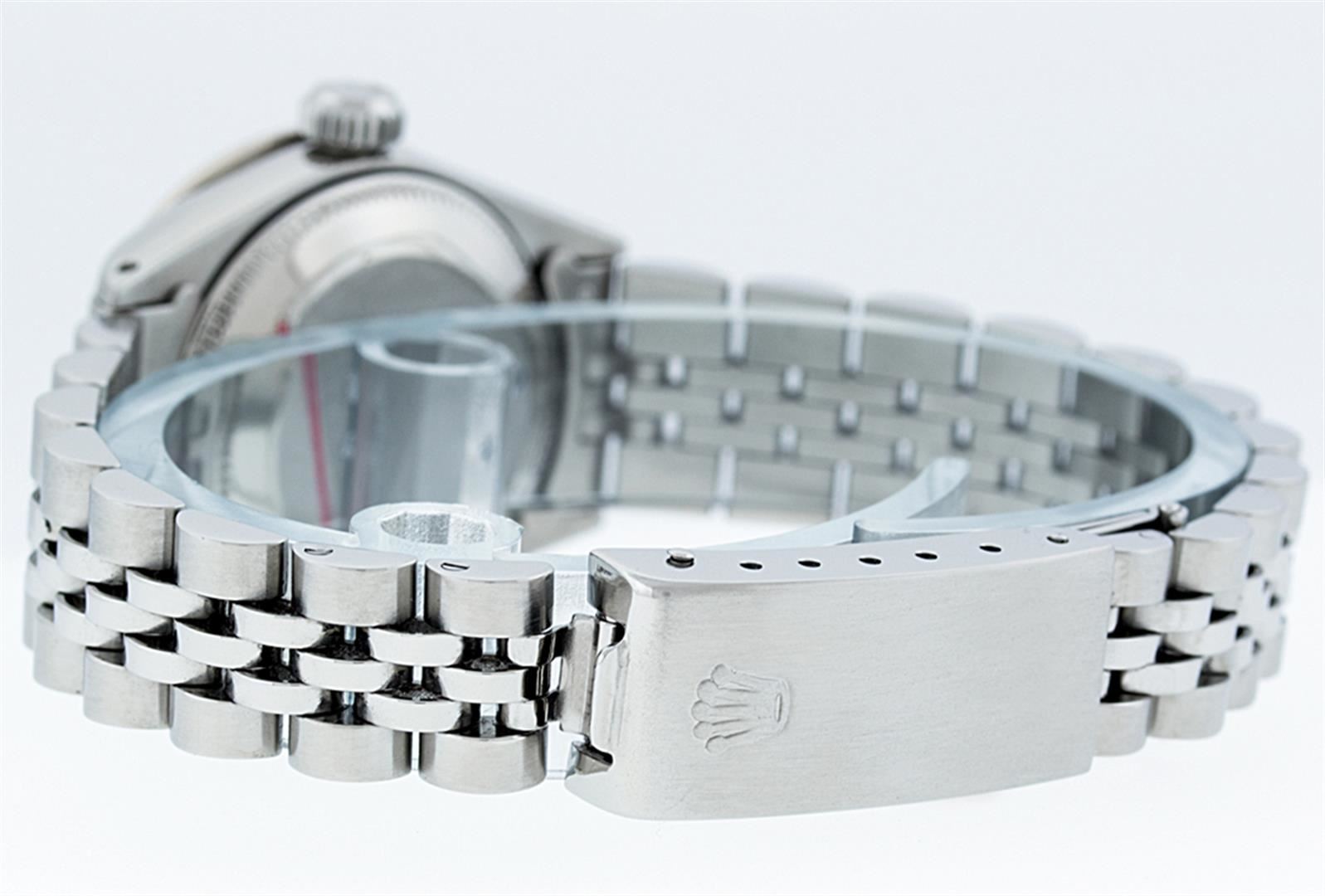 One Ladies Stainless Steel Rolex Datejust Polished Bright with Satin Finish, Serviced & Electronically Tested, Stainless Steel Case: 26mm, Stainless Steel Crown, Custom Bezel: New 18K White Gold Sapphire Beadset Diamond Bezel, Diamond + Gem Count: 28 Diamonds + 4 Sapphires, Total Weight .70 Carat, Clarity: SI-VS, Color: G to H. Custom Crystal: New Synthetic Sapphire Cyclops Lens. Custom Hands: New Luminescent Hands. Movement: Automatic Winding Movement Caliber 2030. Custom Dial: Ice Blue Roman Dial. Date Window: 3 O'Clock Position Date Display, Model: Datejust. Condition: G-6 Extra Fine. Bracelet: Stainless Steel Jubilee. Bright Polish & Satin Finish. 6.0 Inch Length, Adjustable. Standard Clasp, With Rolex Logo. This Watch Has Been Serviced Time Tested And Is In Excellent Condition It Is Free Of All Scratches And Dents.