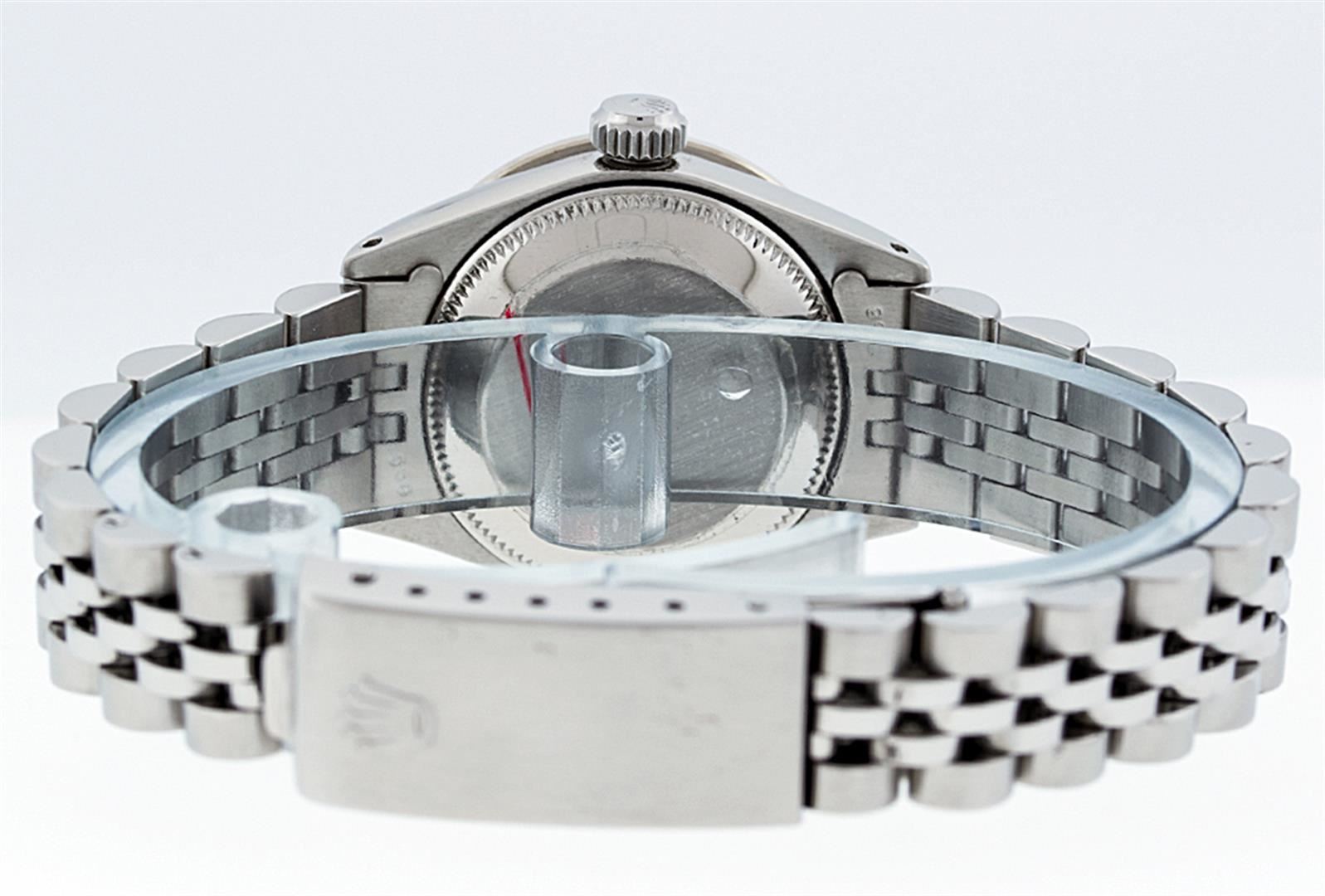 One Ladies Stainless Steel Rolex Datejust Polished Bright with Satin Finish, Serviced & Electronically Tested, Stainless Steel Case: 26mm, Stainless Steel Crown, Custom Bezel: New 18K White Gold Sapphire Beadset Diamond Bezel, Diamond + Gem Count: 28 Diamonds + 4 Sapphires, Total Weight .70 Carat, Clarity: SI-VS, Color: G to H. Custom Crystal: New Synthetic Sapphire Cyclops Lens. Custom Hands: New Luminescent Hands. Movement: Automatic Winding Movement Caliber 2030. Custom Dial: Ice Blue Roman Dial. Date Window: 3 O'Clock Position Date Display, Model: Datejust. Condition: G-6 Extra Fine. Bracelet: Stainless Steel Jubilee. Bright Polish & Satin Finish. 6.0 Inch Length, Adjustable. Standard Clasp, With Rolex Logo. This Watch Has Been Serviced Time Tested And Is In Excellent Condition It Is Free Of All Scratches And Dents.