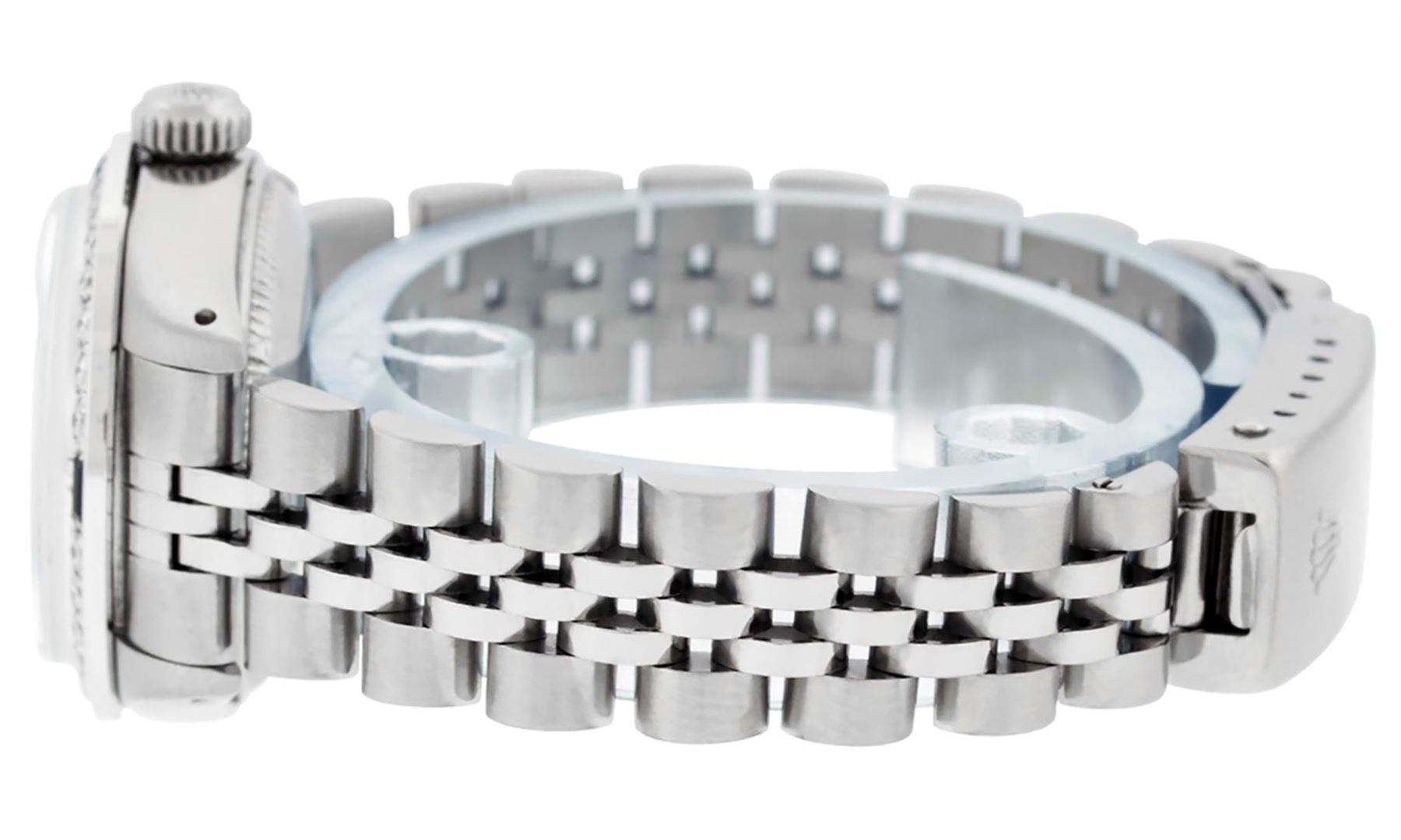 One Ladies Stainless Steel Rolex Datejust Polished Bright with Satin Finish, Serviced & Electronically Tested, Stainless Steel Case: 26mm, Stainless Steel Crown, Custom Bezel: New 18K White Gold Sapphire Beadset Diamond Bezel, Diamond + Gem Count:�28 Diamonds + 4 Sapphires, Total Weight .70 Carat, Clarity: SI-VS, Color: G to H. Custom Crystal: New Synthetic Sapphire Cyclops Lens. Custom Hands: New Luminescent Hands. Movement: Automatic Winding Movement Caliber 2030. Custom Dial: Refinished Ice Blue With Diamond Hour Markers, 10 Diamond in Dial, G To H In Color, Clarity: SI-VS. Date Window: 3 O'clock Position Date Display, Model: Datejust. Condition: G-6 Extra Fine. Bracelet: Stainless Steel Jubilee. Bright Polish & Satin Finish. 6.0 Inch Length, Adjustable. Standard Clasp, With Rolex Logo. This Watch Has Been Serviced Time Tested And Is In Excellent Condition It Is Free Of All Scratches And Dents.