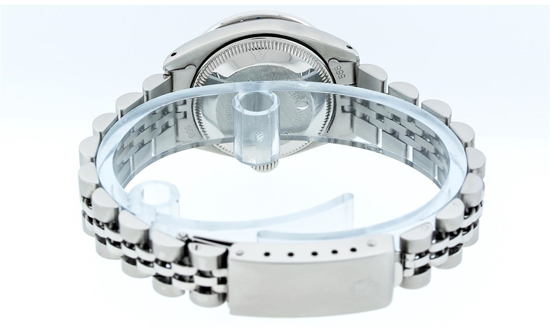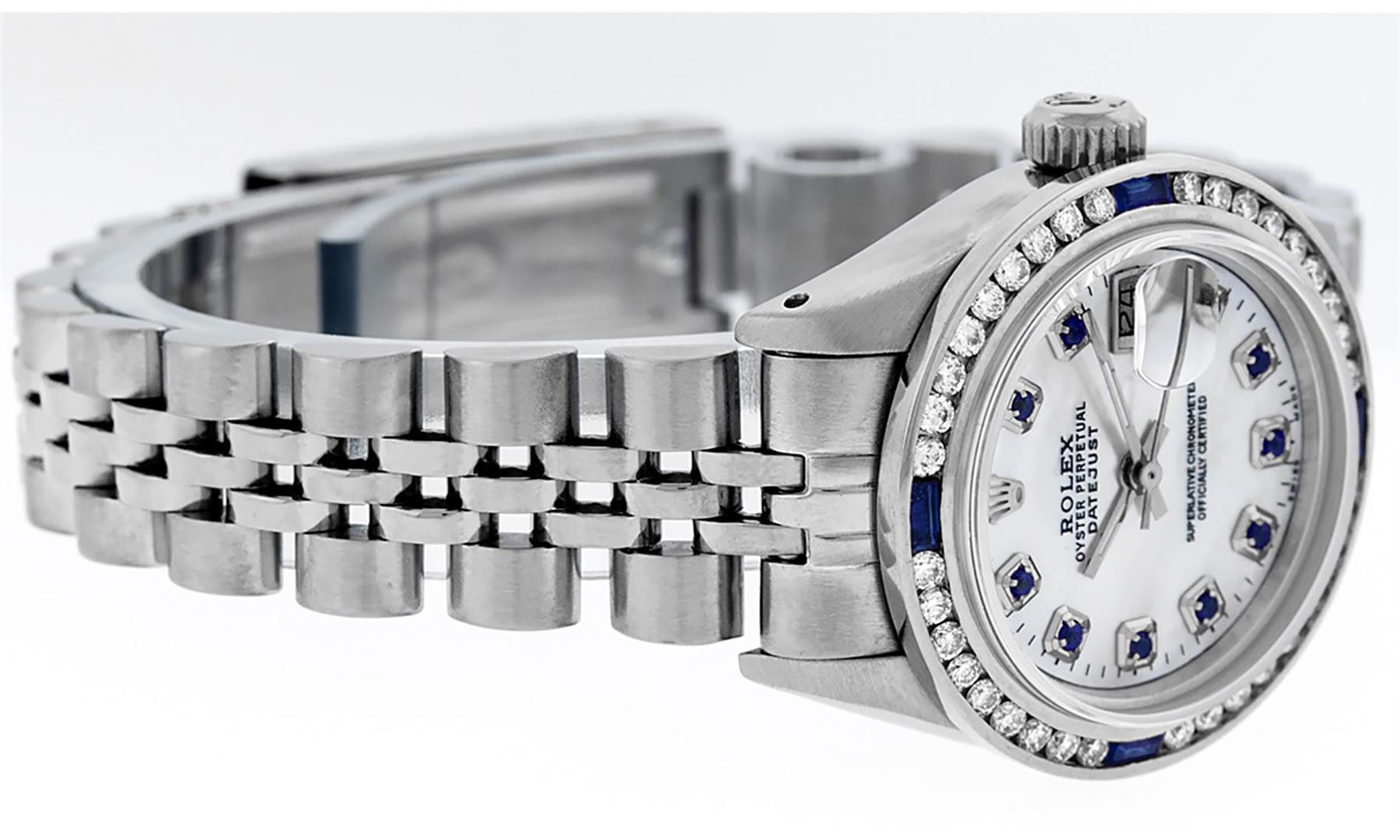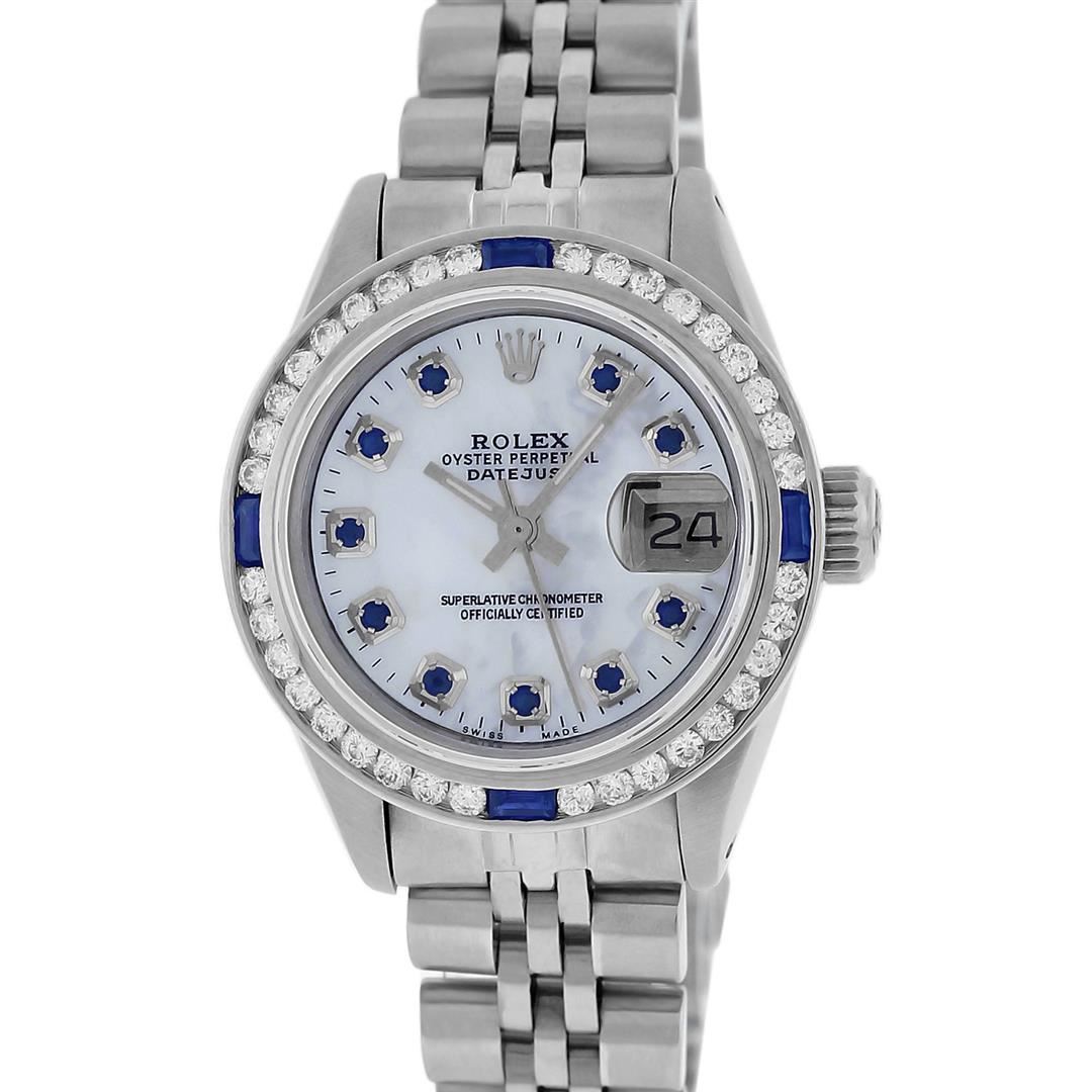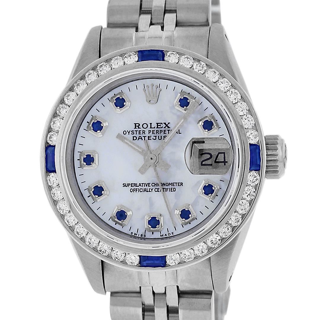 One Ladies Stainless Steel Rolex Datejust Polished Bright with Satin Finish, Serviced & Electronically Tested, Stainless Steel Case: 26mm, Stainless Steel Crown, Custom Bezel: New 18K White Gold Sapphire Channel Set Diamond Bezel, Diamond + Gem Count:�36 Diamonds + 4 Sapphires Total Weight 1.00 Carat, Clarity: SI-VS, Color: G to H. Custom Crystal: New Scratch Resistant Synthetic Sapphire Cyclops Lens. Custom Hands: New Luminescent Hands. Movement: Automatic Winding Movement Caliber 2030. Custom Dial: Refinished Mother Of Pearl With Sapphire Hour Markers And Dash Track. Date Window: 3 O'Clock Position Date Display, Model: Datejust. Condition: G-6 Extra Fine. Bracelet: Stainless Steel Jubilee. Bright Polish & Satin Finish. 6.0 Inch Length, Adjustable. Standard Clasp, With Rolex Logo. This Watch Has Been Serviced Time Tested And Is In Excellent Condition It Is Free Of All Scratches And Dents.