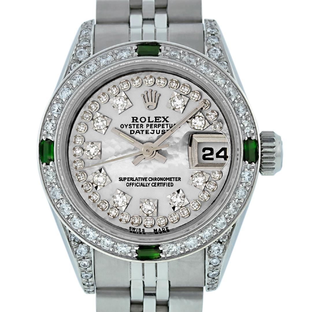 One Ladies Stainless Steel Rolex Datejust Polished Bright with Satin Finish, Serviced & Electronically Tested, Stainless Steel Case: 26mm, Stainless Steel Crown, Diamond Lugs: 24 Diamonds On Lugs, Clarity: SI-VS, Color: G to H. Custom Bezel: New 18K White Gold Synthetic Emerald Beadset Bezel, Diamond Count: 28 Diamonds + 4 Synthetic Emeralds, Total Weight .70 Carat, Clarity: SI-VS, Color: G to H. Custom Crystal: New Synthetic Sapphire Cyclops Lens. Custom Hands: New Luminescent Hands. Movement: Automatic Winding Movement. Custom Dial: Refinished Mother Of Pearl String Diamond Dial, 43 Diamonds in Dial G To H In Color, Clarity: VS. Date Window: 3 O'clock Position Date Display, Model: Datejust Condition: G-6 Extra Fine. Bracelet: Stainless Steel Jubilee. Bright Polish & Satin Finish. 6.0 Inch Length, Adjustable. Standard Clasp, With Rolex Logo. This Watch Has Been Serviced Time Tested And Is In Excellent Condition It Is Free Of All Scratches And Dents.