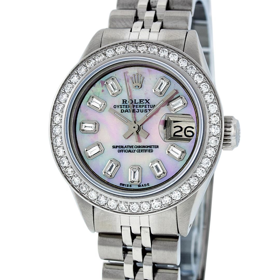 One Ladies Stainless Steel Rolex Datejust Polished Bright with Satin Finish, Serviced & Electronically Tested, Stainless Steel Case: 26mm, Stainless Steel Crown, Custom Bezel: New Stainless Steel Beadset Diamond Bezel, Diamond Count: 44 Diamonds Total Weight 1.00 Carat, Clarity: SI-VS, Color: G to H. Custom Crystal: New Scratch Resistant Synthetic Sapphire Cyclops Lens. Custom Hands: New Luminescent Hands. Movement: Automatic Winding Movement. Custom Dial: Refinished Pink Mother Of Pearl With Baguette Diamond Hour Markers, Diamond Count: 10 Baguette Diamonds in Dial G To H In Color, Clarity: SI-VS. Date Window: 3 O'clock Position Date Display, Model: Datejust. Condition: G-6 Extra Fine. Bracelet: Stainless Steel Jubilee Band. Bright Polish & Satin Finish. 6.0 Inch Length, Adjustable. Standard Clasp, With Rolex Logo. This Watch Has Been Serviced Time Tested And Is In Excellent Condition It Is Free Of All Scratches And Dents.