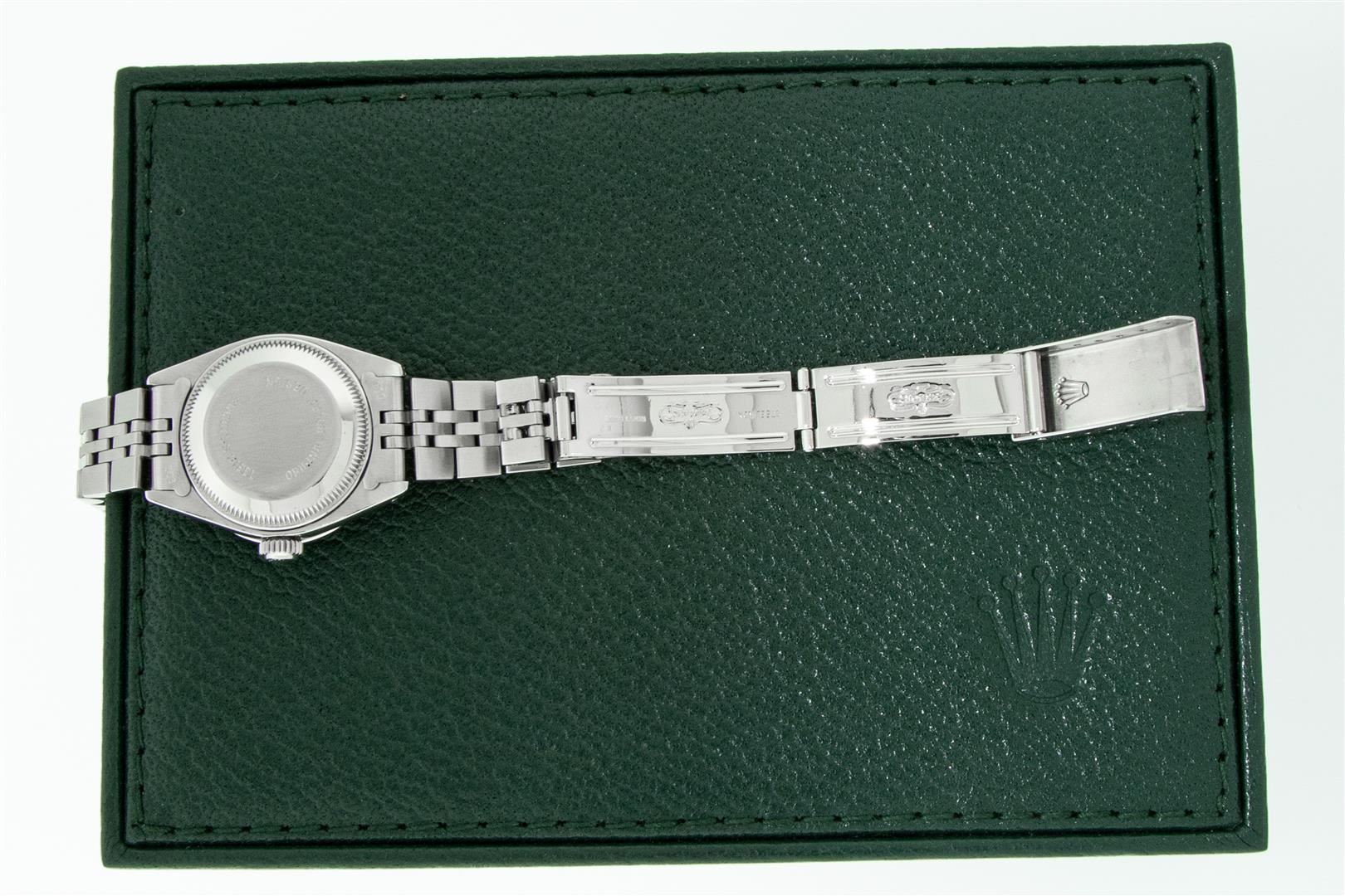 One Ladies Stainless Steel Rolex Datejust Polished Bright with Satin Finish, Serviced & Electronically Tested, Stainless Steel Case: 26mm, Rolex Stainless Steel Crown, Custom Diamond Lugs: 24 Diamonds On Lugs, Clarity: SI-VS, Color: G to H. Custom Bezel: New 18K White Gold Diamond Beadset Diamond Bezel, Stone Count: 32 Diamonds, Total Weight .70 Carat, Clarity: SI-VS, Color: G to H. Custom Crystal: New Sapphire With Magnified Date Window. Custom Hands: New Luminescent Hands. Rolex Movement: Automatic Winding Movement. Custom Dial: Mother Of Pearl With Custom Added Diamonds, 43 Diamonds in Dial G To H In Color, Clarity: VS. Date Window: 3 O'clock Position Date Display, Model: Datejust. Condition: G-6 Extra Fine. Rolex Bracelet: Stainless Steel Jubilee Band. Bright Polish & Satin Finish. 6.0 Inch Length, Adjustable. Standard Clasp, With Rolex Logo. This Watch Has Been Serviced Time Tested And Is In Excellent Condition It Is Free Of All Scratches And Dents. This Watch Comes With A Rolex Box.