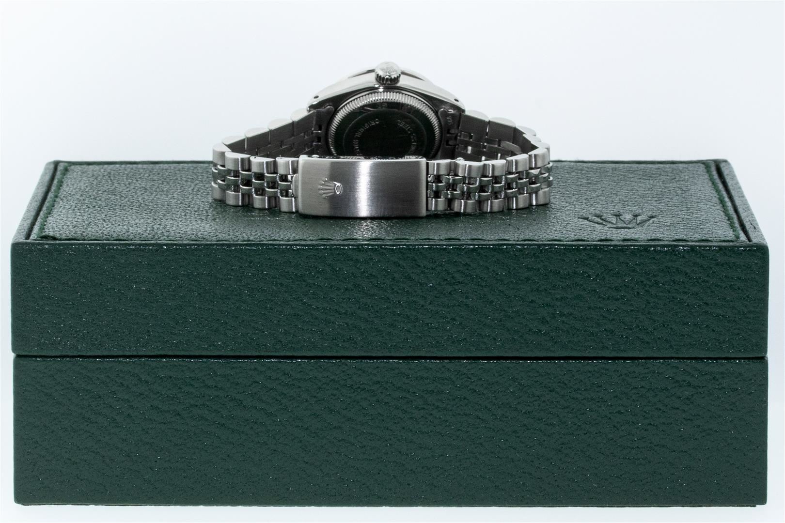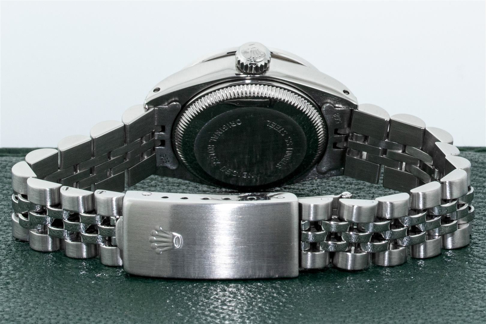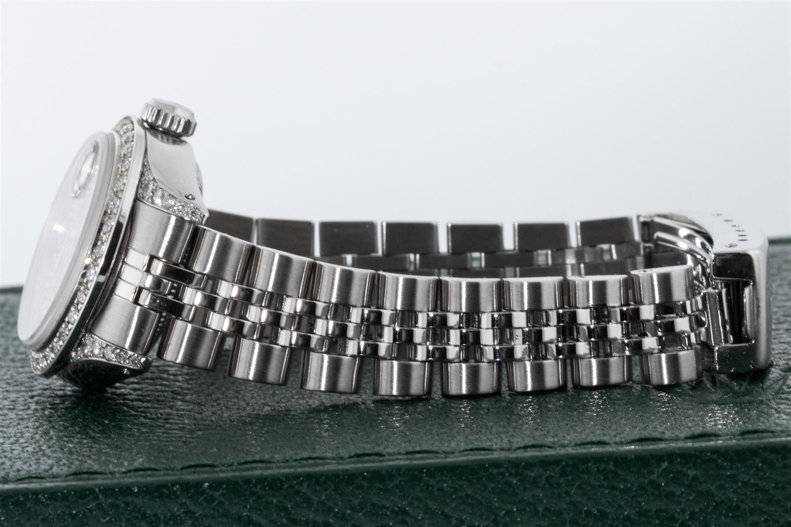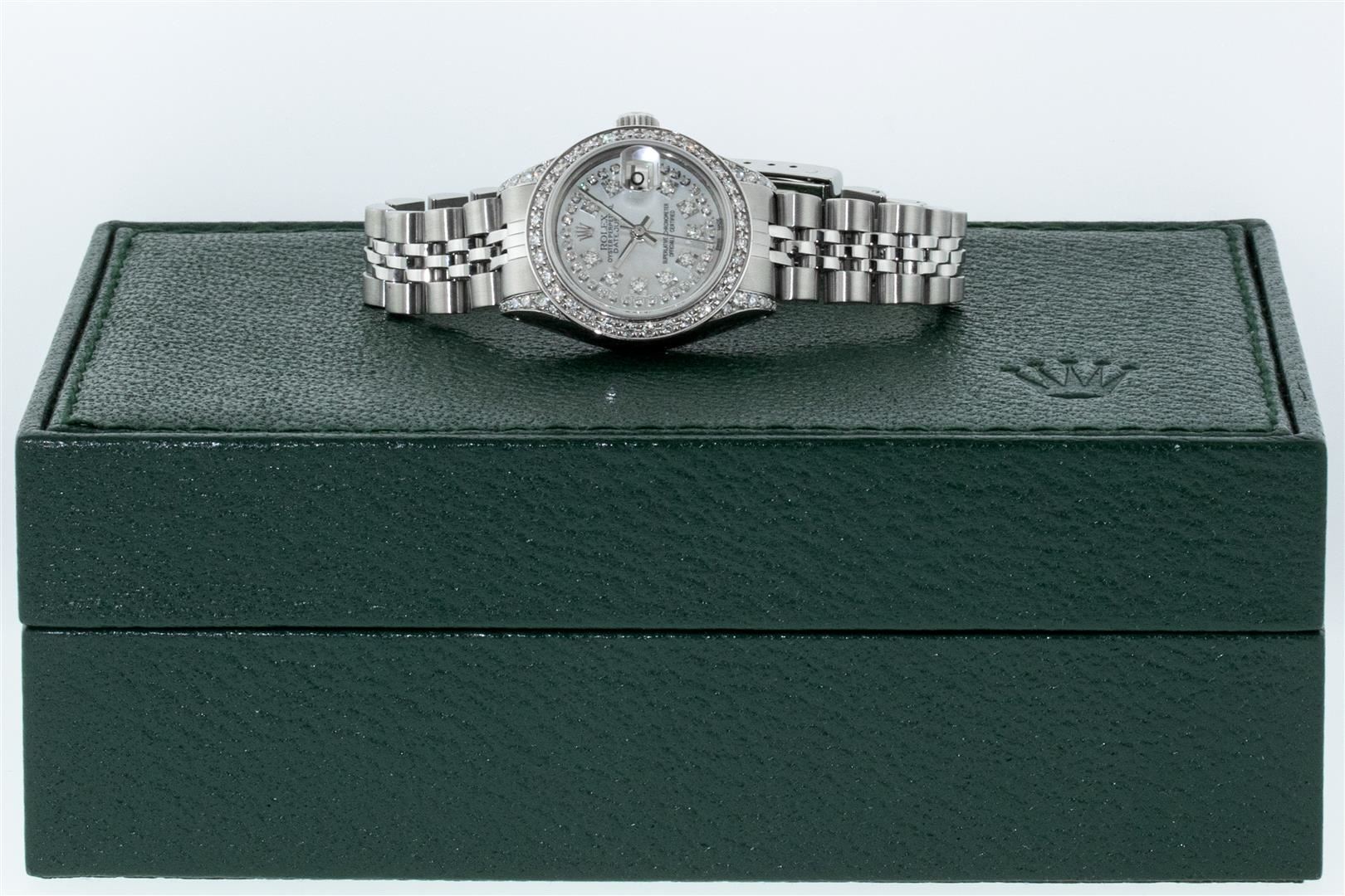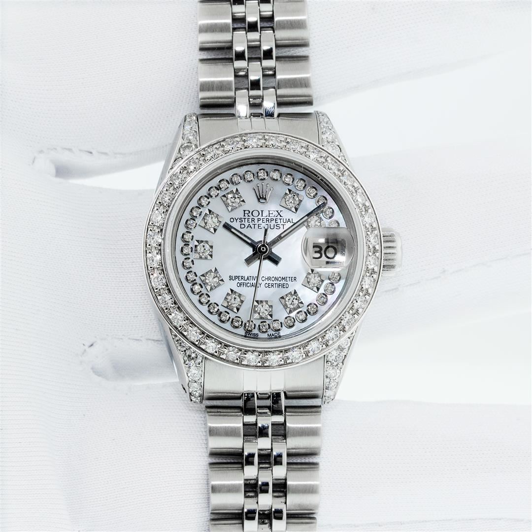 One Ladies Stainless Steel Rolex Datejust Polished Bright with Satin Finish, Serviced & Electronically Tested, Stainless Steel Case: 26mm, Rolex Stainless Steel Crown, Custom Diamond Lugs: 24 Diamonds On Lugs, Clarity: SI-VS, Color: G to H. Custom Bezel: New 18K White Gold Diamond Beadset Diamond Bezel, Stone Count: 32 Diamonds, Total Weight .70 Carat, Clarity: SI-VS, Color: G to H. Custom Crystal: New Sapphire With Magnified Date Window. Custom Hands: New Luminescent Hands. Rolex Movement: Automatic Winding Movement. Custom Dial: Mother Of Pearl With Custom Added Diamonds, 43 Diamonds in Dial G To H In Color, Clarity: VS. Date Window: 3 O'clock Position Date Display, Model: Datejust. Condition: G-6 Extra Fine. Rolex Bracelet: Stainless Steel Jubilee Band. Bright Polish & Satin Finish. 6.0 Inch Length, Adjustable. Standard Clasp, With Rolex Logo. This Watch Has Been Serviced Time Tested And Is In Excellent Condition It Is Free Of All Scratches And Dents. This Watch Comes With A Rolex Box.
