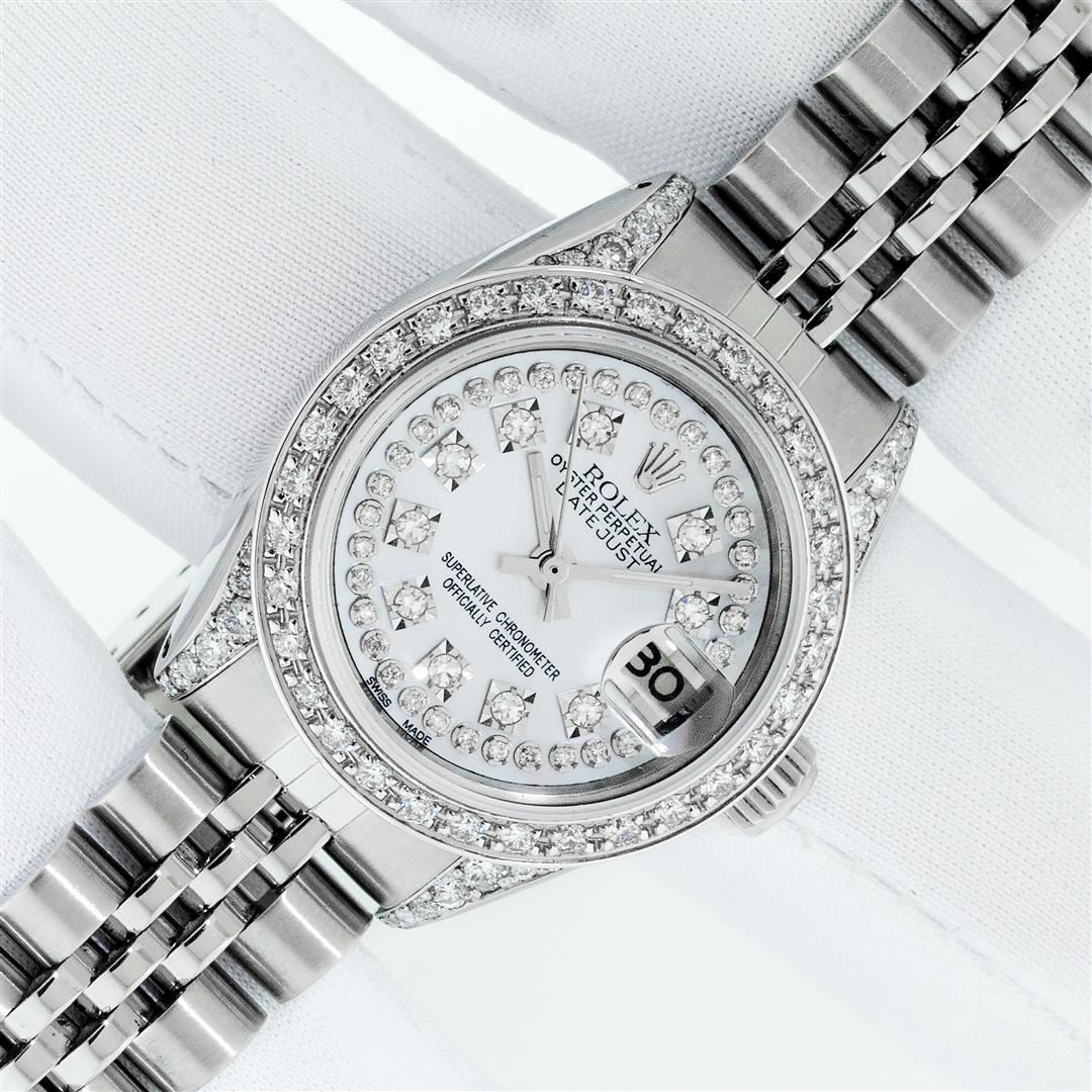 One Ladies Stainless Steel Rolex Datejust Polished Bright with Satin Finish, Serviced & Electronically Tested, Stainless Steel Case: 26mm, Rolex Stainless Steel Crown, Custom Diamond Lugs: 24 Diamonds On Lugs, Clarity: SI-VS, Color: G to H. Custom Bezel: New 18K White Gold Diamond Beadset Diamond Bezel, Stone Count: 32 Diamonds, Total Weight .70 Carat, Clarity: SI-VS, Color: G to H. Custom Crystal: New Sapphire With Magnified Date Window. Custom Hands: New Luminescent Hands. Rolex Movement: Automatic Winding Movement. Custom Dial: Mother Of Pearl With Custom Added Diamonds, 43 Diamonds in Dial G To H In Color, Clarity: VS. Date Window: 3 O'clock Position Date Display, Model: Datejust. Condition: G-6 Extra Fine. Rolex Bracelet: Stainless Steel Jubilee Band. Bright Polish & Satin Finish. 6.0 Inch Length, Adjustable. Standard Clasp, With Rolex Logo. This Watch Has Been Serviced Time Tested And Is In Excellent Condition It Is Free Of All Scratches And Dents. This Watch Comes With A Rolex Box.