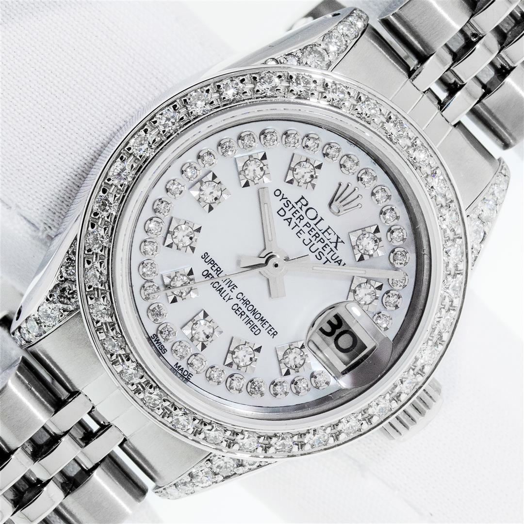 One Ladies Stainless Steel Rolex Datejust Polished Bright with Satin Finish, Serviced & Electronically Tested, Stainless Steel Case: 26mm, Rolex Stainless Steel Crown, Custom Diamond Lugs: 24 Diamonds On Lugs, Clarity: SI-VS, Color: G to H. Custom Bezel: New 18K White Gold Diamond Beadset Diamond Bezel, Stone Count: 32 Diamonds, Total Weight .70 Carat, Clarity: SI-VS, Color: G to H. Custom Crystal: New Sapphire With Magnified Date Window. Custom Hands: New Luminescent Hands. Rolex Movement: Automatic Winding Movement. Custom Dial: Mother Of Pearl With Custom Added Diamonds, 43 Diamonds in Dial G To H In Color, Clarity: VS. Date Window: 3 O'clock Position Date Display, Model: Datejust. Condition: G-6 Extra Fine. Rolex Bracelet: Stainless Steel Jubilee Band. Bright Polish & Satin Finish. 6.0 Inch Length, Adjustable. Standard Clasp, With Rolex Logo. This Watch Has Been Serviced Time Tested And Is In Excellent Condition It Is Free Of All Scratches And Dents. This Watch Comes With A Rolex Box.