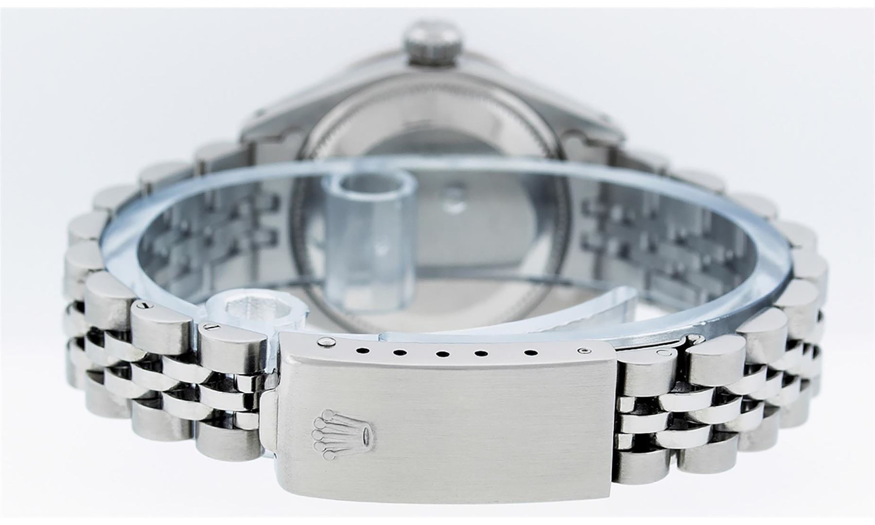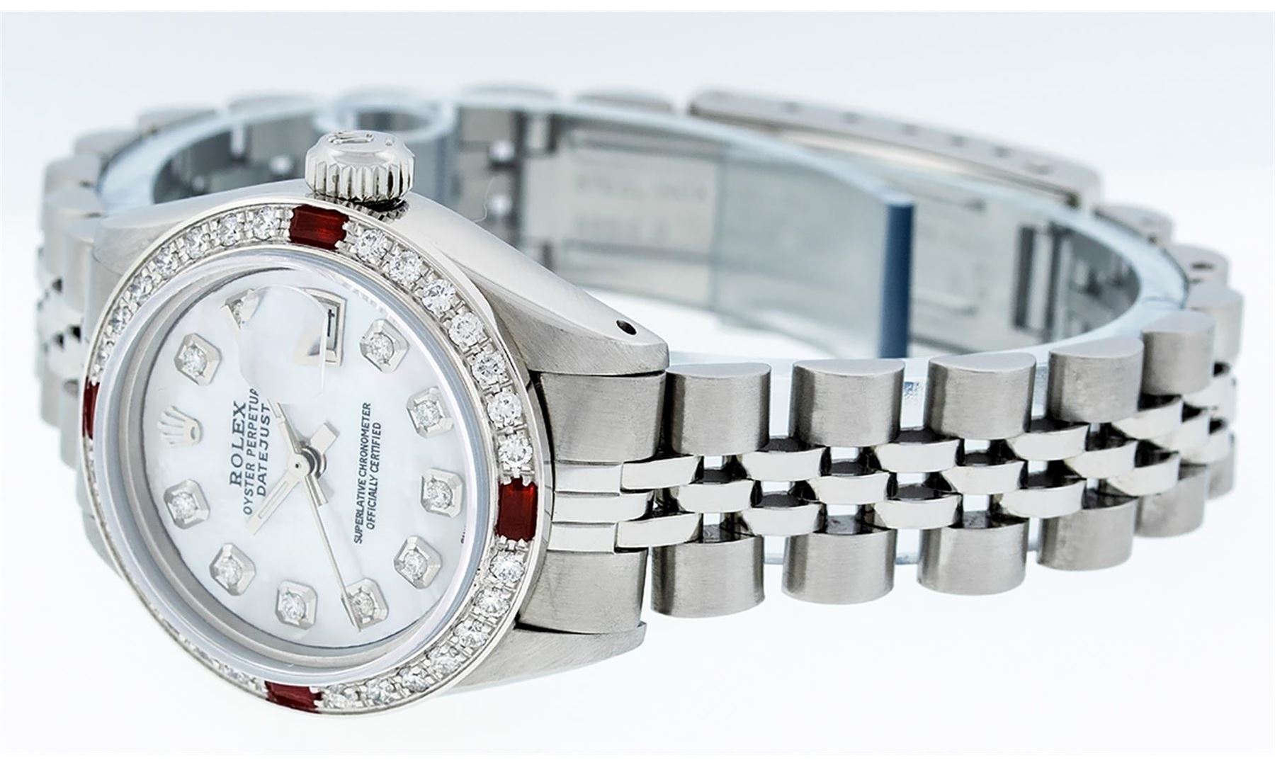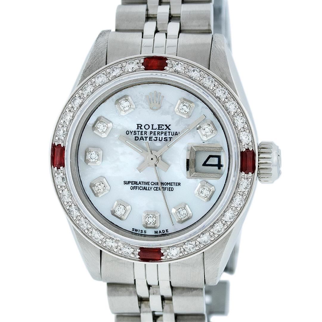 One Ladies Stainless Steel Rolex Datejust Polished Bright with Satin Finish, Serviced & Electronically Tested, Stainless Steel Case: 26mm, Stainless Steel Crown, Custom Bezel: New 18K White Gold Ruby Beadset Diamond Bezel, Diamond + Gem Count: 28 Diamonds + 4 Rubies. Total Weight .70 Carat, Clarity: SI-VS, Color: G to H. Custom Crystal: New Synthetic Sapphire Cyclops Lens. Custom Hands: New Luminescent Hands. Movement: Automatic Winding Movement Caliber 2030. Custom Dial: Refinished Mother Of Pearl With Diamond Hour Markers, Diamond Count: 10 Diamond in Dial, G To H In Color, Clarity: SI-VS. Date Window: 3 O'clock Position Date Display, Model: Datejust. Condition: G-6 Extra Fine. Bracelet: Stainless Steel Jubilee. Bright Polish & Satin Finish. 6.0 Inch Length, Adjustable. Standard Clasp, With Rolex Logo. This Watch Has Been Serviced Time Tested And Is In Excellent Condition It Is Free Of All Scratches And Dents.