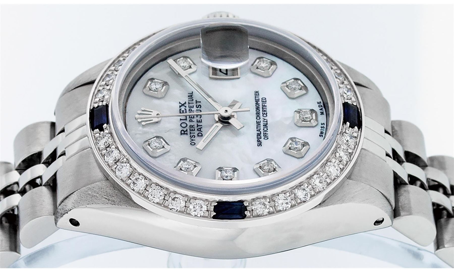 One Ladies Stainless Steel Rolex Datejust Polished Bright with Satin Finish, Serviced & Electronically Tested, Stainless Steel Case: 26mm, Stainless Steel Crown, Custom Bezel: New 18K White Gold Sapphire Beadset Diamond Bezel, Diamond + Gem Count: 28 Diamonds + 4 Sapphires Total Weight .70 Carat, Clarity: SI-VS, Color: G to H. Custom Crystal: New Synthetic Sapphire Cyclops Lens. Custom Hands: New Luminescent Hands. Movement: Automatic Winding Movement.. Custom Dial: Refinished Mother Of Pearl With Diamond Hour Markers, 10 Diamond in Dial, G To H In Color, Clarity: SI-VS. Date Window: 3 O'clock Position Date Display, Model: Datejust. Condition: G-6 Extra Fine. Bracelet: Stainless Steel Jubilee. Bright Polish & Satin Finish. 6.0 Inch Length, Adjustable. Standard Clasp, With Rolex Logo. This Watch Has Been Serviced Time Tested And Is In Excellent Condition It Is Free Of All Scratches And Dents.
