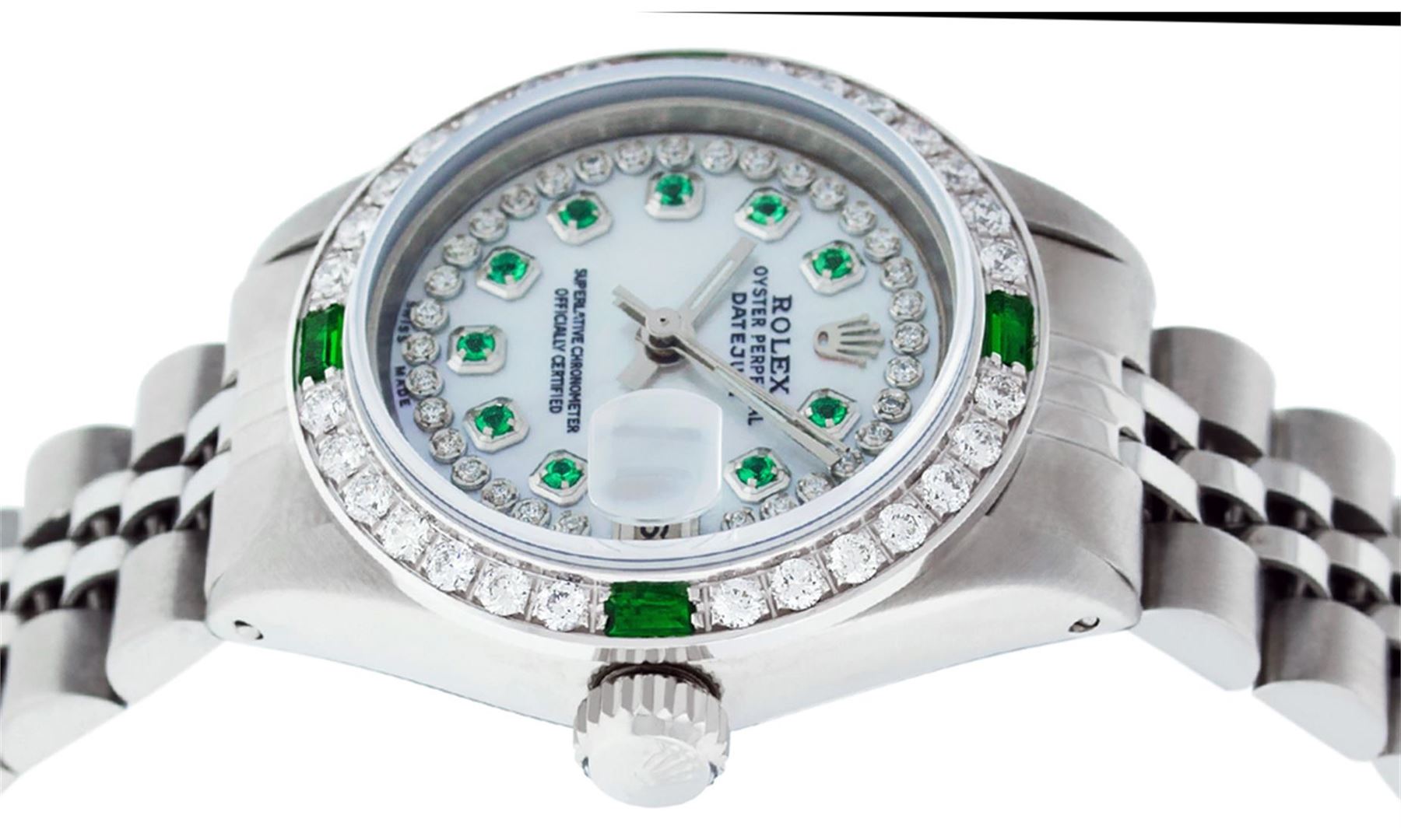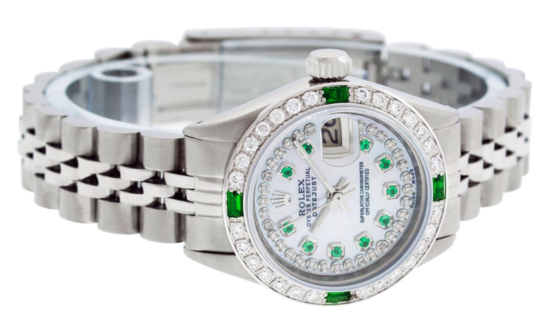 One Ladies Stainless Steel Rolex Datejust Polished Bright with Satin Finish, Serviced & Electronically Tested, Stainless Steel Case: 26mm, Stainless Steel Crown. Custom Bezel: New 18K White Gold Beadset & Emerald Diamond Bezel, Diamond Count: 28 Diamonds