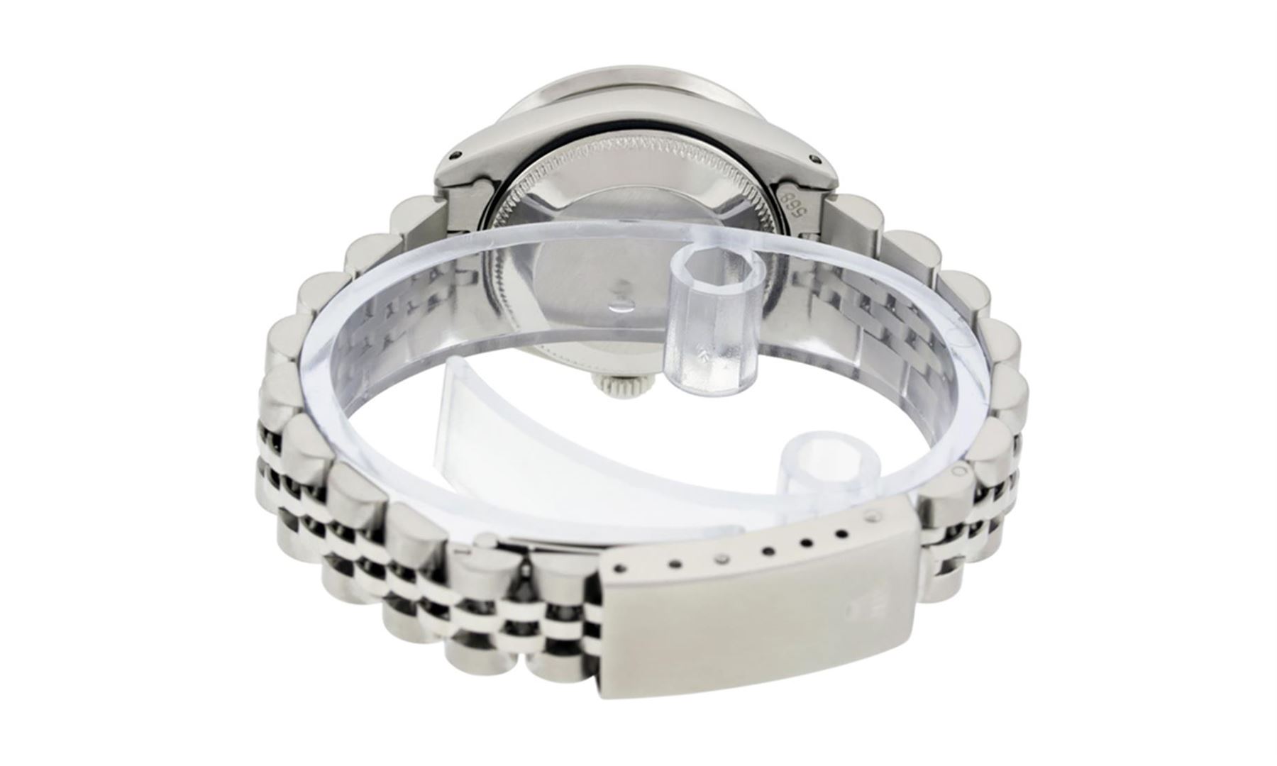 One Ladies Stainless Steel Rolex Datejust Polished Bright with Satin Finish, Serviced & Electronically Tested, Stainless Steel Case: 26mm, Stainless Steel Crown. Custom Bezel: New 18K White Gold Beadset & Emerald Diamond Bezel, Diamond Count: 28 Diamonds
