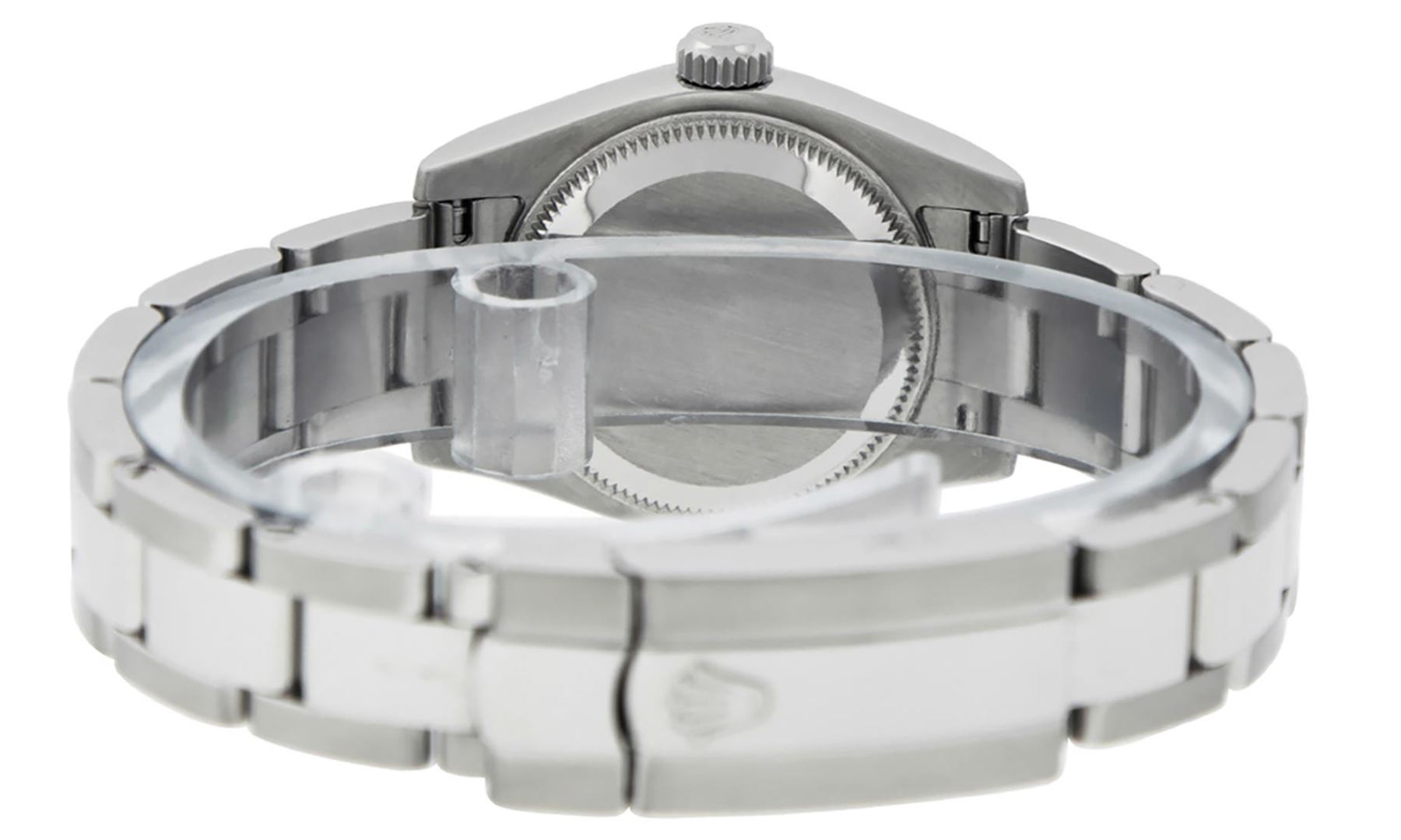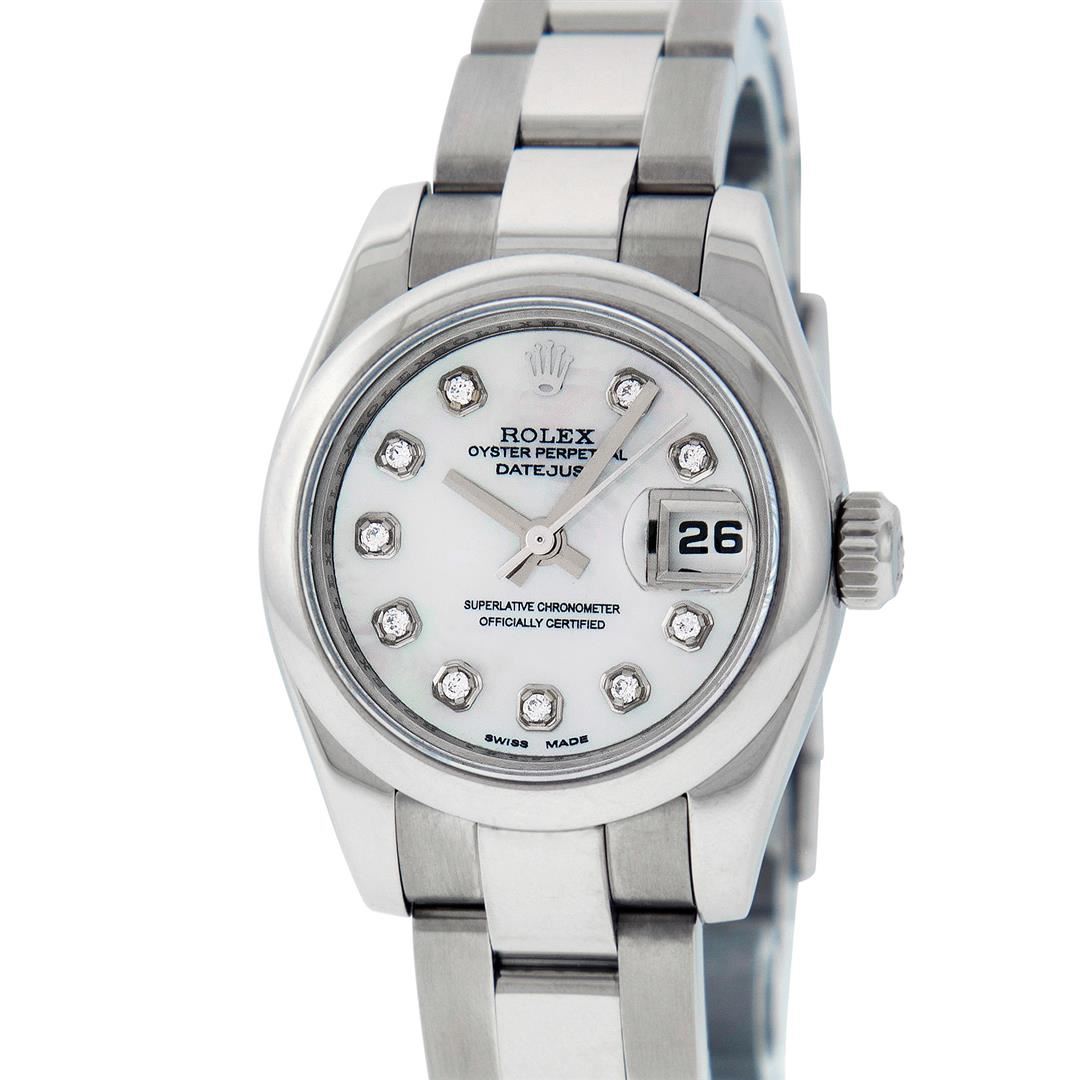 One Ladies Pre Owned Quickset Stainless Steel Rolex Datejust Polished Bright with Satin Finish, Serviced & Electronically Tested, Rolex Stainless Steel Case: 26mm, Rolex Stainless Steel Crown, Rolex Bezel: Stainless Steel Smooth Bezel. Rolex Crystal: Scratch Resistant Sapphire Cyclops Lens. Rolex Hands: Luminescent Hands. Rolex Movement: Automatic Winding Movement. Custom Dial: Refinished To Mother Of Pearl With Added VS Diamonds, Diamond Count: 10 Single Cut Diamonds In Dial, Color: G to H, Clarity: VS. Date Window: 3 O'Clock Position Date Display, Model: 179160 Quickset Datejust. Condition: G-6 Extra Fine. Rolex Bracelet: Stainless Steel Oyster Band. Bright Polish & Satin Finish. 6.0 Inch Length, Adjustable. Standard Clasp, With Rolex Logo. This Watch Has Been Serviced Time Tested And Is In Excellent Condition It Is Free Of All Scratches And Dents.