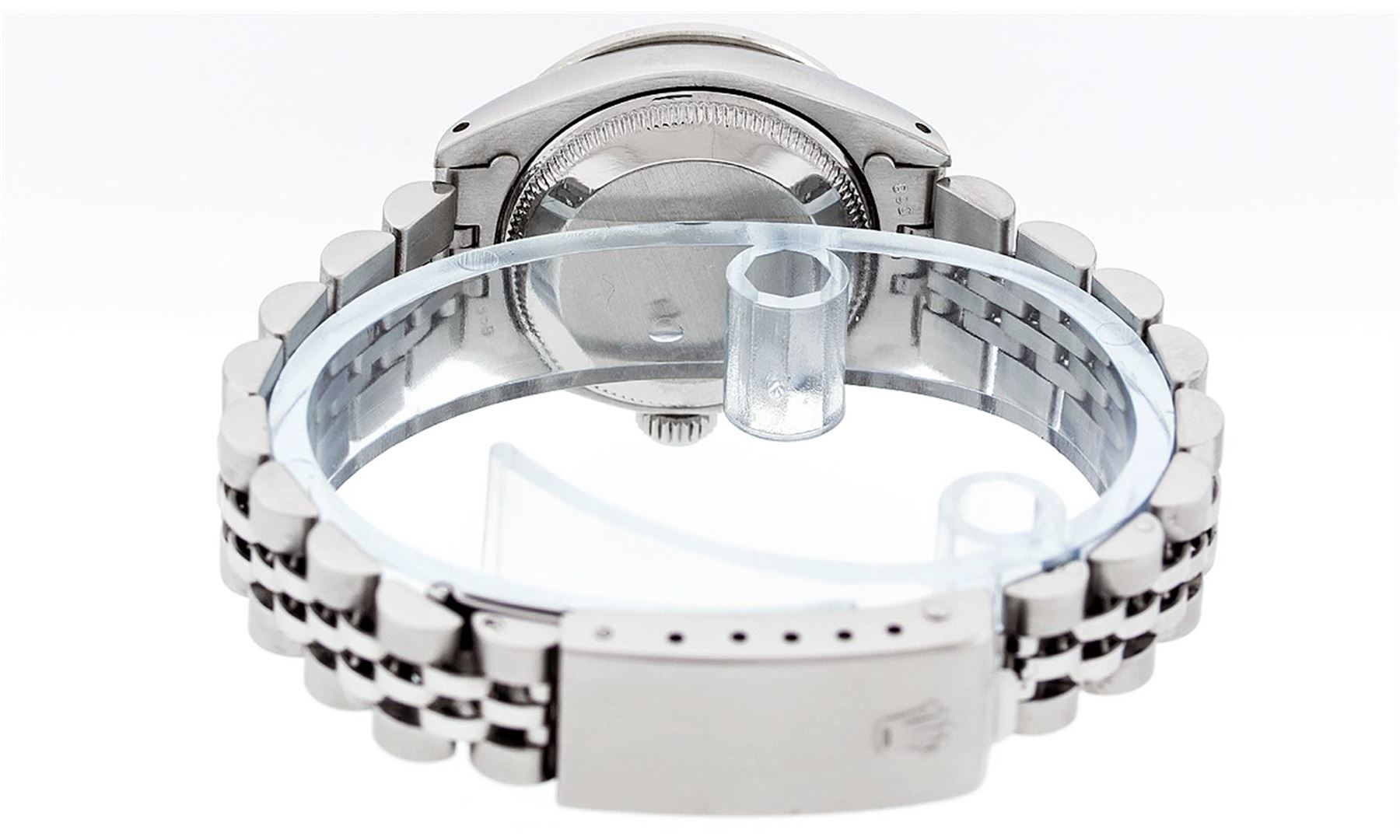 One Ladies Stainless Steel Rolex Datejust Polished Bright with Satin Finish, Serviced & Electronically Tested, Stainless Steel Case: 26mm, Stainless Steel Crown, Custom Bezel: New 18K White Gold Synthetic Emerald Beadset Diamond Bezel, Diamond + Gem Count: 28 Diamonds + 4 Synthetic Emeralds. Total Weight .70 Carat, Clarity: SI-VS, Color: G to H. Custom Crystal: New Synthetic Sapphire Cyclops Lens. Custom Hands: New Luminescent Hands. Movement: Automatic Winding Movement . Custom Dial: Refinished Mother Of Pearl With Diamond Hour Markers, 10 Diamond in Dial G To H In Color, Clarity: SI-VS. Date Window: 3 O'Clock Position Date Display, Model: Datejust. Condition: G-6 Extra Fine. Bracelet: Stainless Steel Jubilee. Bright Polish & Satin Finish. 6.0 Inch Length, Adjustable. Standard Clasp, With Rolex Logo. This Watch Has Been Serviced Time Tested And Is In Excellent Condition It Is Free Of All Scratches And Dents.