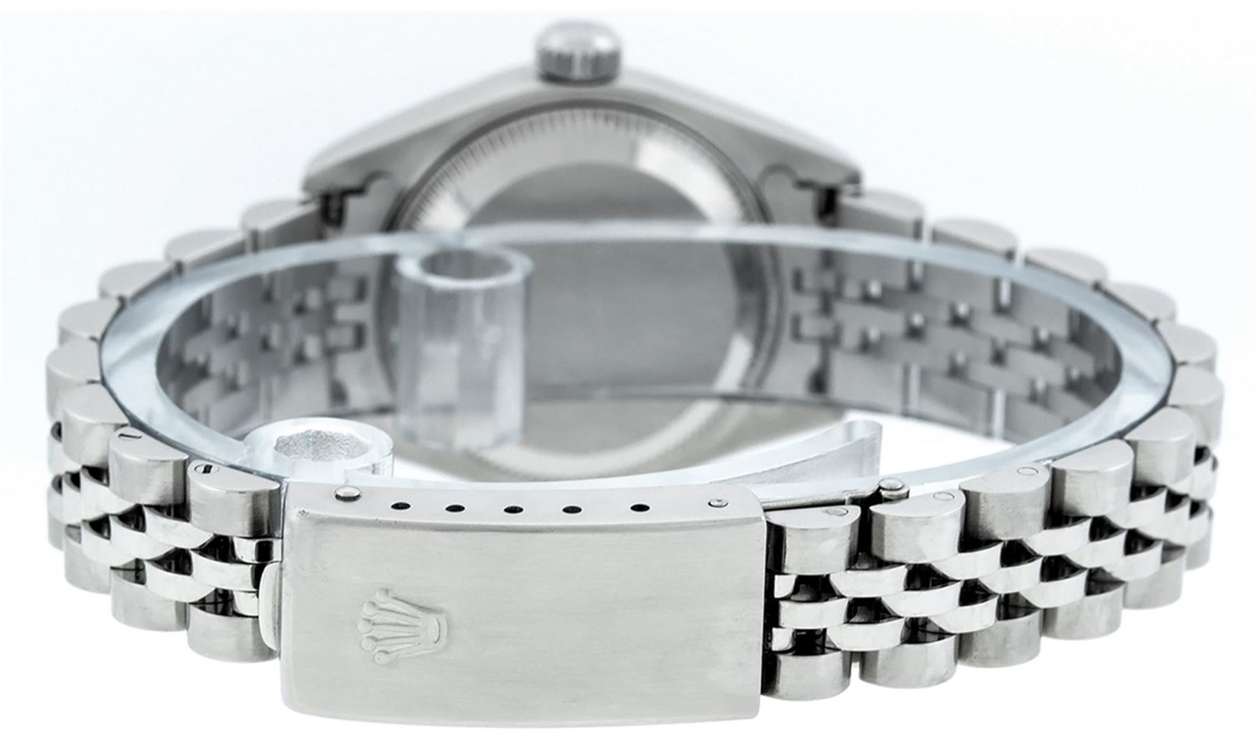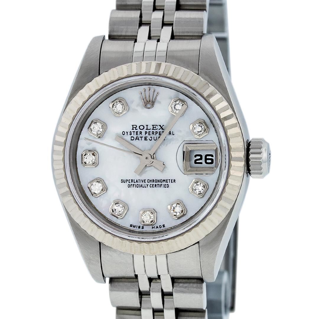 One Ladies Quickset Stainless Steel Rolex Datejust Polished Bright with Satin Finish, Serviced & Electronically Tested, Stainless Steel Case: 26mm, Stainless Steel Crown, Bezel: 18K White Gold Fluted Bezel. Custom Crystal: New Scratch Resistant Sapphire Cyclops Lens. Custom Hands: New Luminescent Hands. Movement: Automatic Winding Movement Caliber 2235. Custom Dial: Mother Of Pearl Diamond Dial, Diamond Count: 10 Single Cut Diamonds In Dial, Color: G to H, Clarity: VS2 Date Window: 3 O'Clock Position Date Display, Model: 79174 Quickset Datejust. Condition: G-6 Extra Fine. Bracelet: Stainless Steel Jubilee Band. Bright Polish & Satin Finish. 6.0 Inch Length, Adjustable. Standard Clasp, With Rolex Logo. This Watch Has Been Serviced Time Tested And Is In Excellent Condition It Is Free Of All Scratches And Dents.