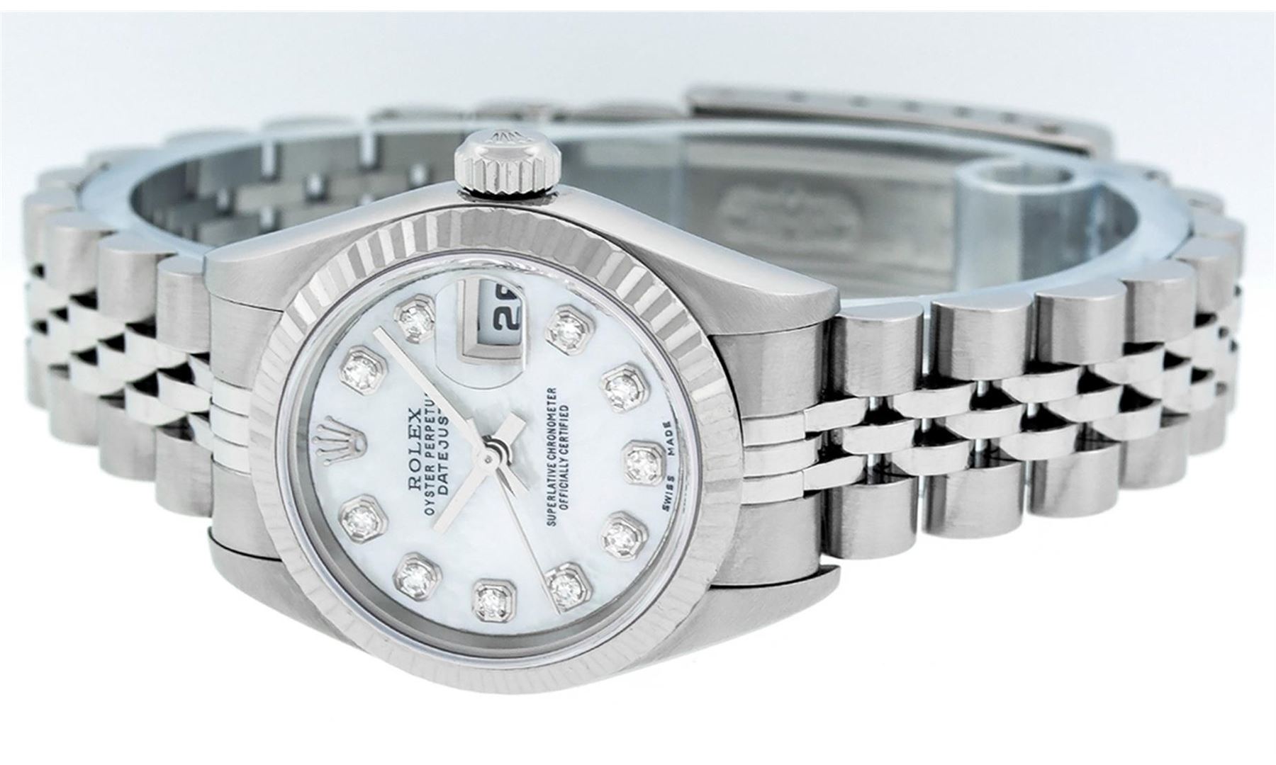 One Ladies Pre Owned Quickset Stainless Steel Rolex Datejust Polished Bright with Satin Finish, Serviced & Electronically Tested, Rolex Stainless Steel Case: 26mm, Rolex Stainless Steel Crown, Rolex Bezel: 18K White Gold Fluted Bezel. Custom Crystal: New Scratch Resistant Sapphire Cyclops Lens. Custom Hands: New Luminescent Hands. Rolex Movement: Automatic Winding Movement. Custom Dial: Refinished To Mother Of Pearl With Custom Added Diamonds, Diamond Count: 10 Single Cut Diamonds In Dial, Color: G to H, Clarity: VS2 Date Window: 3 O'clock Position Date Display, Model: Quickset Datejust. Condition: G-6 Extra Fine. Rolex Bracelet: Stainless Steel Jubilee Band. Bright Polish & Satin Finish. 6.0 Inch Length, Adjustable. Standard Clasp, With Rolex Logo. This Watch Has Been Serviced Time Tested And Is In Excellent Condition It Is Free Of All Scratches And Dents.