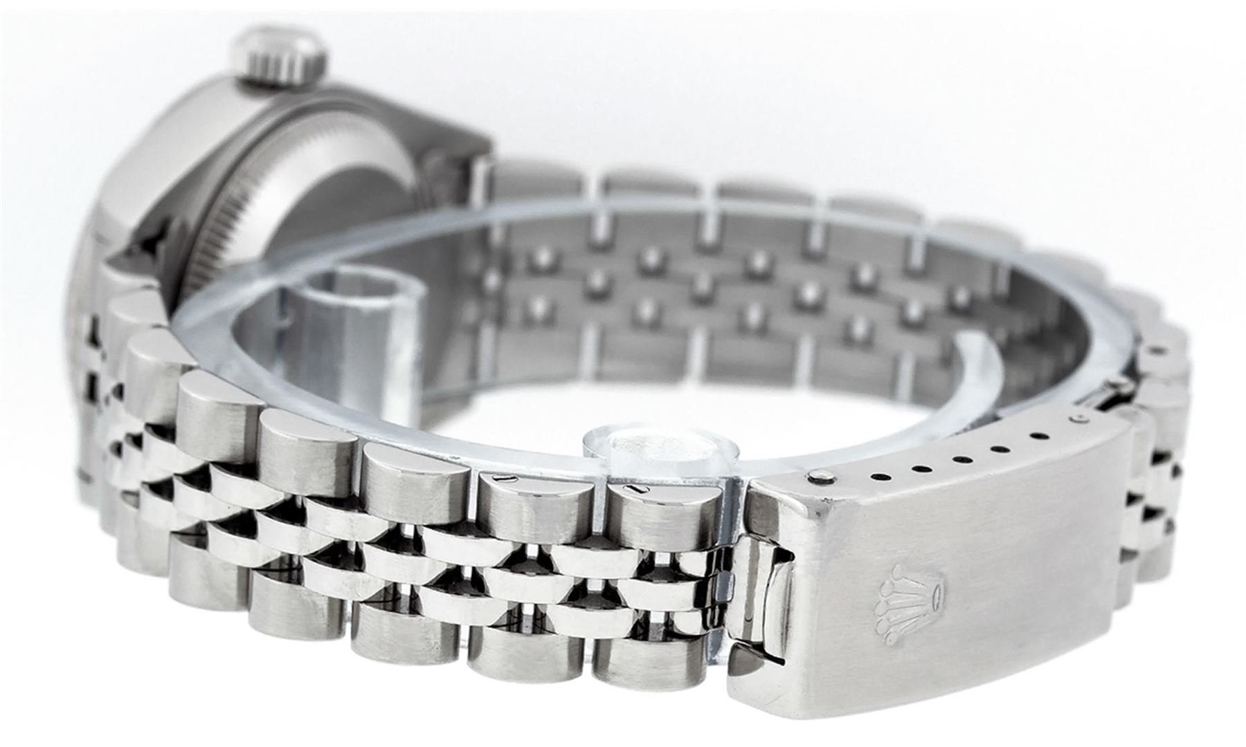 One Ladies Pre Owned Quickset Stainless Steel Rolex Datejust Polished Bright with Satin Finish, Serviced & Electronically Tested, Rolex Stainless Steel Case: 26mm, Rolex Stainless Steel Crown, Rolex Bezel: 18K White Gold Fluted Bezel. Custom Crystal: New Scratch Resistant Sapphire Cyclops Lens. Custom Hands: New Luminescent Hands. Rolex Movement: Automatic Winding Movement. Custom Dial: Refinished To Mother Of Pearl With Custom Added Diamonds, Diamond Count: 10 Single Cut Diamonds In Dial, Color: G to H, Clarity: VS2 Date Window: 3 O'clock Position Date Display, Model: Quickset Datejust. Condition: G-6 Extra Fine. Rolex Bracelet: Stainless Steel Jubilee Band. Bright Polish & Satin Finish. 6.0 Inch Length, Adjustable. Standard Clasp, With Rolex Logo. This Watch Has Been Serviced Time Tested And Is In Excellent Condition It Is Free Of All Scratches And Dents.