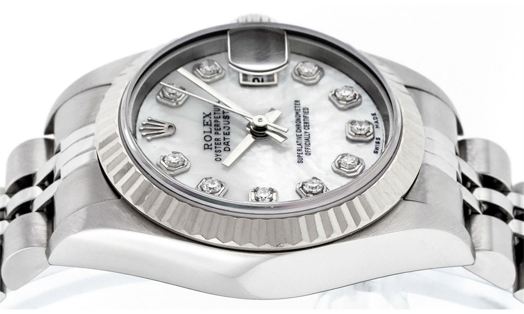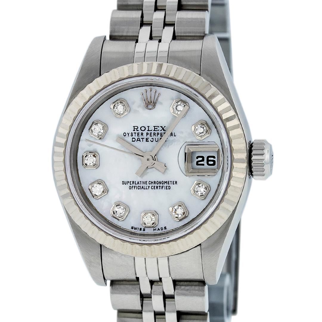 One Ladies Pre Owned Quickset Stainless Steel Rolex Datejust Polished Bright with Satin Finish, Serviced & Electronically Tested, Rolex Stainless Steel Case: 26mm, Rolex Stainless Steel Crown, Rolex Bezel: 18K White Gold Fluted Bezel. Custom Crystal: New Scratch Resistant Sapphire Cyclops Lens. Custom Hands: New Luminescent Hands. Rolex Movement: Automatic Winding Movement. Custom Dial: Refinished To Mother Of Pearl With Custom Added Diamonds, Diamond Count: 10 Single Cut Diamonds In Dial, Color: G to H, Clarity: VS2 Date Window: 3 O'clock Position Date Display, Model: Quickset Datejust. Condition: G-6 Extra Fine. Rolex Bracelet: Stainless Steel Jubilee Band. Bright Polish & Satin Finish. 6.0 Inch Length, Adjustable. Standard Clasp, With Rolex Logo. This Watch Has Been Serviced Time Tested And Is In Excellent Condition It Is Free Of All Scratches And Dents.
