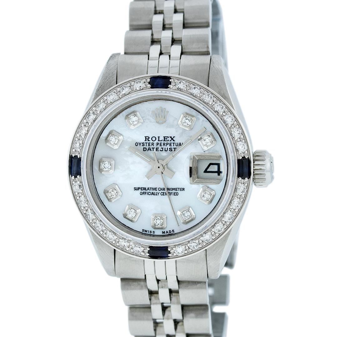 One Ladies Stainless Steel Rolex Datejust Polished Bright with Satin Finish, Serviced & Electronically Tested, Stainless Steel Case: 26mm, Stainless Steel Crown, Custom Bezel: New 18K White Gold Sapphire Beadset Diamond Bezel, Diamond + Gem Count: 28 Diamonds + 4 Sapphires Total Weight .70 Carat, Clarity: SI-VS, Color: G to H. Custom Crystal: New Synthetic Sapphire Cyclops Lens. Custom Hands: New Luminescent Hands. Movement: Automatic Winding Movement Caliber 2030. Custom Dial: Refinished Mother Of Pearl With Diamond Hour Markers, 10 Diamond in Dial, G To H In Color, Clarity: SI-VS. Date Window: 3 O'Clock Position Date Display, Model: Datejust. Condition: G-6 Extra Fine. Bracelet: Stainless Steel Jubilee. Bright Polish & Satin Finish. 6.0 Inch Length, Adjustable. Standard Clasp, With Rolex Logo. This Watch Has Been Serviced Time Tested And Is In Excellent Condition It Is Free Of All Scratches And Dents.