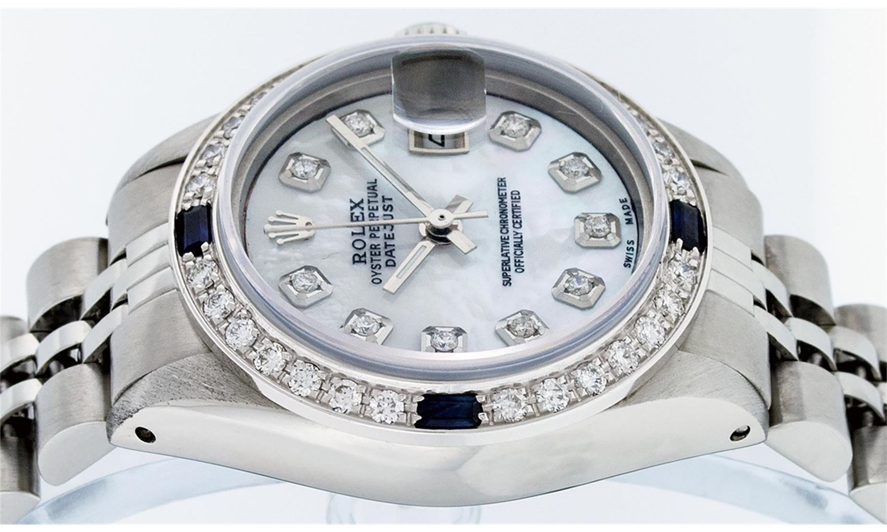 One Ladies Stainless Steel Rolex Datejust Polished Bright with Satin Finish, Serviced & Electronically Tested, Stainless Steel Case: 26mm, Stainless Steel Crown, Custom Bezel: New 18K White Gold Sapphire Beadset Diamond Bezel, Diamond + Gem Count: 28 Diamonds + 4 Sapphires Total Weight .70 Carat, Clarity: SI-VS, Color: G to H. Custom Crystal: New Synthetic Sapphire Cyclops Lens. Custom Hands: New Luminescent Hands. Movement: Automatic Winding Movement Caliber 2030. Custom Dial: Refinished Mother Of Pearl With Diamond Hour Markers, 10 Diamond in Dial, G To H In Color, Clarity: SI-VS. Date Window: 3 O'Clock Position Date Display, Model: Datejust. Condition: G-6 Extra Fine. Bracelet: Stainless Steel Jubilee. Bright Polish & Satin Finish. 6.0 Inch Length, Adjustable. Standard Clasp, With Rolex Logo. This Watch Has Been Serviced Time Tested And Is In Excellent Condition It Is Free Of All Scratches And Dents.