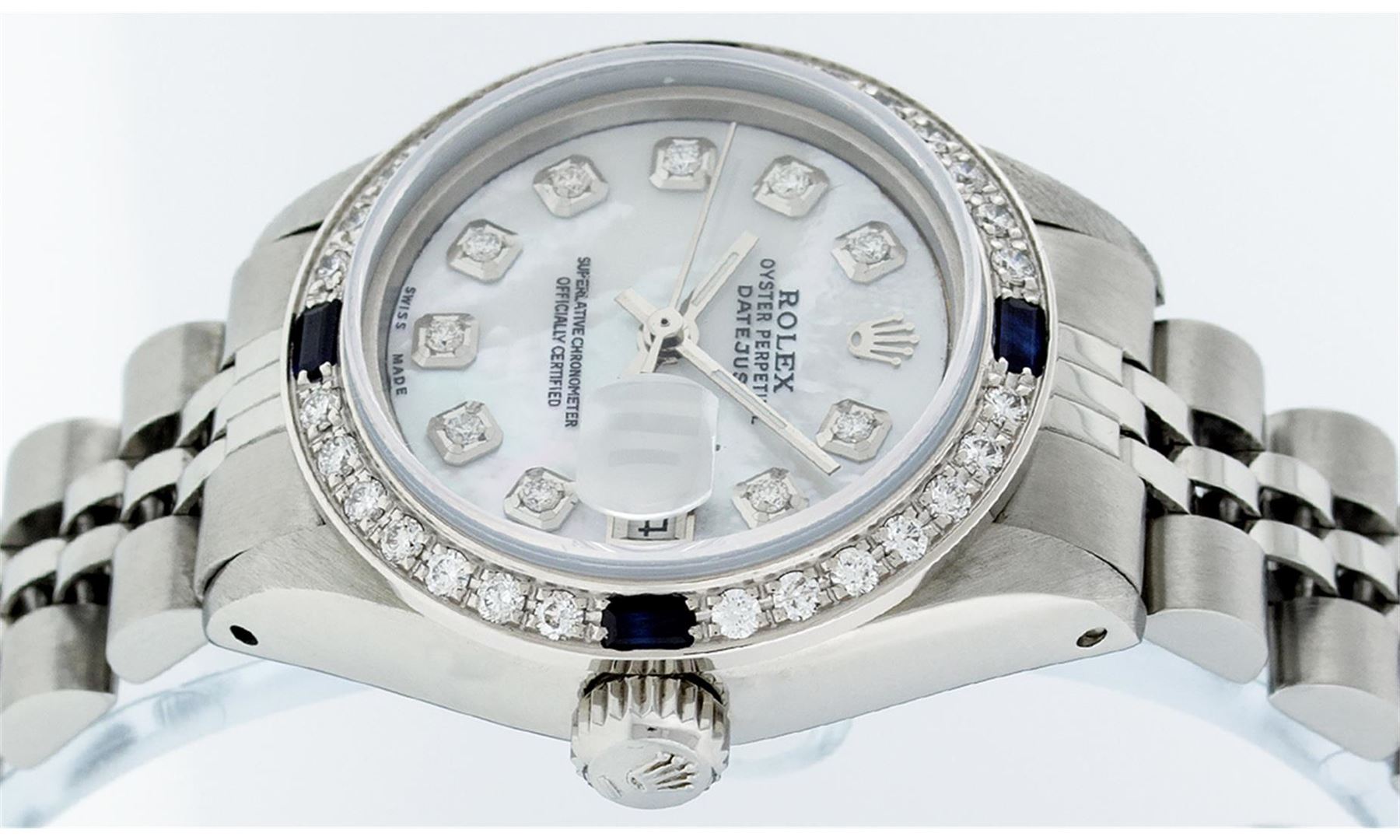 One Ladies Stainless Steel Rolex Datejust Polished Bright with Satin Finish, Serviced & Electronically Tested, Stainless Steel Case: 26mm, Stainless Steel Crown, Custom Bezel: New 18K White Gold Sapphire Beadset Diamond Bezel, Diamond + Gem Count: 28 Diamonds + 4 Sapphires Total Weight .70 Carat, Clarity: SI-VS, Color: G to H. Custom Crystal: New Synthetic Sapphire Cyclops Lens. Custom Hands: New Luminescent Hands. Movement: Automatic Winding Movement Caliber 2030. Custom Dial: Refinished Mother Of Pearl With Diamond Hour Markers, 10 Diamond in Dial, G To H In Color, Clarity: SI-VS. Date Window: 3 O'Clock Position Date Display, Model: Datejust. Condition: G-6 Extra Fine. Bracelet: Stainless Steel Jubilee. Bright Polish & Satin Finish. 6.0 Inch Length, Adjustable. Standard Clasp, With Rolex Logo. This Watch Has Been Serviced Time Tested And Is In Excellent Condition It Is Free Of All Scratches And Dents.