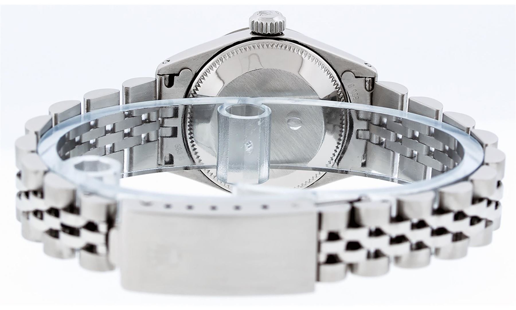 One Ladies Stainless Steel Rolex Datejust Polished Bright with Satin Finish, Serviced & Electronically Tested, Stainless Steel Case: 26mm, Stainless Steel Crown, Bezel: 14K White Gold Bezel. Custom Crystal: New Acrylic Cyclops Lens. Custom Hands: New Luminescent Hands. Movement: Automatic Winding Movement. Custom Dial: Refinished Mother Of Pearl Roman Dial. Date Window: 3 O'clock Position Date Display, Model: Datejust. Condition: G-6 Extra Fine. Bracelet: Stainless Steel Jubilee Band. Bright Polish & Satin Finish. 6.0 Inch Length, Adjustable. Standard Clasp, With Rolex Logo. This Watch Has Been Serviced Time Tested And Is In Excellent Condition It Is Free Of All Scratches And Dents.