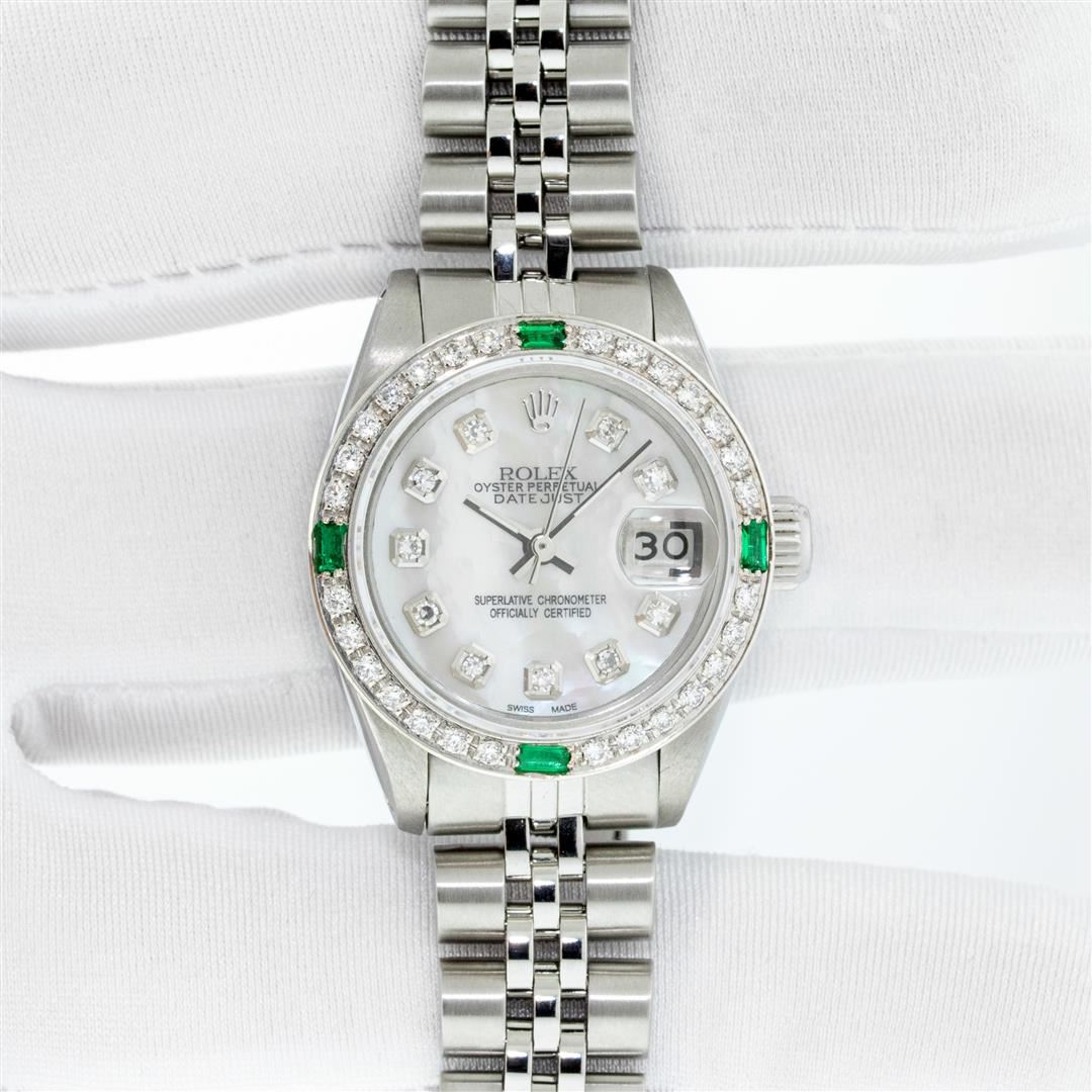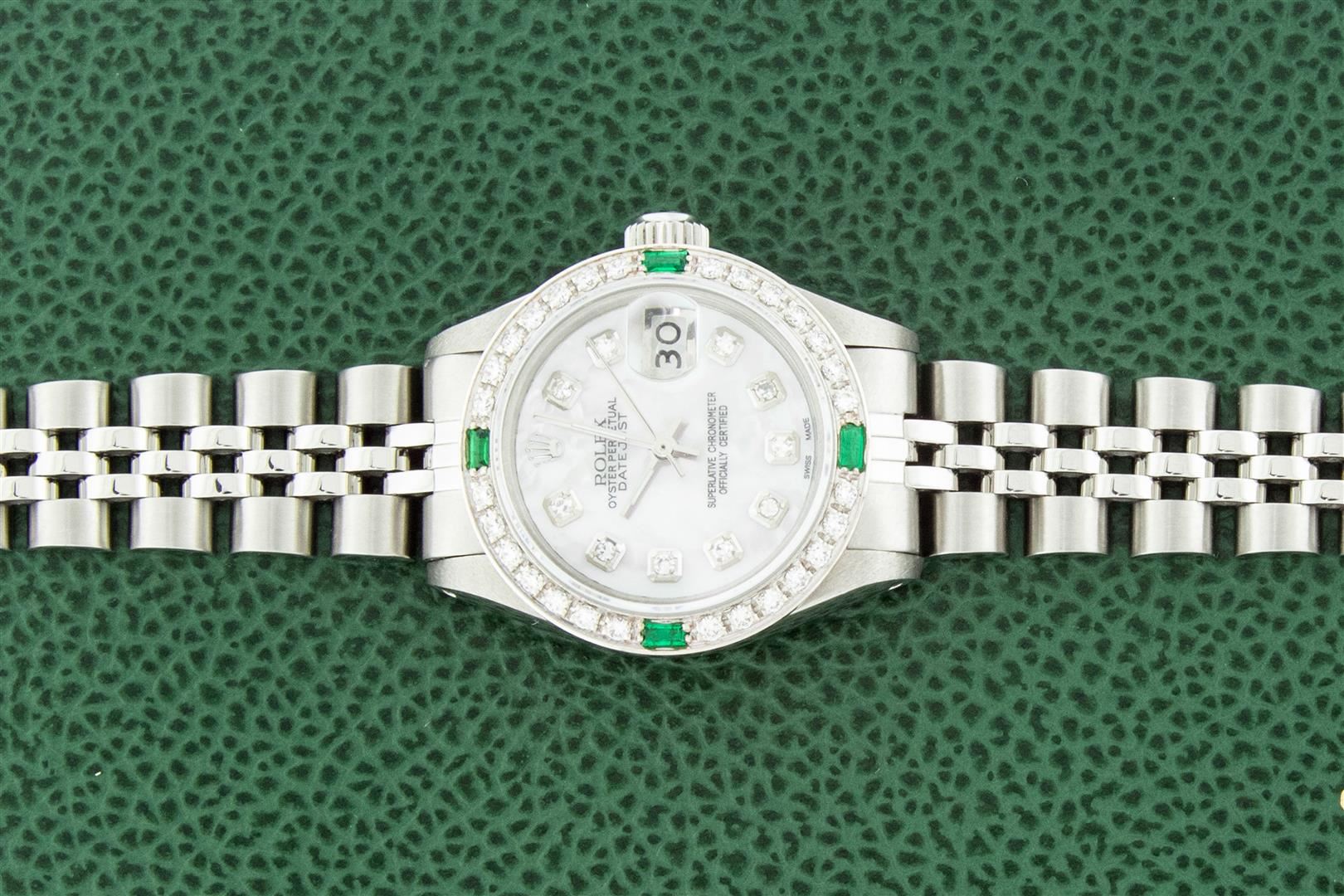 One Ladies Stainless Steel Rolex Datejust Polished Bright with Satin Finish, Serviced & Electronically Tested, Rolex Stainless Steel Case: 26mm, Rolex Stainless Steel Crown, Custom Bezel: New 18K White Gold Emerald Beadset Diamond Bezel, Diamond + Gem Count: 28 Diamonds + 4 Emeralds. Total Weight .70 Carat, Clarity: SI-VS, Color: G to H. Custom Crystal: New Sapphire With Magnified Date Window. Custom Hands: New Luminescent Hands. Rolex Movement: Automatic Winding Movement. Custom Dial: Mother Of Pearl With Diamond Hour Markers, 10 Diamond in Dial G To H In Color, Clarity: SI-VS. Date Window: 3 O'clock Position Date Display, Model: Datejust. Condition: G-6 Extra Fine. Rolex Bracelet: Stainless Steel Jubilee Band. Bright Polish & Satin Finish. 6.0 Inch Length, Adjustable. Standard Clasp, With Rolex Logo. This Pre Owned Watch Has Been Serviced Time Tested And Is In Excellent Condition It Is Free Of All Scratches And Dents. This Watch Comes With A Rolex Box.