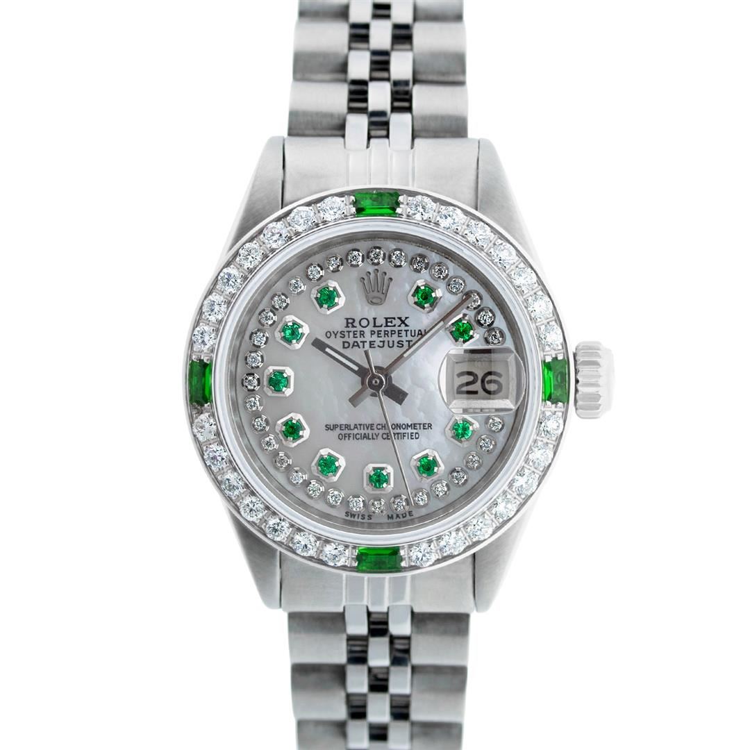 One Ladies Stainless Steel Rolex Datejust Polished Bright with Satin Finish, Serviced & Electronically Tested, Stainless Steel Case: 26mm, Stainless Steel Crown. Custom Bezel: New 18K White Gold Beadset & Emerald Diamond Bezel, Diamond Count: 28 Diamonds + 4 Synthetic Emeralds. Total Weight .70 Carat, Clarity: SI-VS, Color: G to H. Custom Crystal: New Synthetic Sapphire Cyclops Lens. Custom Hands: New Luminescent Hands. Movement: Automatic Winding Movement . Custom Dial: Refinished Mother Of Pearl Emerald String Diamond Dial, Stone Count: 10 Diamonds + 33 Diamonds In Dial, G To H In Color, Clarity: SI-VS. Date Window: 3 O'Clock Position Date Display, Model: Datejust. Condition: G-6 Extra Fine. Bracelet: Stainless Steel Jubilee. Bright Polish & Satin Finish. 6.0 Inch Length, Adjustable. Standard Clasp, With Rolex Logo. This Watch Has Been Serviced Time Tested And Is In Excellent Condition It Is Free Of All Scratches And Dents.