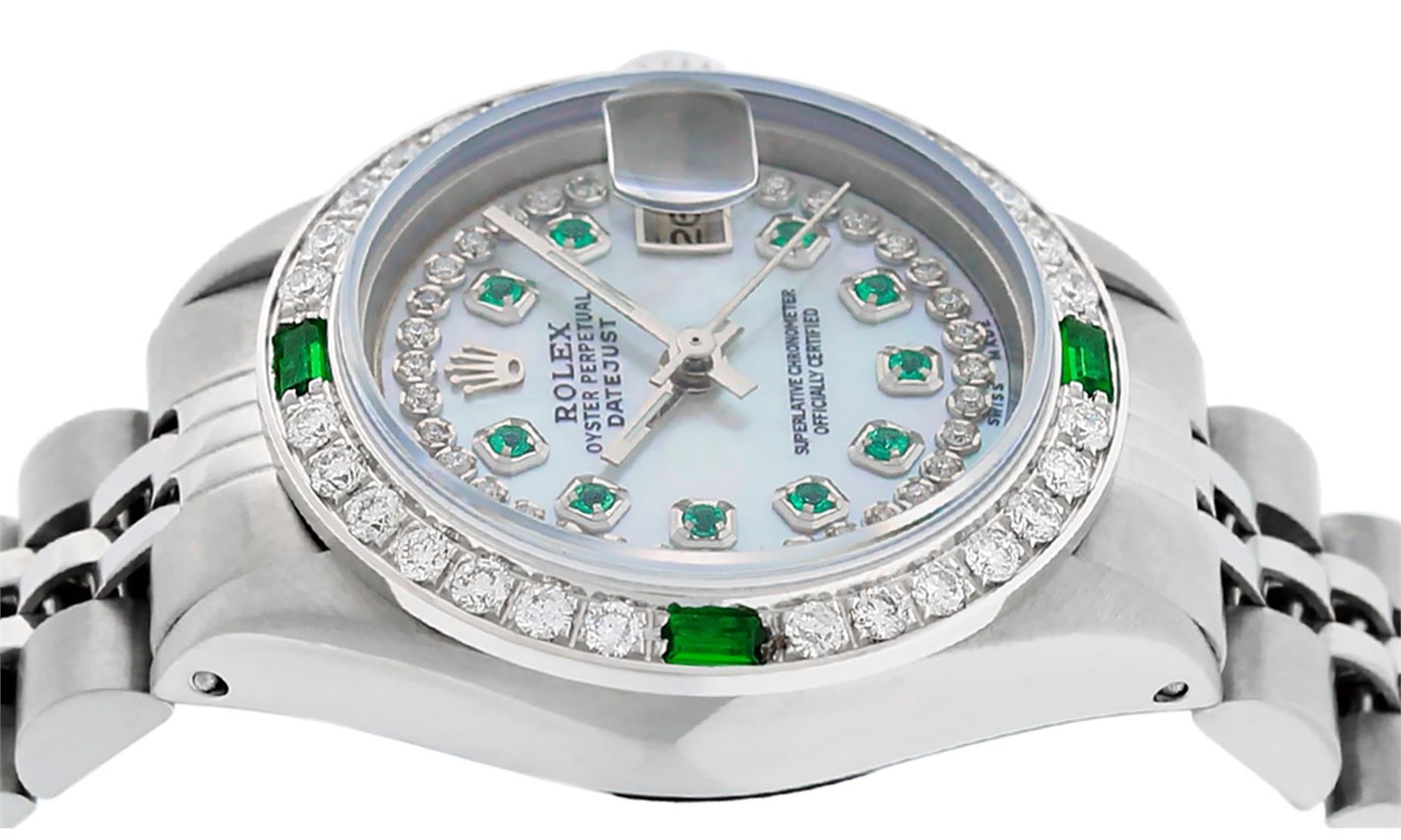 One Ladies Stainless Steel Rolex Datejust Polished Bright with Satin Finish, Serviced & Electronically Tested, Stainless Steel Case: 26mm, Stainless Steel Crown. Custom Bezel: New 18K White Gold Beadset & Emerald Diamond Bezel, Diamond Count: 28 Diamonds + 4 Synthetic Emeralds. Total Weight .70 Carat, Clarity: SI-VS, Color: G to H. Custom Crystal: New Synthetic Sapphire Cyclops Lens. Custom Hands: New Luminescent Hands. Movement: Automatic Winding Movement . Custom Dial: Refinished Mother Of Pearl Emerald String Diamond Dial, Stone Count: 10 Diamonds + 33 Diamonds In Dial, G To H In Color, Clarity: SI-VS. Date Window: 3 O'Clock Position Date Display, Model: Datejust. Condition: G-6 Extra Fine. Bracelet: Stainless Steel Jubilee. Bright Polish & Satin Finish. 6.0 Inch Length, Adjustable. Standard Clasp, With Rolex Logo. This Watch Has Been Serviced Time Tested And Is In Excellent Condition It Is Free Of All Scratches And Dents.