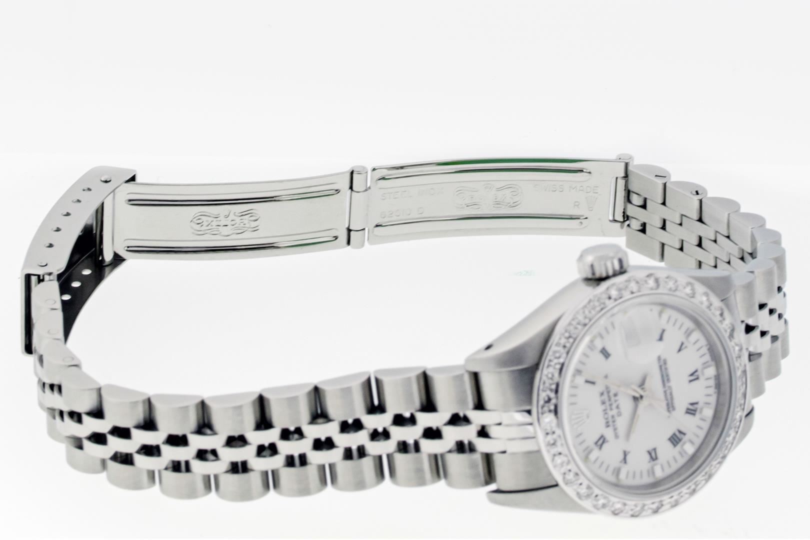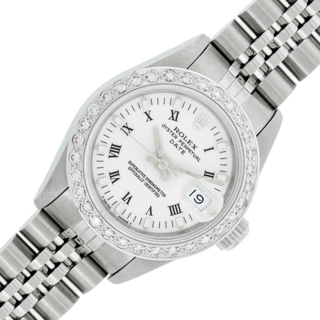 One Ladies Pre Owned Stainless Steel Rolex Datejust Polished Bright with Satin Finish, Serviced & Electronically Tested, Stainless Steel Case: 26mm, Stainless Steel Crown, Custom Bezel: New 18K White Gold Beadset Diamond Bezel, Diamond Count: 32 Diamonds, Total Weight .70 Carat, Clarity: SI-VS, Color: G to H. Custom Crystal: New Sapphire With Magnified Date Window. Custom Hands: New Luminescent Hands. Rolex Movement: Automatic Winding Movement. Rolex Dial: Factory White Roman Dial With Index Hour Markers And Lumi Dots. Date Window: 3 O'Clock Position Date Display, Model: Datejust. Condition: G-6 Extra Fine. Rolex Bracelet: Stainless Steel Jubilee Band. Bright Polish & Satin Finish. 6.0 Inch Length, Adjustable. Standard Clasp, With Rolex Logo. This Watch Has Been Serviced Time Tested And Is In Excellent Condition It Is Free Of All Scratches And Dents. This Watch Comes With A Rolex Box, 2 Booklets, And A Red Leather Wallet.