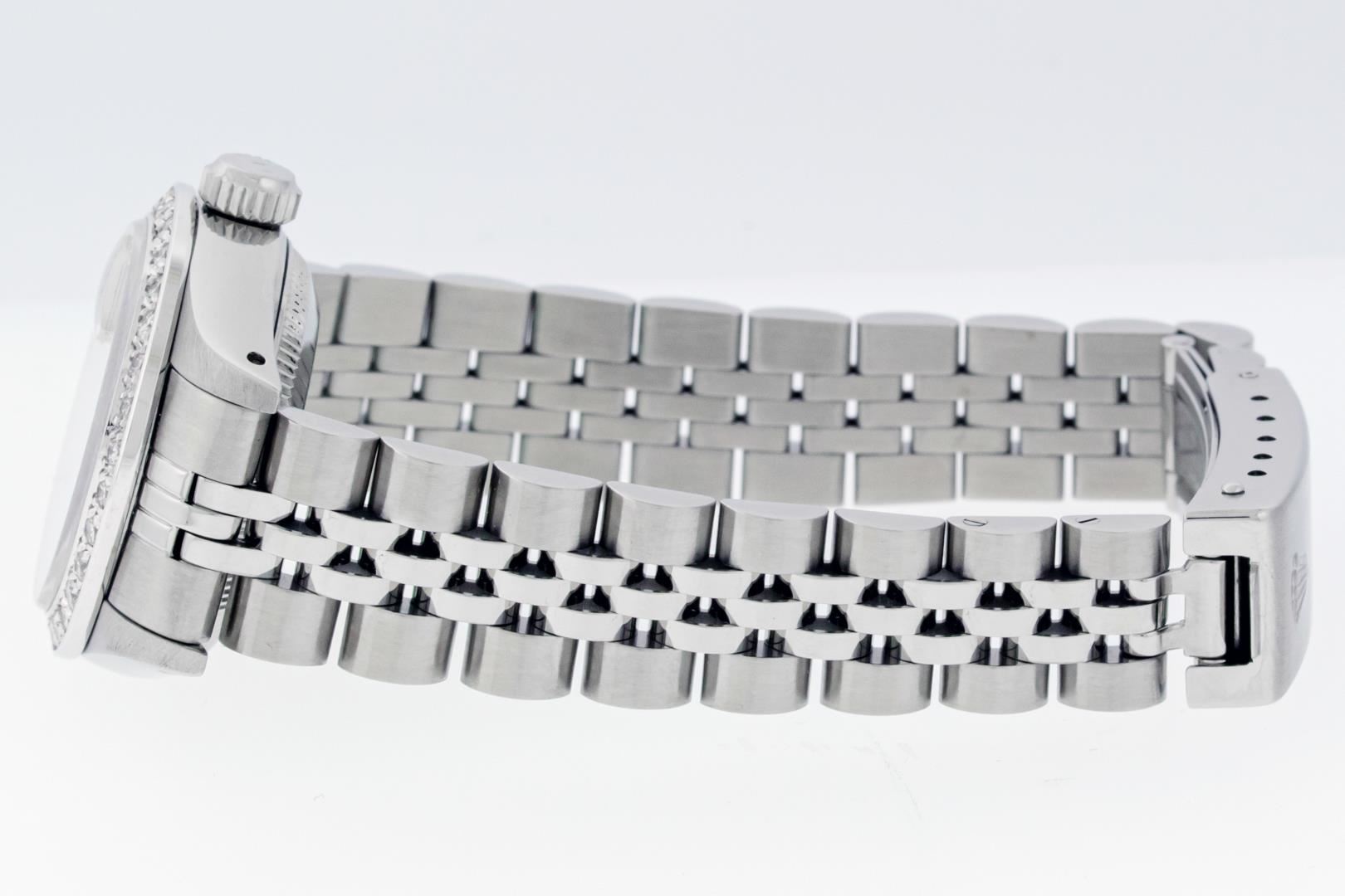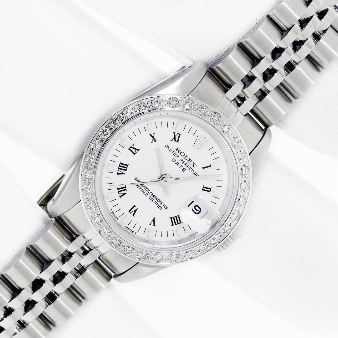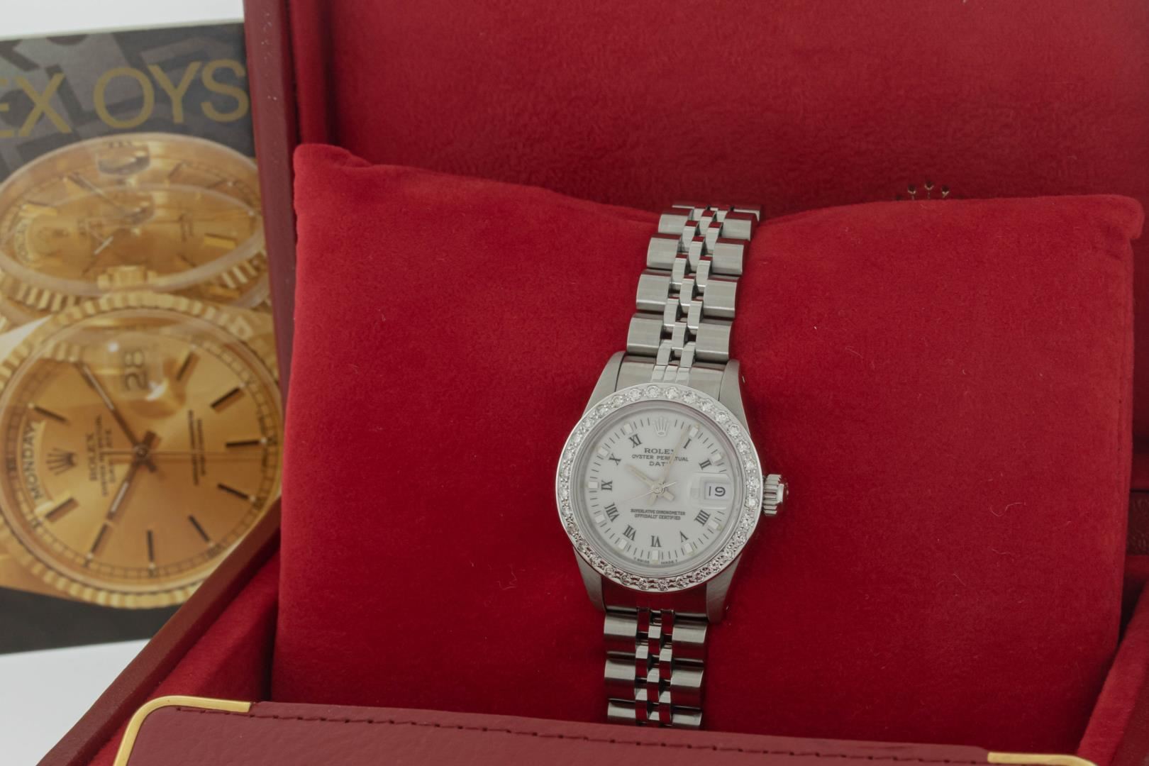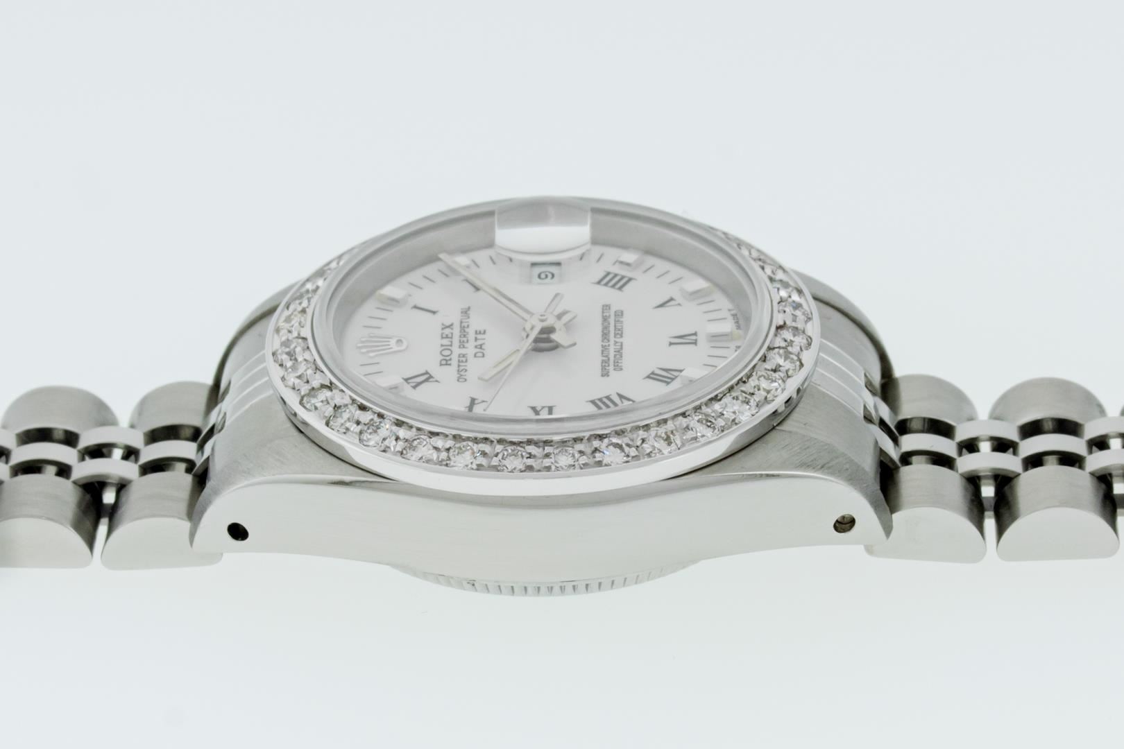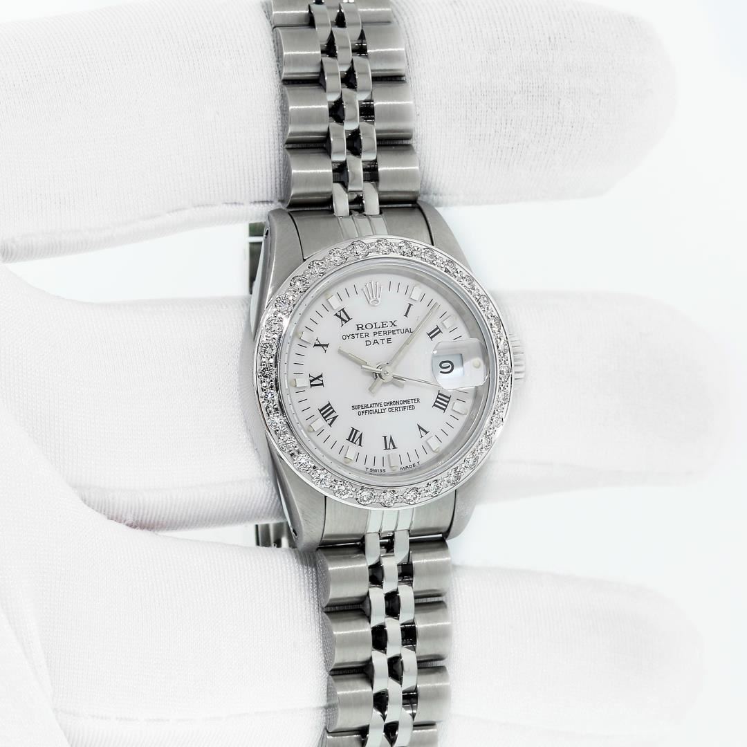 One Ladies Pre Owned Stainless Steel Rolex Datejust Polished Bright with Satin Finish, Serviced & Electronically Tested, Stainless Steel Case: 26mm, Stainless Steel Crown, Custom Bezel: New 18K White Gold Beadset Diamond Bezel, Diamond Count: 32 Diamonds, Total Weight .70 Carat, Clarity: SI-VS, Color: G to H. Custom Crystal: New Sapphire With Magnified Date Window. Custom Hands: New Luminescent Hands. Rolex Movement: Automatic Winding Movement. Rolex Dial: Factory White Roman Dial With Index Hour Markers And Lumi Dots. Date Window: 3 O'Clock Position Date Display, Model: Datejust. Condition: G-6 Extra Fine. Rolex Bracelet: Stainless Steel Jubilee Band. Bright Polish & Satin Finish. 6.0 Inch Length, Adjustable. Standard Clasp, With Rolex Logo. This Watch Has Been Serviced Time Tested And Is In Excellent Condition It Is Free Of All Scratches And Dents. This Watch Comes With A Rolex Box, 2 Booklets, And A Red Leather Wallet.