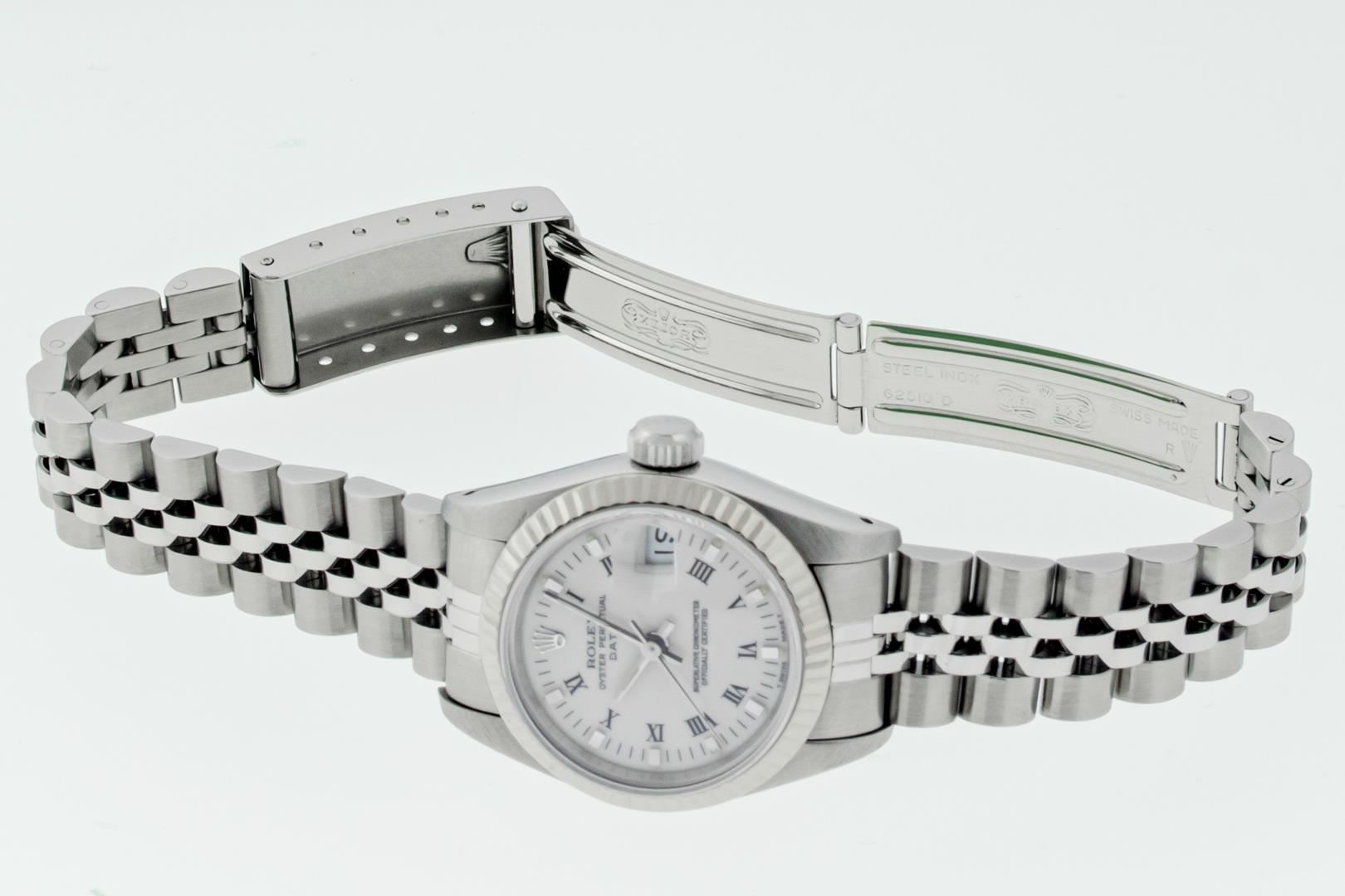 One Ladies Pre Owned Stainless Steel Rolex Polished Bright with Satin Finish, Serviced & Electronically Tested, Stainless Steel Case: 26mm, Stainless Steel Crown, Rolex Bezel: 14K White Gold Fluted Bezel, Custom Crystal: New With Magnifying Date Window. Hands: Luminescent Hands. Rolex Movement: Automatic Winding Movement. Rolex Dial: Factory White Roman Dial With Index Hour Markers And Lumi Dots. Date Window: 3 O'Clock Position Date Display, Model: Datejust. Condition: G-6 Extra Fine. Rolex Bracelet: Stainless Steel Jubilee Band. Bright Polish & Satin Finish. 6.0 Inch Length, Adjustable. Standard Clasp, With Rolex Logo. This Watch Has Been Serviced Time Tested And Is In Excellent Condition It Is Free Of All Scratches And Dents.