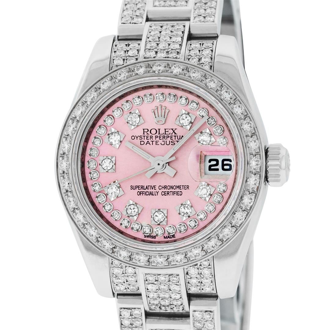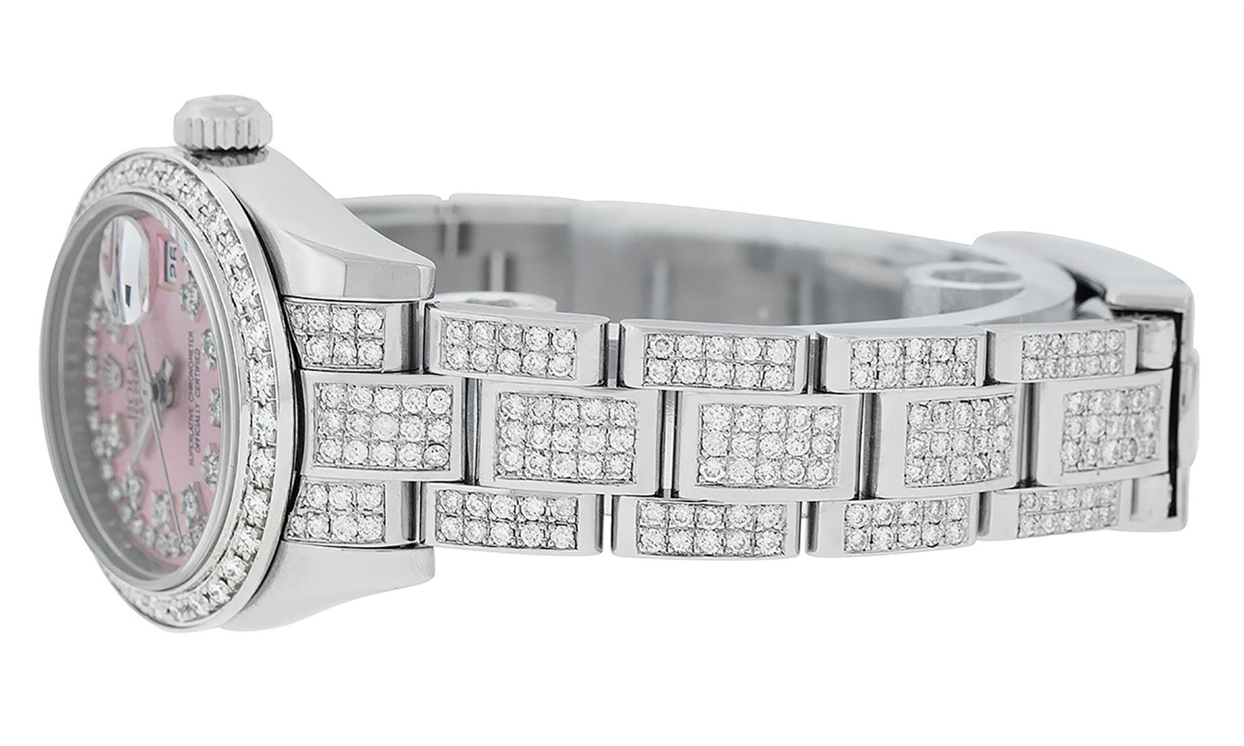 One Quickset Ladies Stainless Steel Rolex Datejust Polished Bright with Satin Finish, Serviced & Electronically Tested, Stainless Steel Case: 26mm, Stainless Steel Crown, Custom Bezel: New 18K White Gold Beadset Diamond Bezel, Stone Count: 32 Diamonds On Bezel, Total Bezel Weight .70 Carat, Clarity: SI-VS, Color: G to H. Custom Crystal: New Scratch Resistant Synthetic Sapphire Cyclops Lens. Custom Hands: New Luminescent Hands. Movement: Automatic Winding Movement Caliber 2235. Custom Dial: Refinished Pink Single Cut Diamond Dial, Stone Count: 43 Diamonds On Dial, G To H In Color, Clarity: VS. Date Window: 3 O'Clock Position Date Display, Model: 179160 Quickset Datejust. Condition: G-6 Extra Fine. Bracelet: Stainless Steel Oyster Band With Custom Added Diamonds On Band, Band Diamond Carat Weight: 4.10ctw, Color: G to H, Clarity: SI-VS2, Bright Polish & Satin Finish. 6.0 Inch Length, Adjustable. Standard Clasp, With Rolex Logo. This Watch Has Been Serviced Time Tested And Is In Excellent Condition It Is Free Of All Scratches And Dents. This Watch Comes With A Rolex Box.