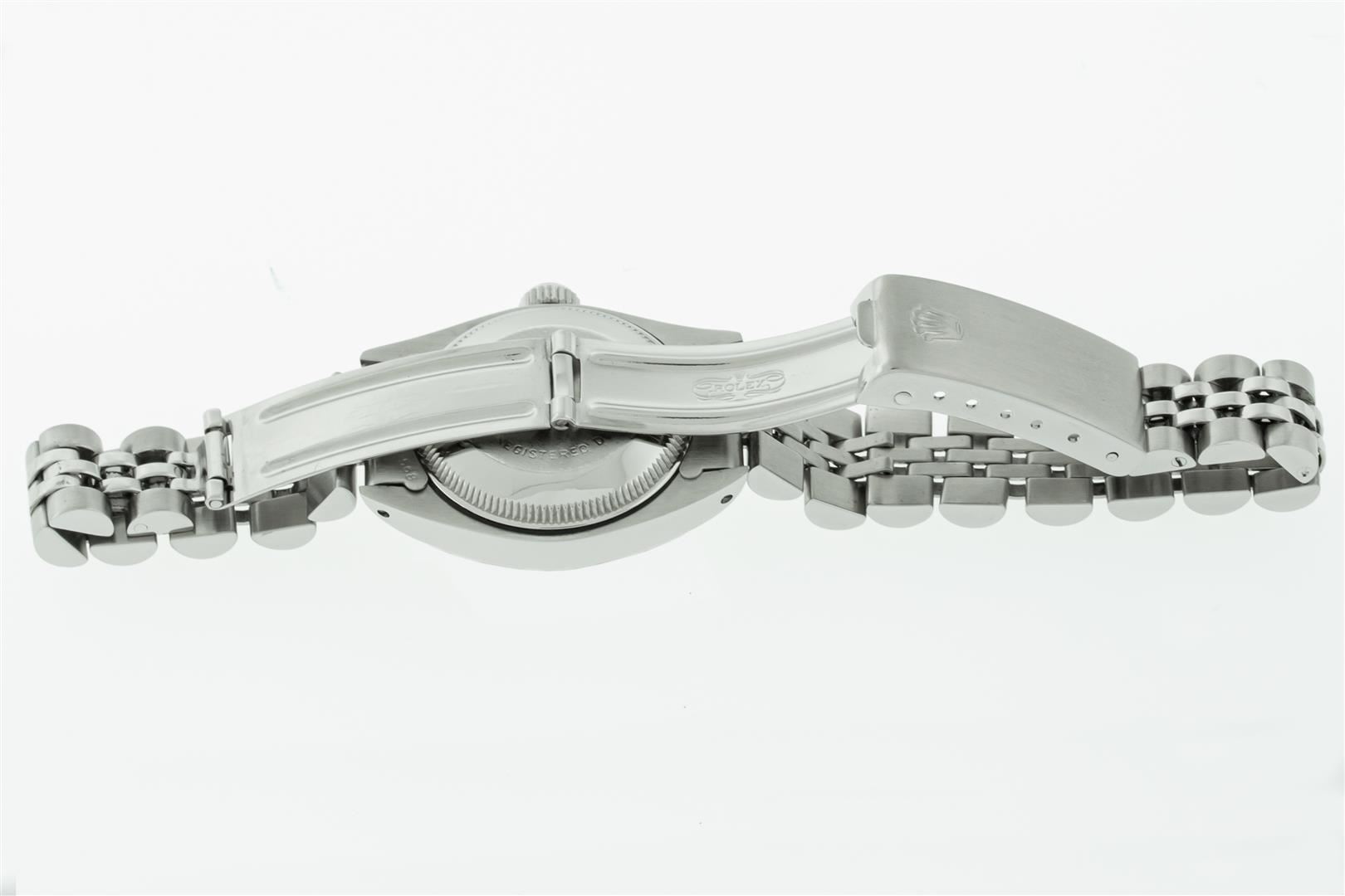 One Ladies Pre Owned Stainless Steel Rolex Datejust Polished Bright with Satin Finish, Serviced & Electronically Tested, Rolex Stainless Steel Case: 26mm, Rolex Stainless Steel Crown, Rolex Bezel: 14K White Gold Bezel. Custom Crystal: New Acrylic Cyclops Lens. Custom Hands: New Luminescent Hands. Rolex Movement: Automatic Winding Movement. Custom Dial: Refinished To Pink With Custom Added Diamonds, Diamond Count: 10 Diamonds In Dial, Color: G to H, Clarity: SI-VS. Date Window: 3 O'Clock Position Date Display, Model: Datejust. Condition: G-6 Extra Fine. Rolex Bracelet: Stainless Steel Jubilee Band. Bright Polish & Satin Finish. 6.0 Inch Length, Adjustable. Standard Clasp, With Rolex Logo. This Watch Has Been Serviced Time Tested And Is In Excellent Condition It Is Free Of All Scratches And Dents.