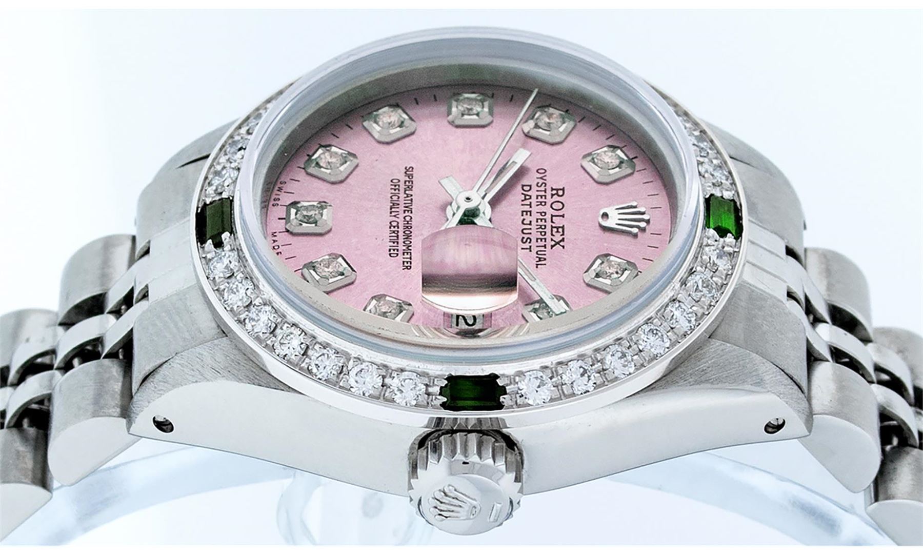 One Ladies Stainless Steel Rolex Datejust Polished Bright with Satin Finish, Serviced & Electronically Tested, Stainless Steel Case: 26mm, Stainless Steel Crown, Custom Bezel: New 18K White Gold Emerald Beadset Diamond Bezel, Diamond + Gem Count: 28 Diamonds + 4 Emeralds. Total Weight .70 Carat, Clarity: SI-VS, Color: G to H. Custom Crystal: New Scratch Resistant Synthetic Sapphire Cyclops Lens. Custom Hands: New Luminescent Hands. Movement: Automatic Winding Movement Caliber 2030. Custom Dial: Refinished Pink With Diamond Hour Markers & Dash Track, 10 Diamonds in Dial, G To H In Color, Clarity: SI-VS. Date Window: 3 O'Clock Position Date Display, Model: Datejust. Condition: G-6 Extra Fine. Bracelet: Stainless Steel Jubilee. Bright Polish & Satin Finish. 6.0 Inch Length, Adjustable. Standard Clasp, With Rolex Logo. This Watch Has Been Serviced Time Tested And Is In Excellent Condition It Is Free Of All Scratches And Dents.