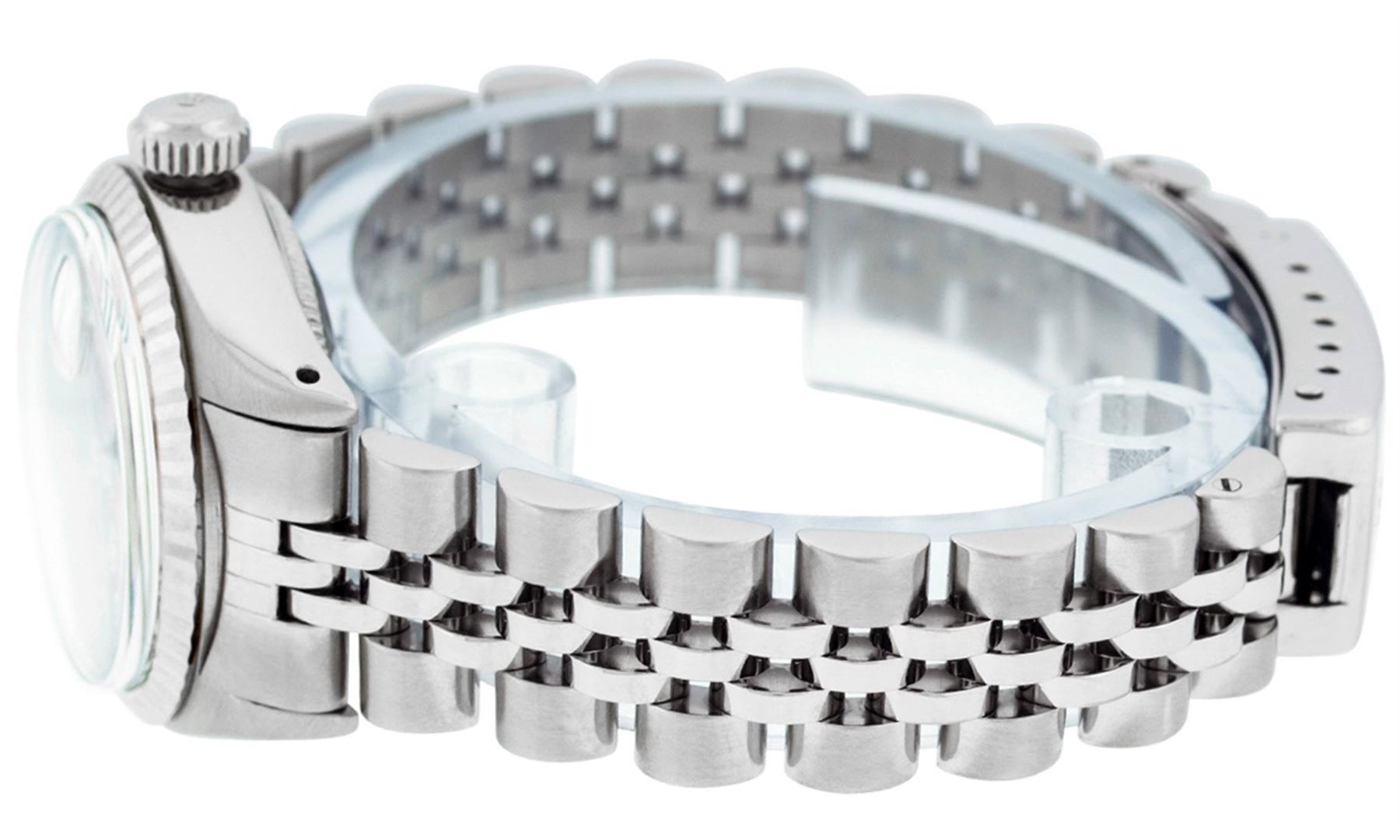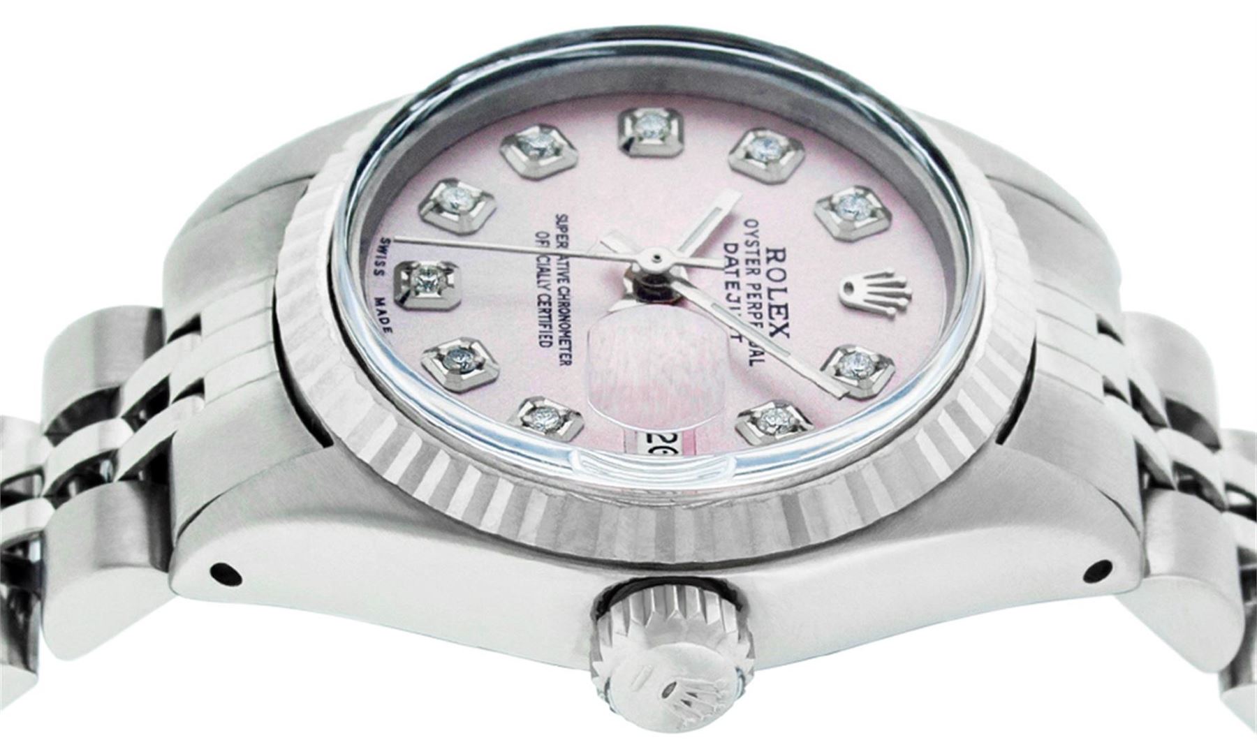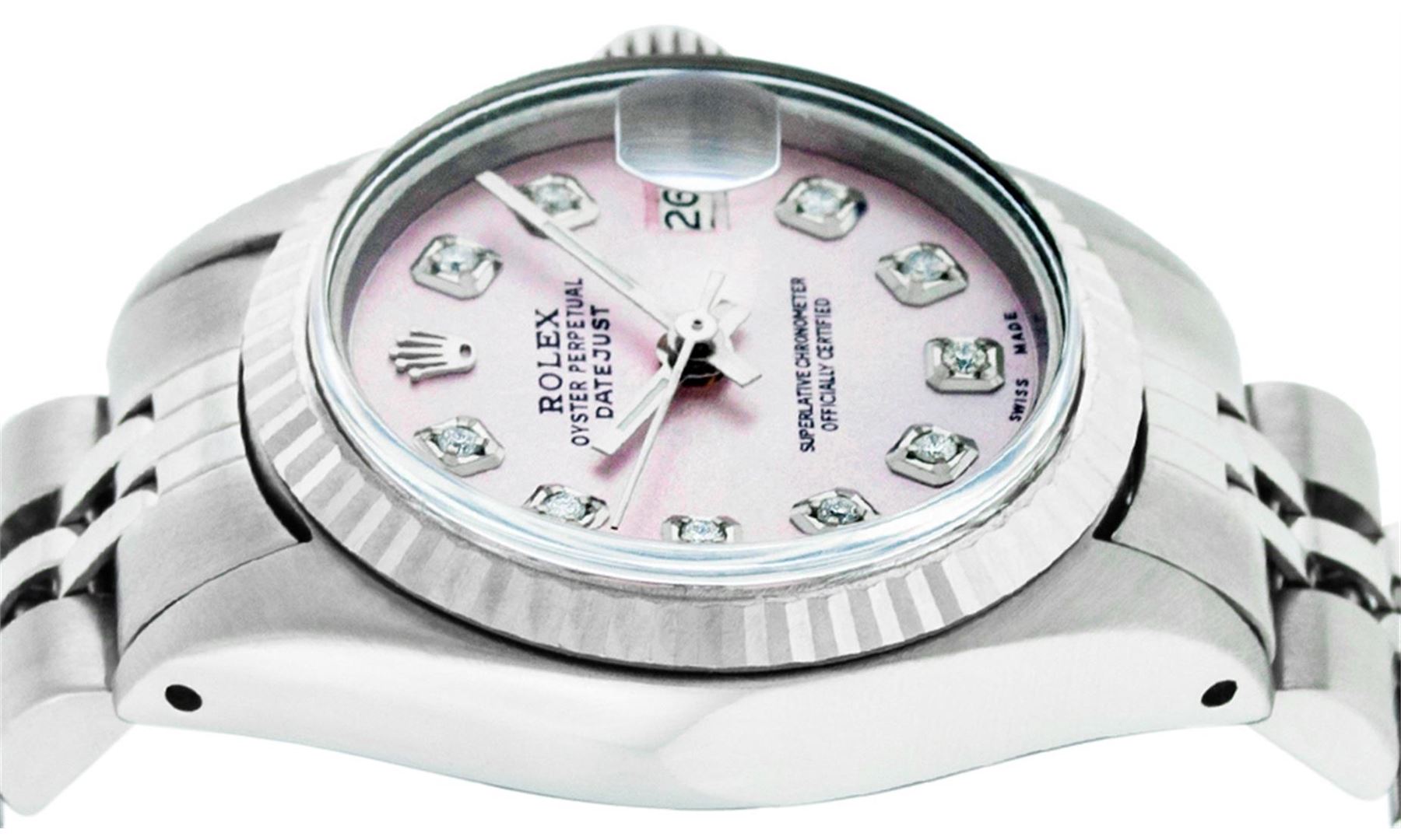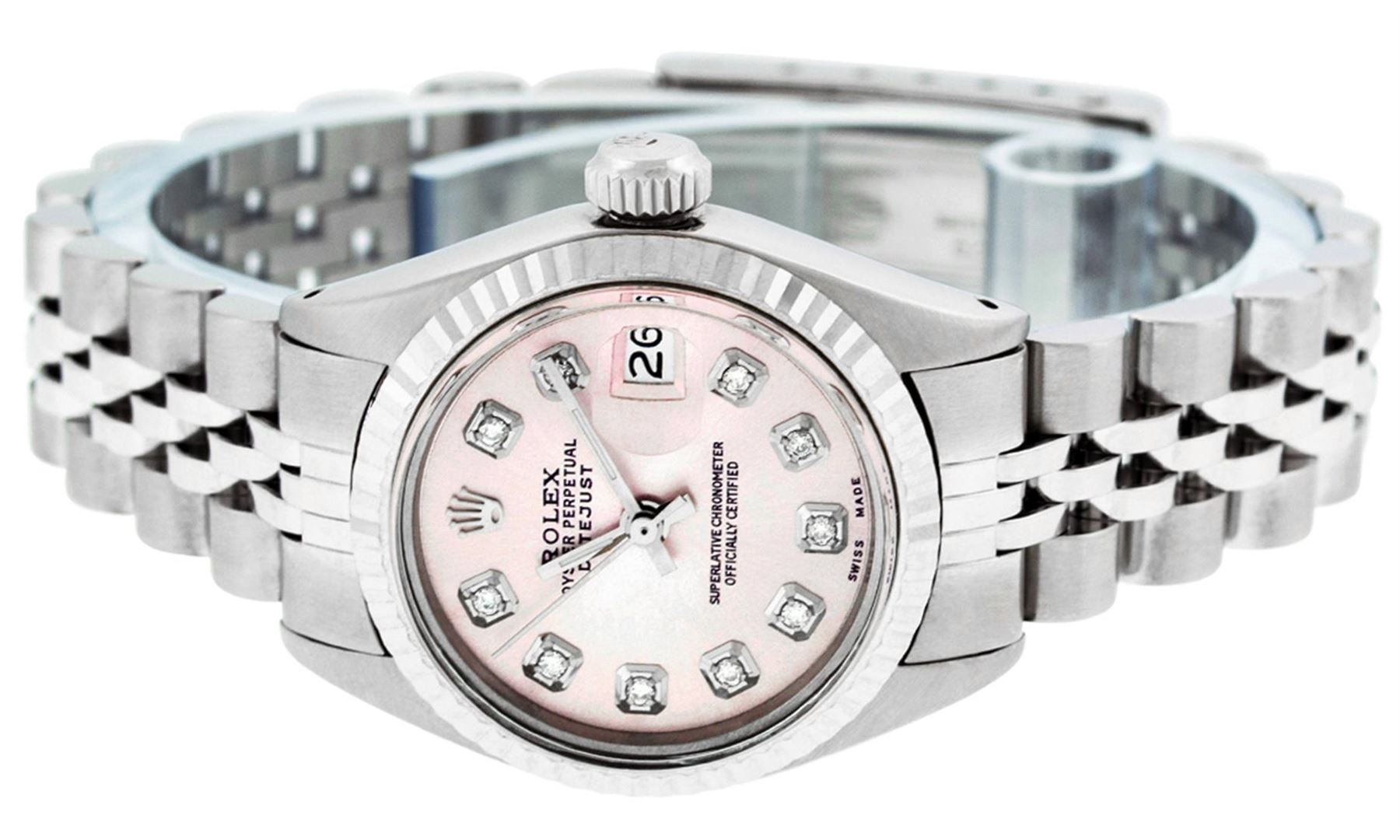 One Ladies Pre Owned Stainless Steel Rolex Datejust Polished Bright with Satin Finish, Serviced & Electronically Tested, Rolex Stainless Steel Case: 26mm, Rolex Stainless Steel Crown, Rolex Bezel: 14K White Gold Bezel. Custom Crystal: New Acrylic Cyclops Lens. Custom Hands: New Luminescent Hands. Rolex Movement: Automatic Winding Movement. Custom Dial: Pink Diamond Dial, Diamond Count: 10 Diamonds In Dial, Color: G to H, Clarity: SI-VS. Date Window: 3 O'Clock Position Date Display, Model: Datejust. Condition: G-6 Extra Fine. Rolex Bracelet: Stainless Steel Jubilee Band. Bright Polish & Satin Finish. 6.0 Inch Length, Adjustable. Standard Clasp, With Rolex Logo. This Watch Has Been Serviced Time Tested And Is In Excellent Condition It Is Free Of All Scratches And Dents.