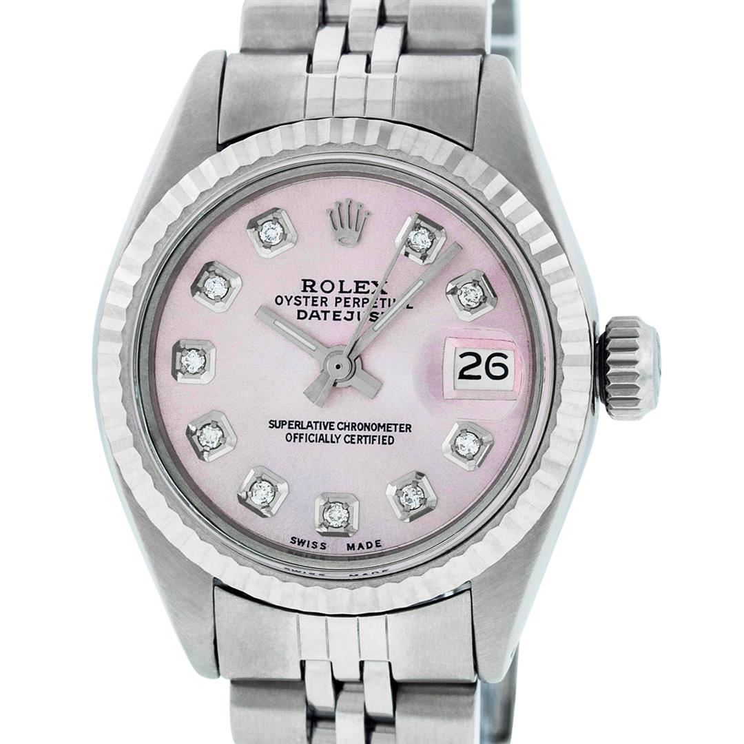 One Ladies Pre Owned Stainless Steel Rolex Datejust Polished Bright with Satin Finish, Serviced & Electronically Tested, Rolex Stainless Steel Case: 26mm, Rolex Stainless Steel Crown, Rolex Bezel: 14K White Gold Bezel. Custom Crystal: New Acrylic Cyclops Lens. Custom Hands: New Luminescent Hands. Rolex Movement: Automatic Winding Movement. Custom Dial: Pink Diamond Dial, Diamond Count: 10 Diamonds In Dial, Color: G to H, Clarity: SI-VS. Date Window: 3 O'Clock Position Date Display, Model: Datejust. Condition: G-6 Extra Fine. Rolex Bracelet: Stainless Steel Jubilee Band. Bright Polish & Satin Finish. 6.0 Inch Length, Adjustable. Standard Clasp, With Rolex Logo. This Watch Has Been Serviced Time Tested And Is In Excellent Condition It Is Free Of All Scratches And Dents.