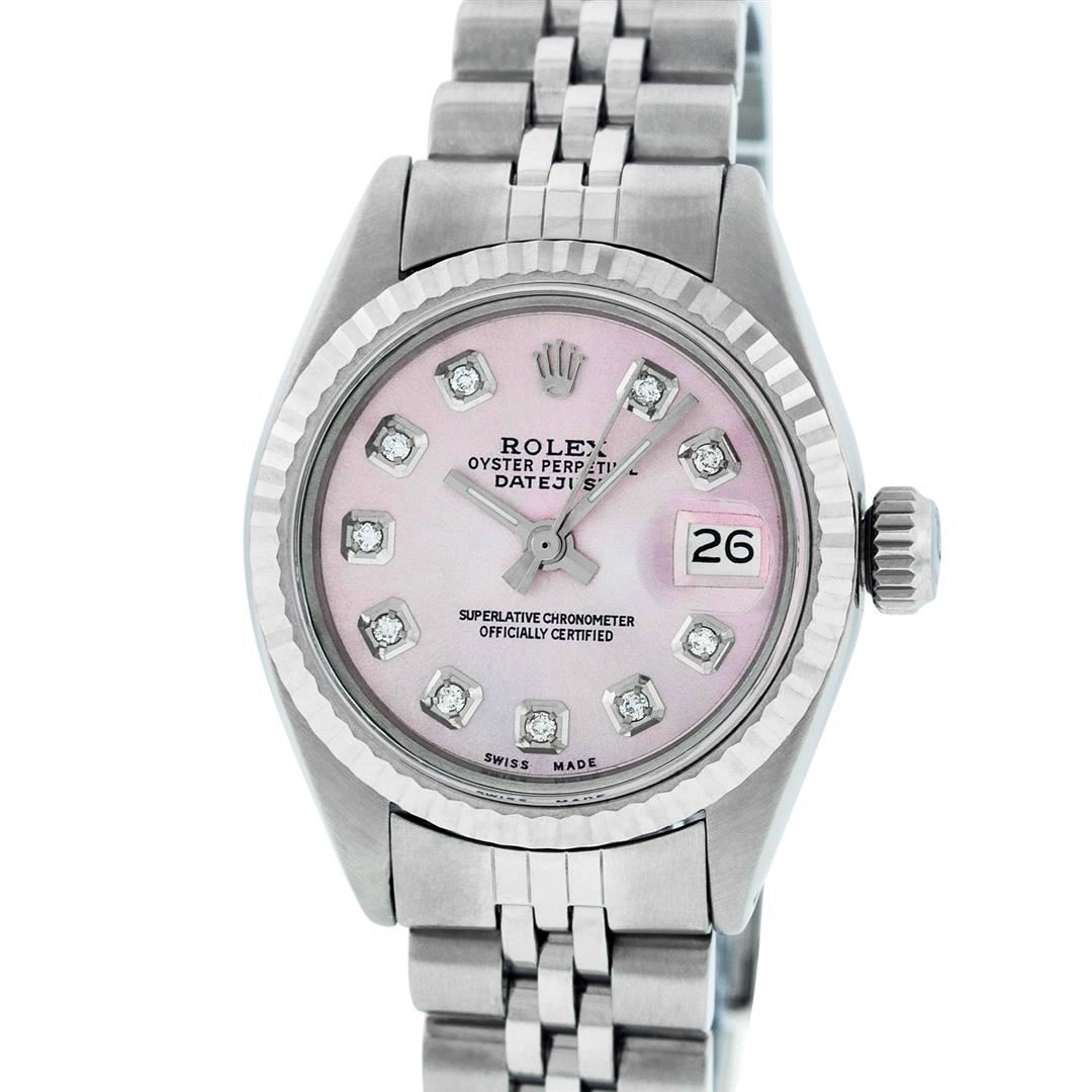 One Ladies Pre Owned Stainless Steel Rolex Datejust Polished Bright with Satin Finish, Serviced & Electronically Tested, Rolex Stainless Steel Case: 26mm, Rolex Stainless Steel Crown, Rolex Bezel: 14K White Gold Bezel. Custom Crystal: New Acrylic Cyclops Lens. Custom Hands: New Luminescent Hands. Rolex Movement: Automatic Winding Movement. Custom Dial: Pink Diamond Dial, Diamond Count: 10 Diamonds In Dial, Color: G to H, Clarity: SI-VS. Date Window: 3 O'Clock Position Date Display, Model: Datejust. Condition: G-6 Extra Fine. Rolex Bracelet: Stainless Steel Jubilee Band. Bright Polish & Satin Finish. 6.0 Inch Length, Adjustable. Standard Clasp, With Rolex Logo. This Watch Has Been Serviced Time Tested And Is In Excellent Condition It Is Free Of All Scratches And Dents.