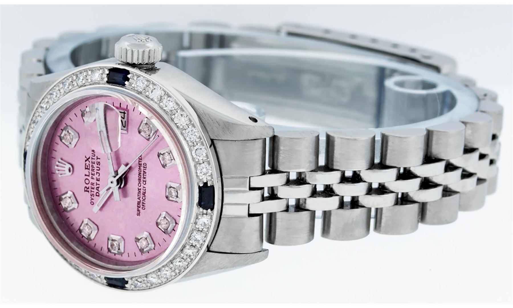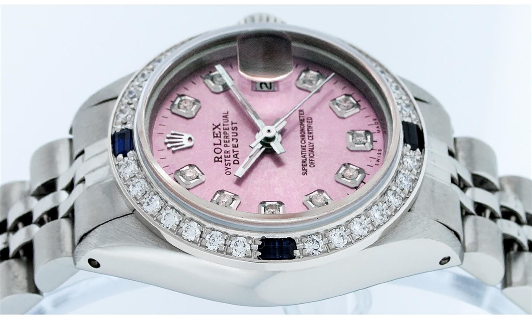 One Ladies Stainless Steel Rolex Datejust Polished Bright with Satin Finish, Serviced & Electronically Tested, Stainless Steel Case: 26mm, Stainless Steel Crown, Custom Bezel: New 18K White Gold Sapphire Beadset Diamond Bezel, Diamond + Gem Count: 28 Diamonds + 4 Sapphires. Total Weight .70 Carat, Clarity: SI-VS, Color: G to H. Custom Crystal: New Scratch Resistant Synthetic Sapphire Cyclops Lens. Custom Hands: New Luminescent Hands. Movement: Automatic Winding Movement Caliber 2030. Custom Dial: Refinished Pink With Diamond Hour Markers & Dash Tracks, 10 Diamonds in Dial, G To H In Color, Clarity: SI-VS. Date Window: 3 O'Clock Position Date Display, Model: Datejust. Condition: G-6 Extra Fine. Bracelet: Stainless Steel Jubilee. Bright Polish & Satin Finish. 6.0 Inch Length, Adjustable. Standard Clasp, With Rolex Logo. This Watch Has Been Serviced Time Tested And Is In Excellent Condition It Is Free Of All Scratches And Dents.