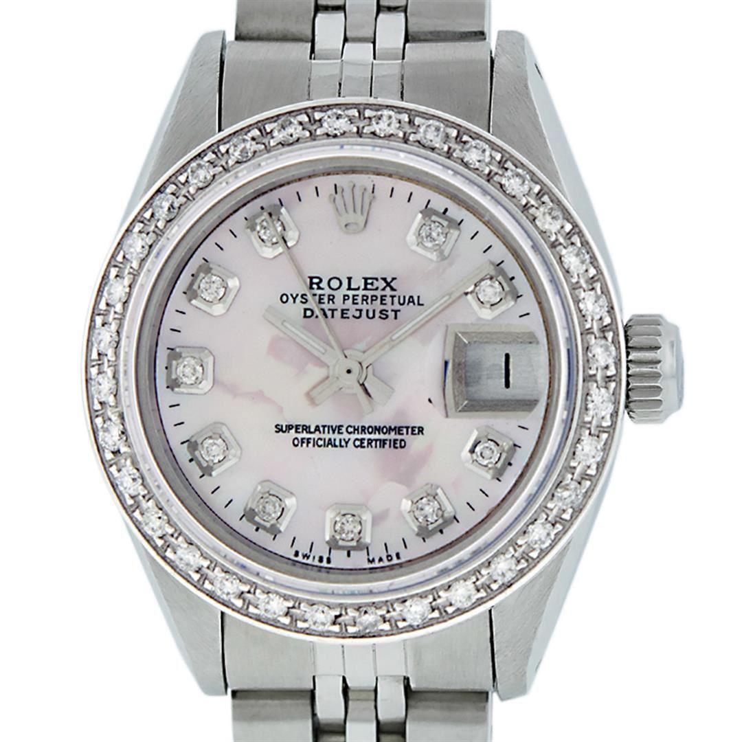 One Ladies Stainless Steel Rolex Datejust Polished Bright with Satin Finish, Serviced & Electronically Tested, Stainless Steel Case: 26mm, Stainless Steel Crown, Custom Bezel: New 18K White Gold Beadset Diamond Bezel, Diamond Count: 32 Diamonds, Total Weight .70 Carat, Clarity: SI-VS, Color: G to H. Custom Crystal: New Synthetic Sapphire Cyclops Lens. Custom Hands: New Luminescent Hands. Movement: Automatic Winding Movement Caliber 2030. Custom Dial: Pink Mother Of Pearl Diamond Dial, Diamond Count: 10 Diamonds In Dial, Color: G To H, Clarity: SI-VS. Date Window: 3 O'clock Position Date Display, Model: Datejust. Condition: G-6 Extra Fine. Bracelet: Stainless Steel Jubilee. Bright Polish & Satin Finish. 6.0 Inch Length, Adjustable. Standard Clasp, With Rolex Logo. This Watch Has Been Serviced Time Tested And Is In Excellent Condition It Is Free Of All Scratches And Dents.