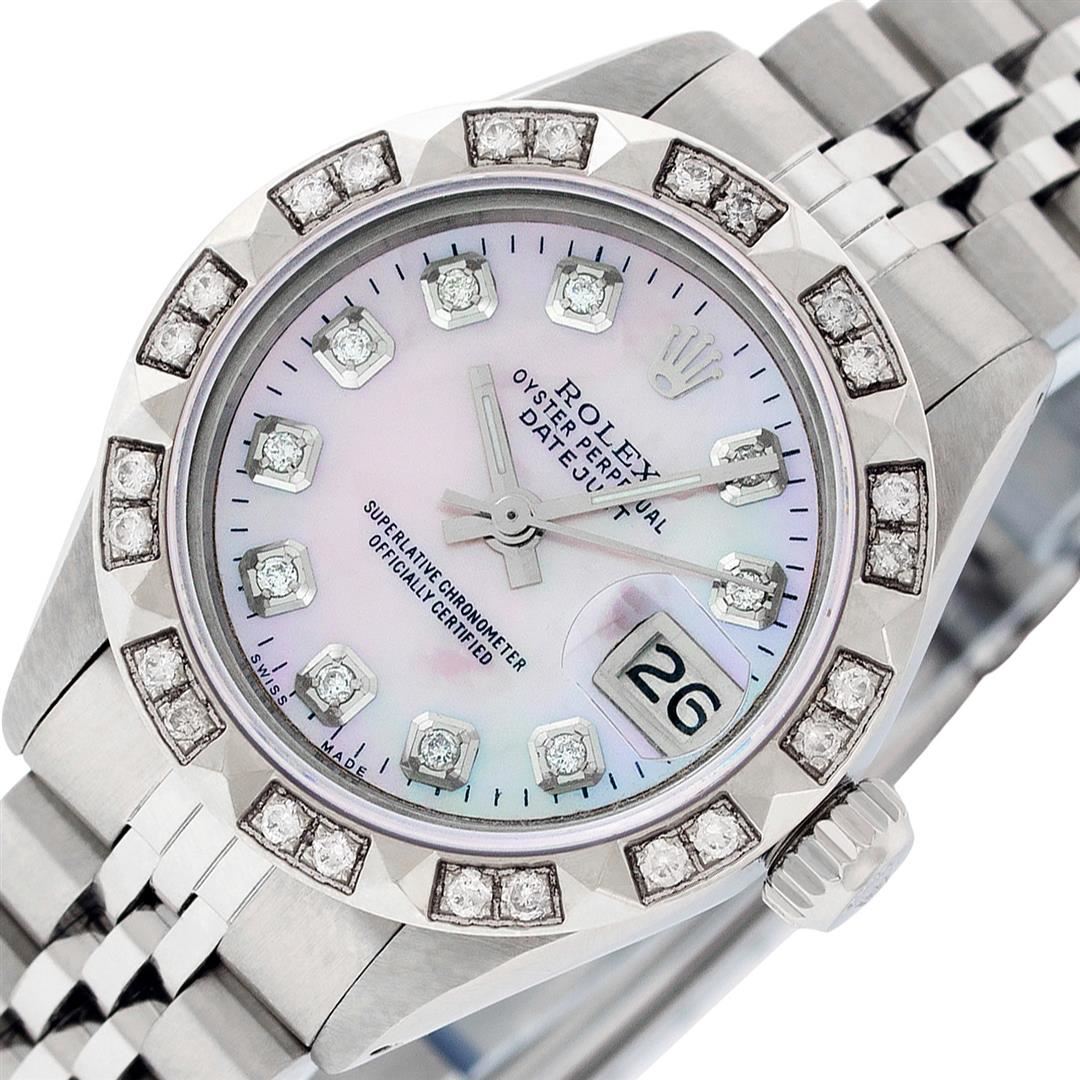 One Ladies Stainless Steel Rolex Datejust Polished Bright with Satin Finish, Serviced & Electronically Tested, Stainless Steel Case: 26mm, Stainless Steel Crown, Custom Bezel: New 18K White Gold Pyramid Diamond Bezel, Diamond Count: 24 Diamonds In Dial. Total Weight .50 Carat, Clarity: SI-VS, Color: G to H. Custom Crystal: New Scratch Resistant Synthetic Sapphire Cyclops Lens. Custom Hands: New Luminescent Hands. Movement: Automatic Winding Movement. Custom Dial: Light Pink Mother Of Pearl Diamond Dial. Diamond Count: 10 Diamonds In Dial. Clarity: SI-VS, Color: G to H. Date Window: 3 O'Clock Position Date Display, Model: Datejust. Condition: G-6 Extra Fine. Bracelet: Stainless Steel Jubilee Band With Rolex Crown On Buckle. Bright Polish & Satin Finish. Band Length: 6.0 Inch Length, Adjustable. Standard Clasp, With Rolex Logo. This Watch Has Been Serviced Time Tested And Is In Excellent Condition It Is Free Of All Scratches And Dents.
